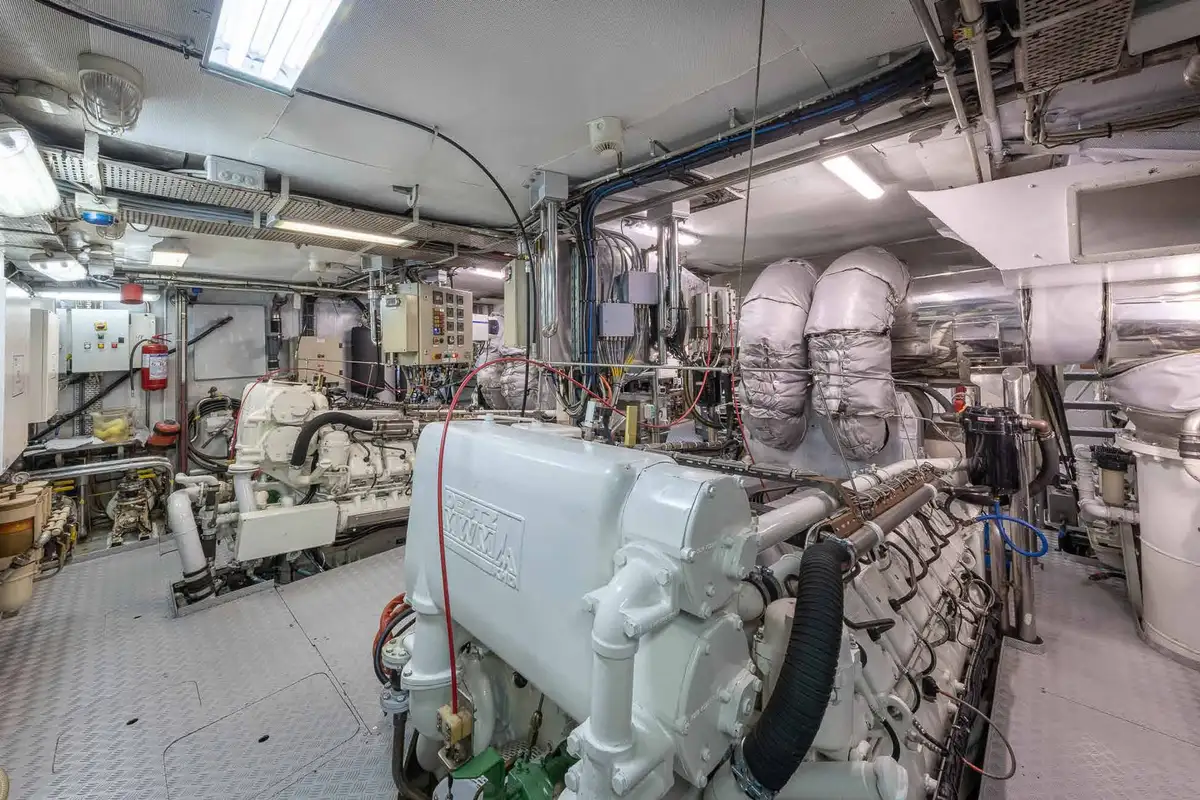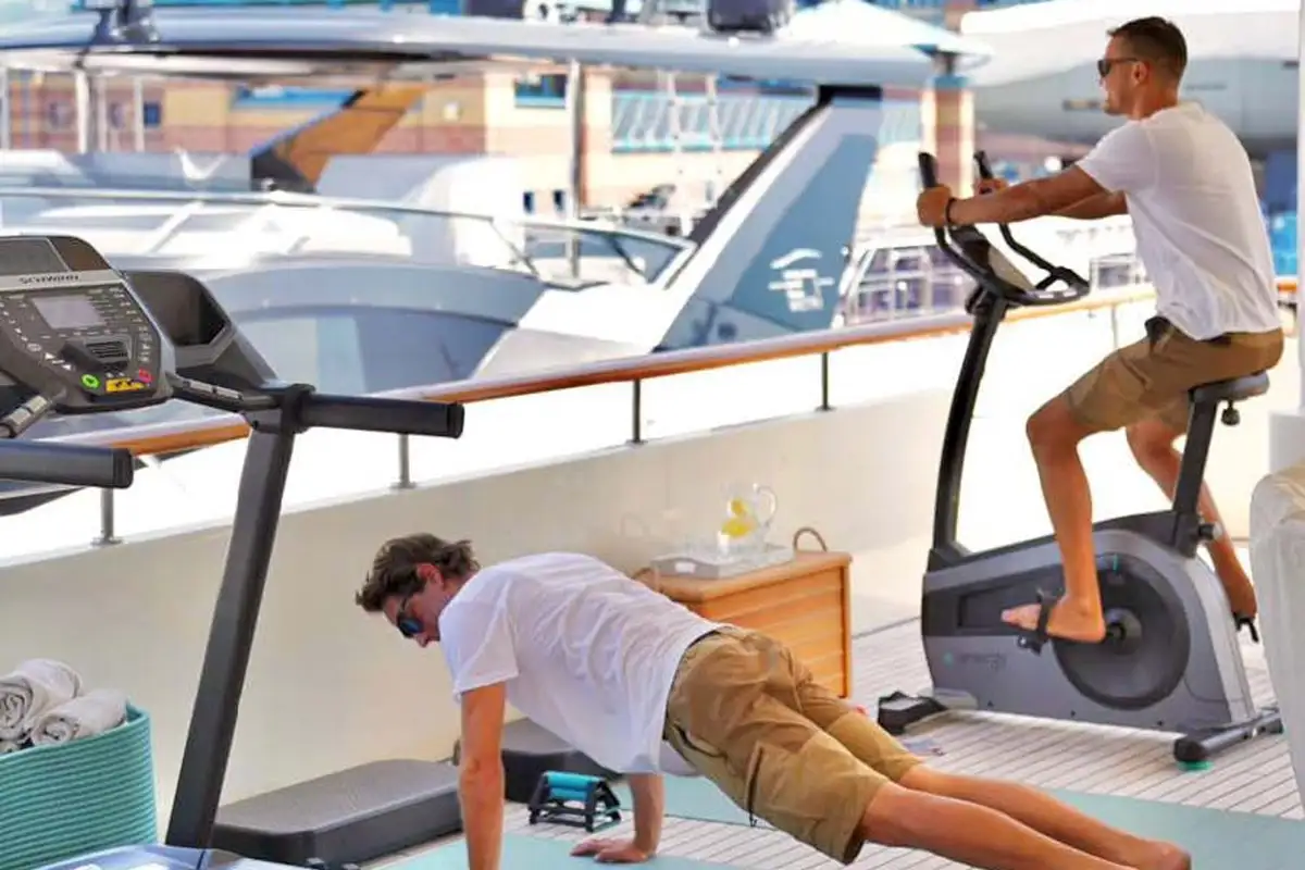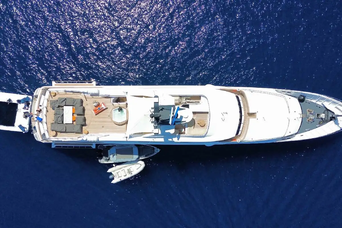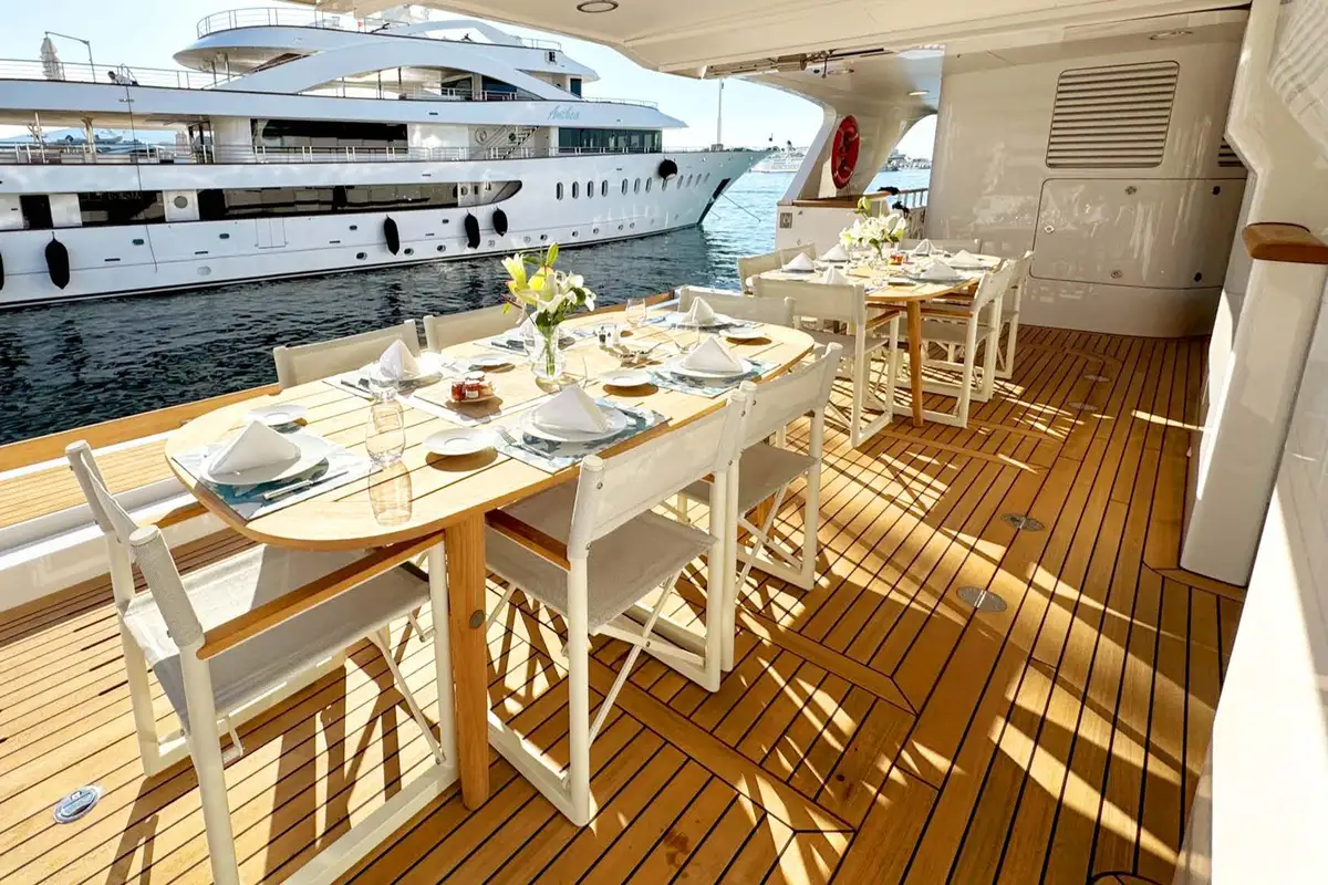 Her upper deck aft is a huge, versatile space with open-air dining, a sun lounge aft and exercise equipment forward as well as walkaround sidedecks. Underway her main deck aft is used for stowage of her two tenders, a Lombard Tender 650 Outboard (13 Pax) and aCastoldi JT21 lnboard (13 Pax). The starboard sidedeck leads forward to the lobby where there is a dayhead, port aft steps lead down to a swim platform and just inside the transom is a another dayhead.