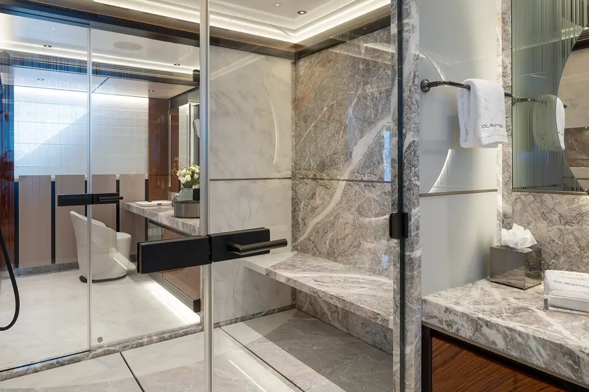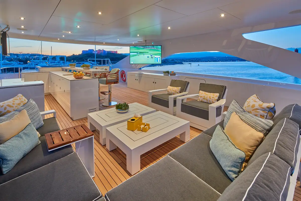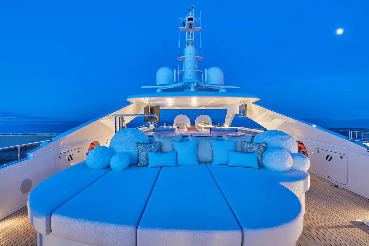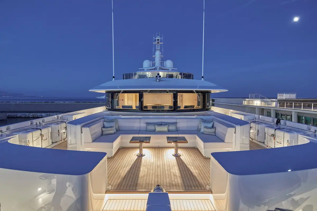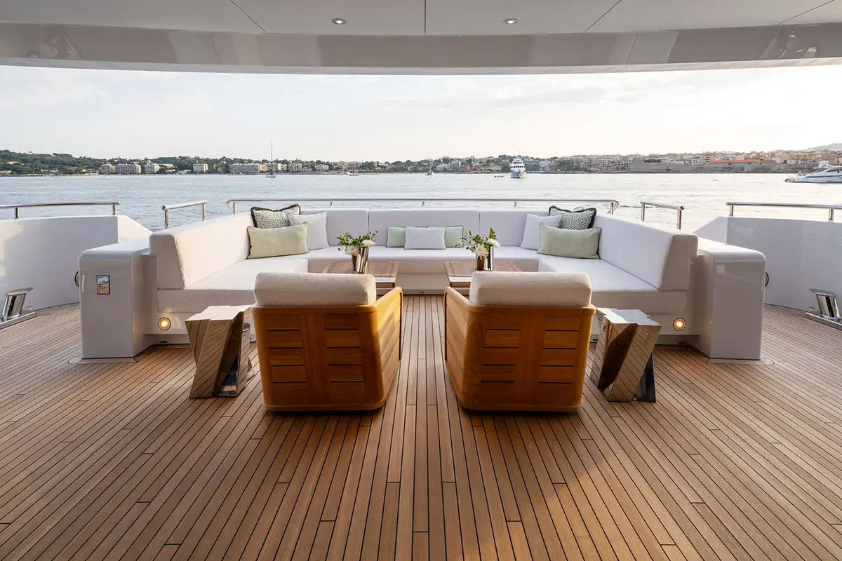 There’s a spacious sundeck up top with an eight-seater jacuzzi pool forward, encircled by sunpads; a dining area, bar and lounge seating amidships under the hardtop, and open space for sun loungers astern. The forward coachroof has a Portuguese bridge with open-air seating and steps down to the tender deck/foredeck. The upper aft cockpit is partially shaded with ample space for both a dining area and lounge seating. The aft cockpit on the main deck has U-shaped seating astern with steps leading down on both sides to a large bathing platform and top-opening transom door giving access to the beach club.