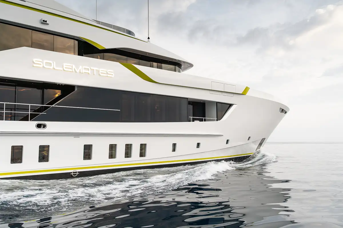 SOLEMATES is a 55-metre (180.5ft) tri-deck motor yacht by Heesen Yachts with exterior styling by Omega Architects and interiors by Luca Dini. Her naval architecture is by Omega Architects and she is constructed to Lloyd's classification with a fast displacement steel hull, bulbous bow, lightweight aluminium superstructure and laid teak decks.