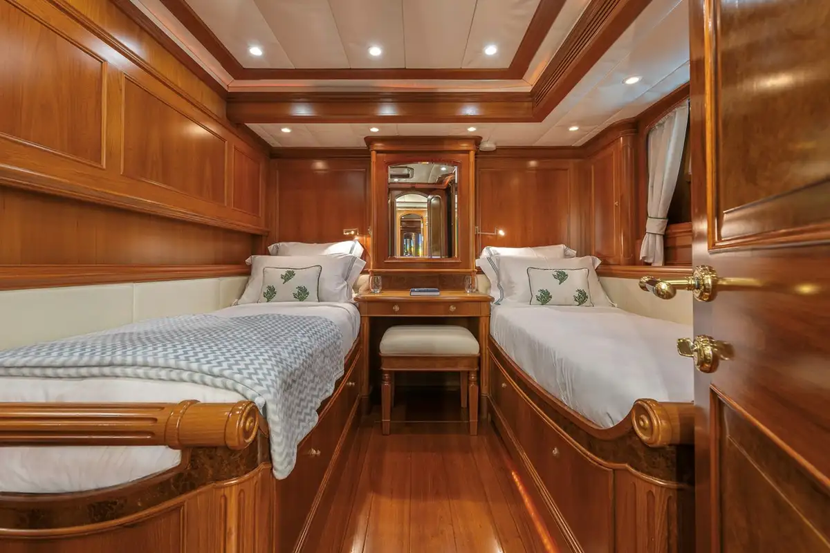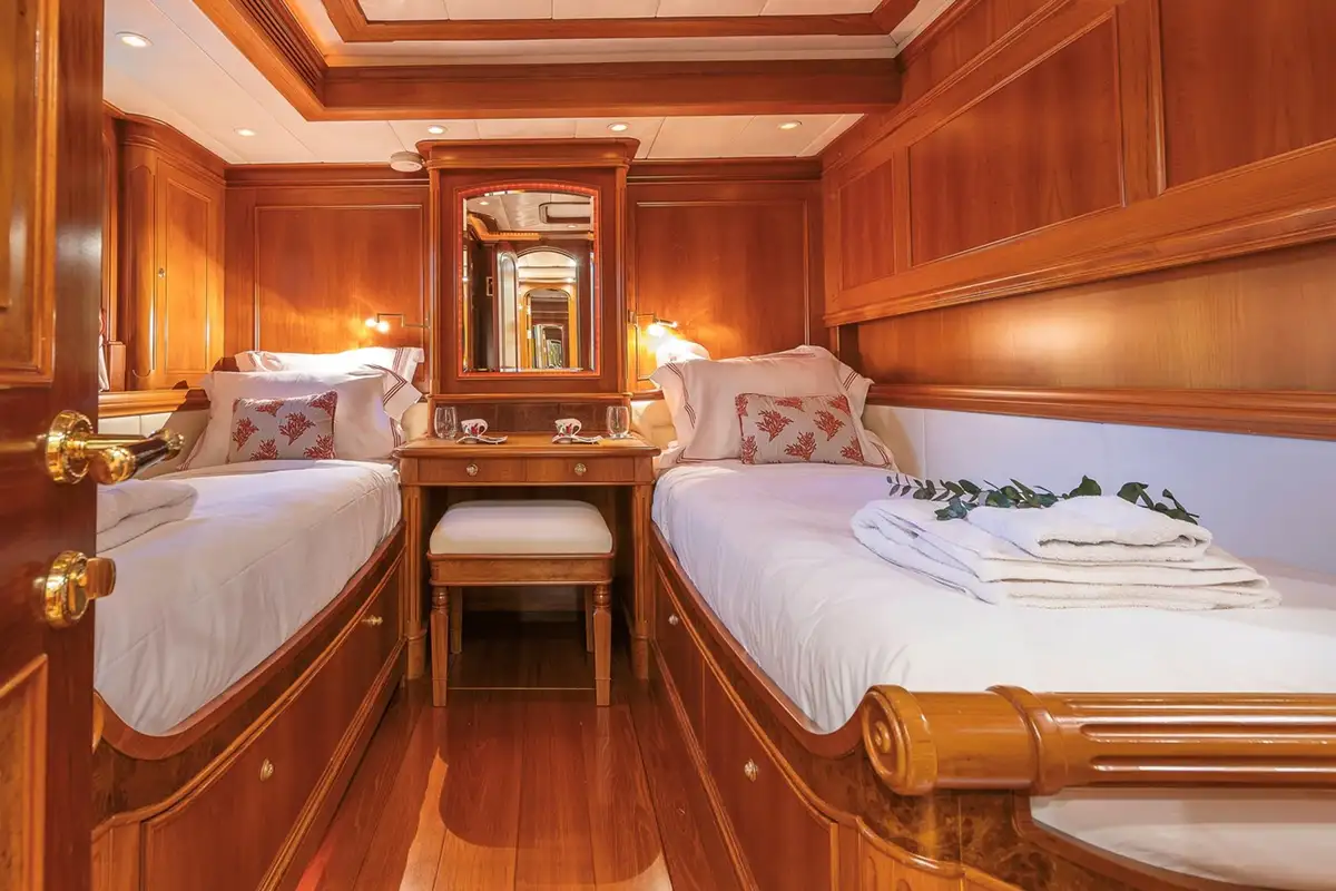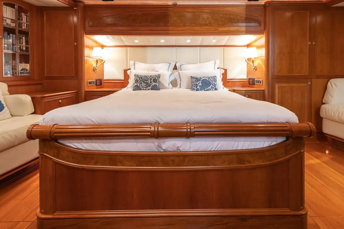Her classic interior is styled by Dick Young and designed to host up to eight guests in four cabins, with four crew. The deckhouse is her main saloon with bar, lounge and dining areas, plus an inside pilot station. The master suite is a full-beam cabin located aft on the lower deck with a forward-facing bed flanked by sofas on both sides, a study desk and en suite bathroom with teak and marble finish. She also has two twin-bed guest cabins with en suite bathrooms and extra Pullman bunks, also located aft, a single cabin forward of the deckhouse and crew’s quarters in the bow.
