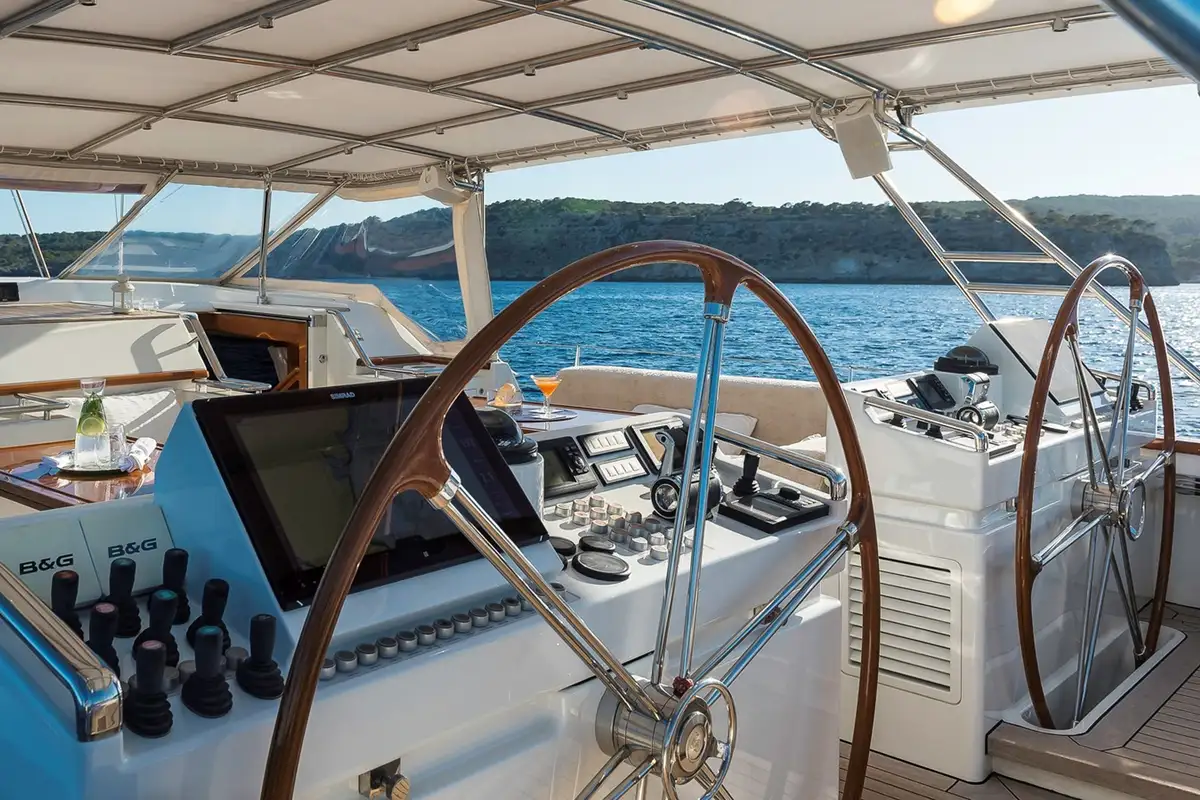 Her rig was fully serviced in 2015. The four-spreader mast and furling boom are built in pre-preg carbon fibre by Southern Spars and supported by solid rod Navtec rigging. She has hydraulic sailing controls powered by a ring system with four different power sources and joystick controls on her twin helm pedestals. The headsail is on a Reckmann RF-90 furler and the main halyard, mainsheet, jib sheets and runners are all on Rondal captive reel winches, mounted under the deck and in deck lockers. All running rigging was recently replaced and upgraded.