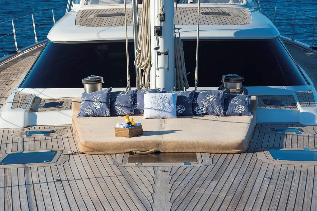 The deck plan includes a large sunpad on the foredeck, which is a vast and fully flush expanse of 5mm thick laid teak, and a secure passenger cockpit with secure, high coamings, two L-shaped built-in sofas around twin tables and ample shade. It’s partially separated from the twin-helm steering cockpit, which has full hydraulic sailing controls. There are another two sunpads on the aft deck and a garage for a large jet tender in her stern, which has a fold-out platform.