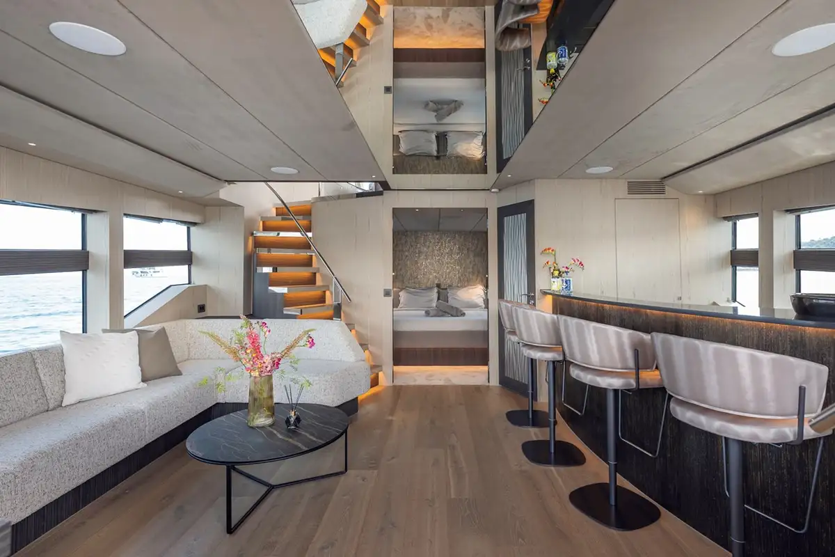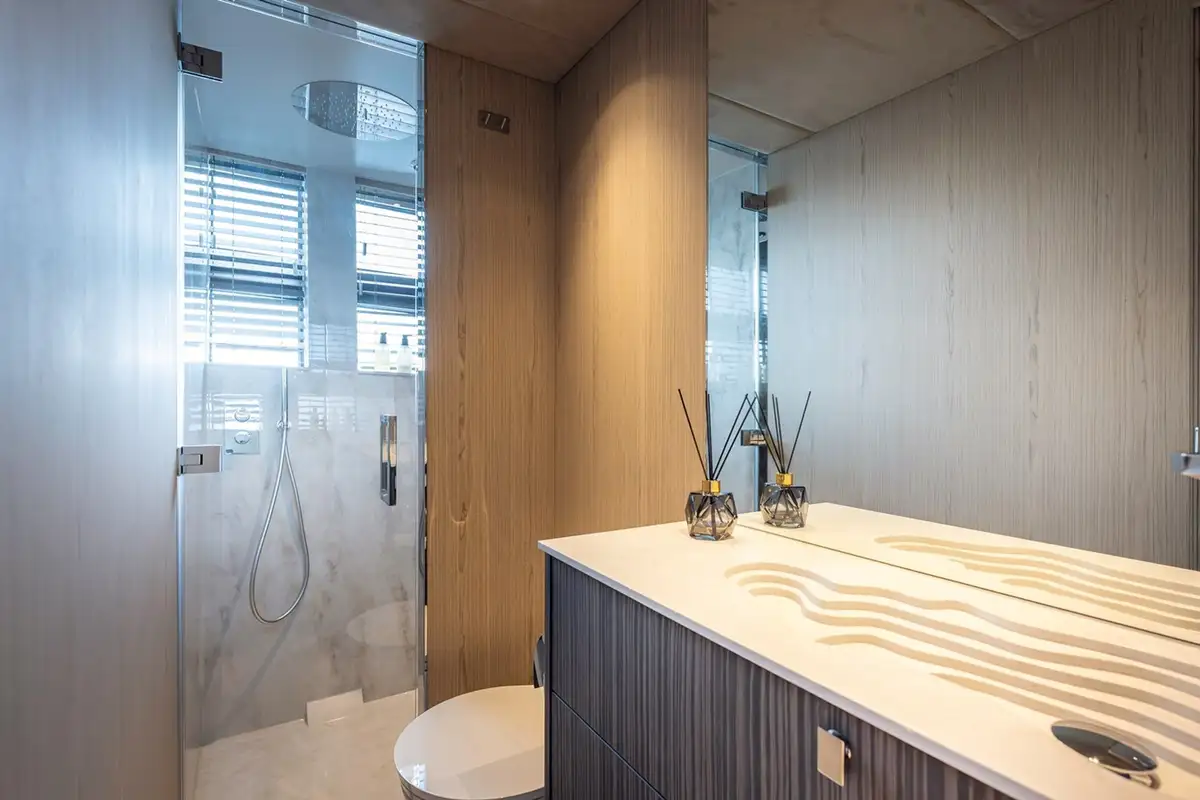 Up to 8 guests can be accommodated on board the superyacht. The configuration comprises a full-beam master suite, VIP and one guest double. She also has accommodation for 3 crew members.