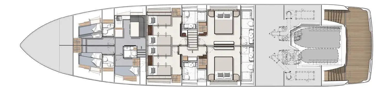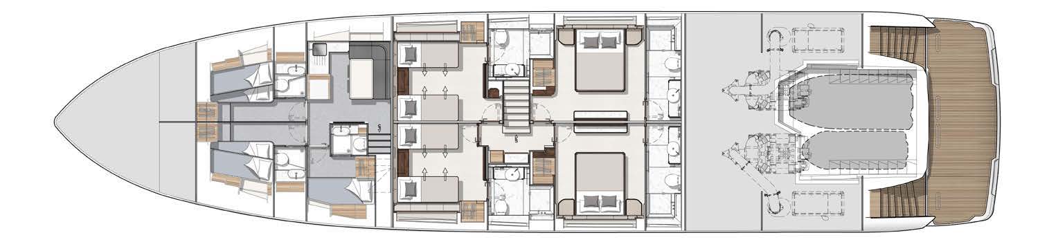 The yacht can be specified as a four or five cabin boat, ideal for the charter market. In either case, the twin amidship cabins can be fitted with Pullman berths for added flexibility. The crew cabin is also worthy of mention, featuring a Captain’s cabin with en suite, two twins each with en suite, a highly specified crew mess.