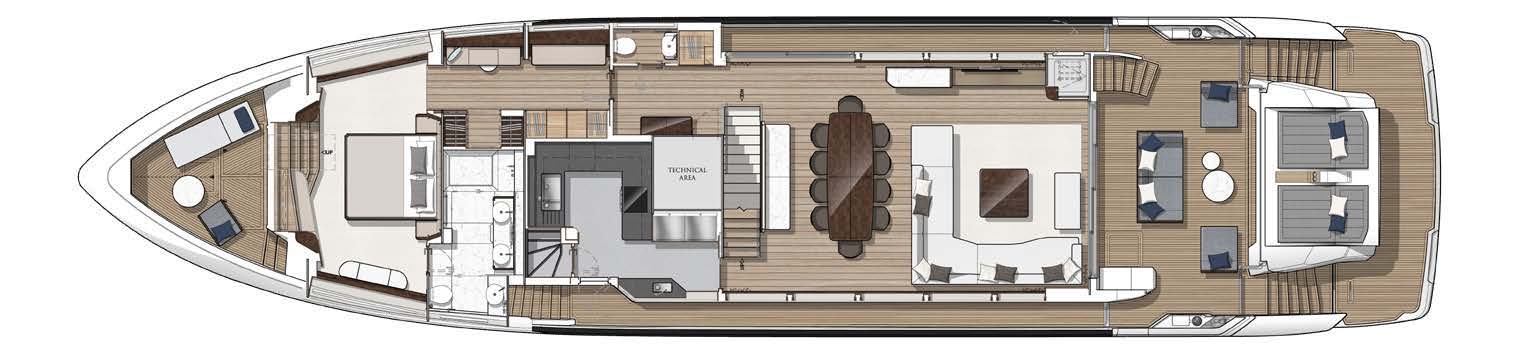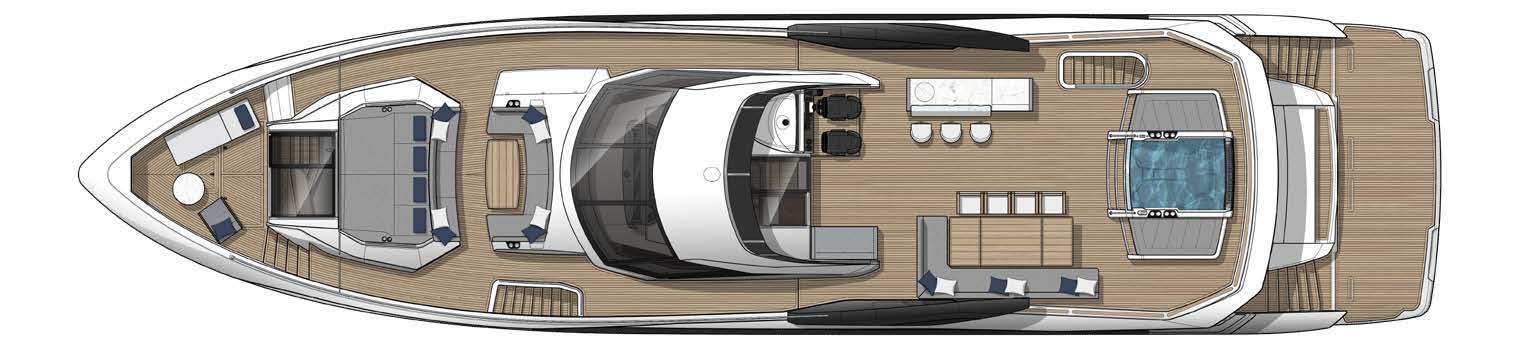 The vast flybridge on board the 100 Yacht flows seamlessly into the foredeck with uninterrupted walk-around access on both sides. The foredeck provides a social space with two separate seating arrangements plus an oversized sunpad. The essential raised pilot house, central to this yacht’s innovative design, incorporates a glazed sliding door aft, allowing uninterrupted views forward from the flybridge.