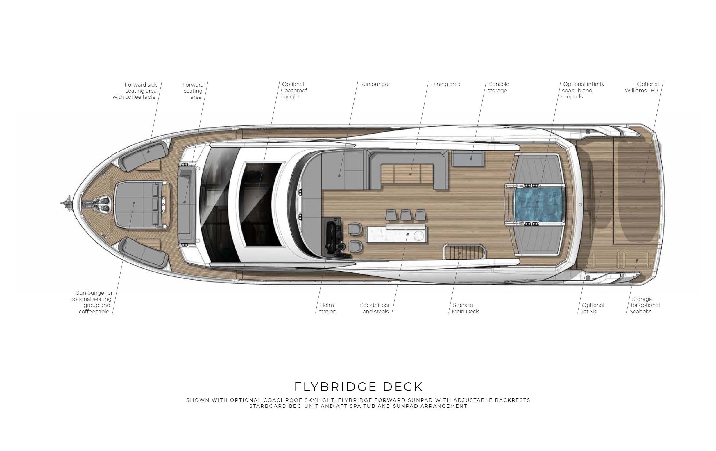 In the standard arrangement, her flybridge features a twin-seat helm and a large sunpad up front, a lounge and bar amidships, and ample space for four sun loungers astern. Alternatively, a spa tub flanked by sunpads can be installed on the aft part of the flybridge.