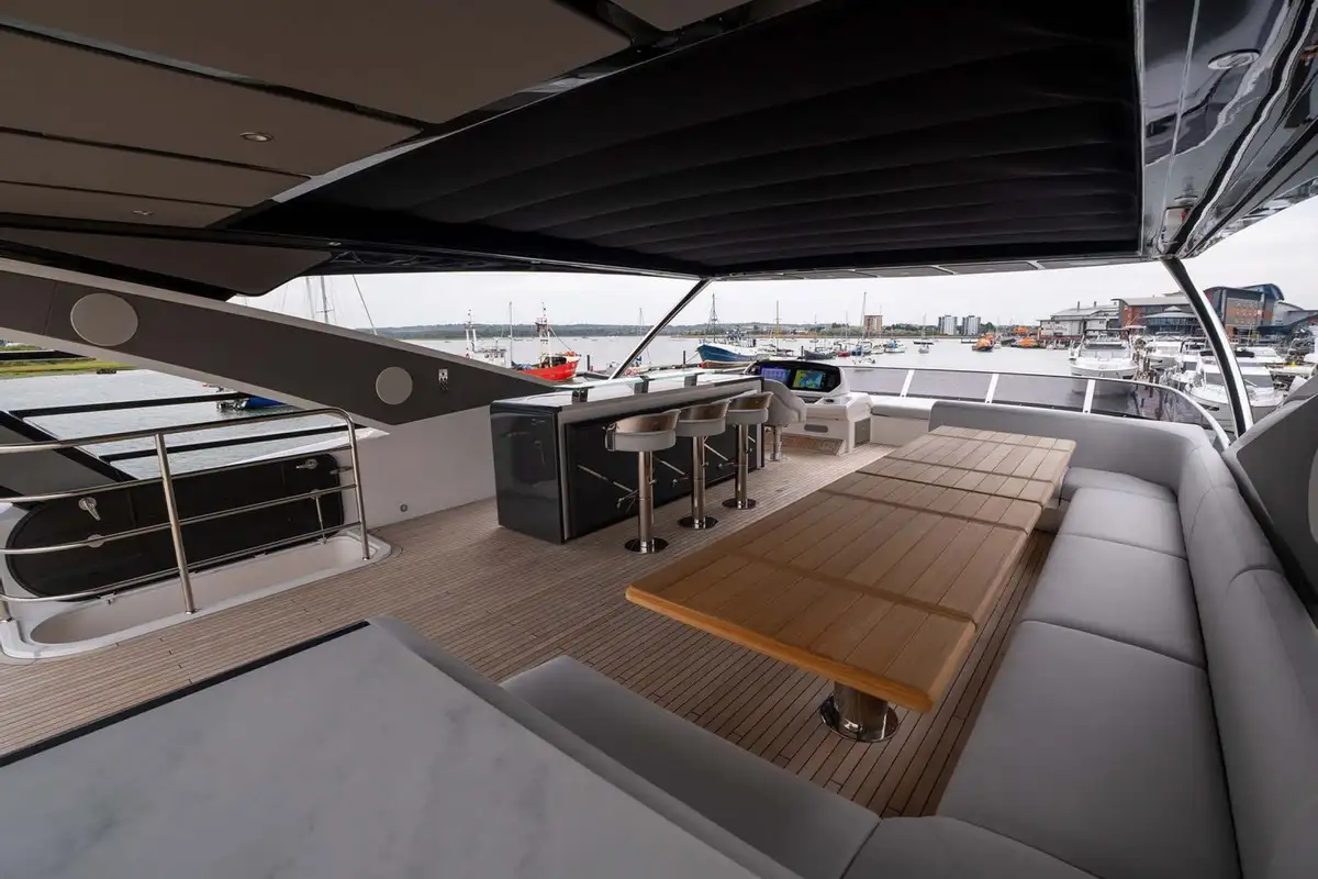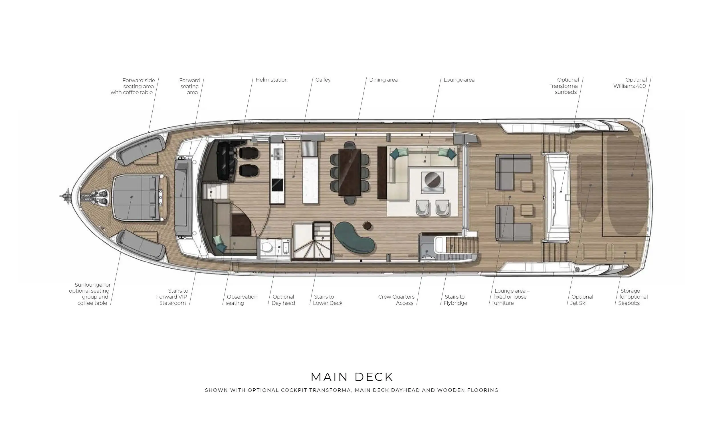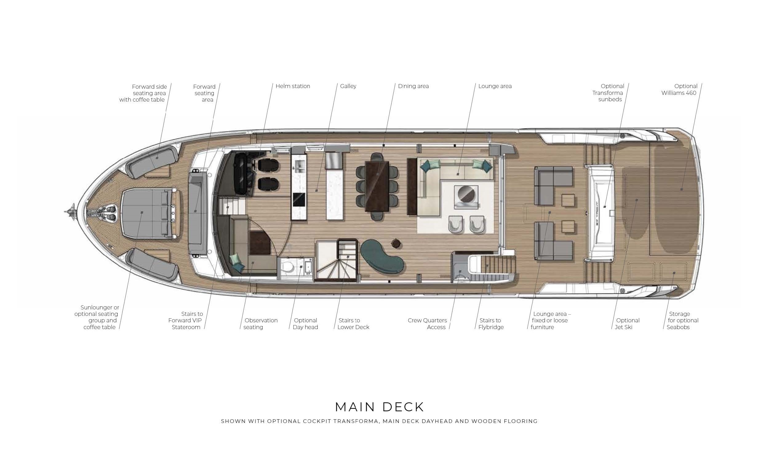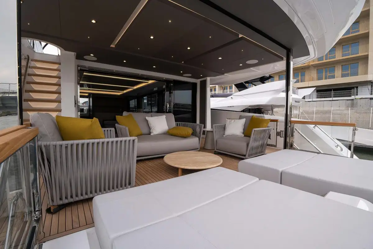 Exterior features include a spacious flybridge with a convertible hardtop, a shaded aft cockpit lounge on the main deck, and a Portuguese bridge on the forward coachroof with built-in seats and sun loungers. There’s a large, integrated stern platform with a hydraulically submersible section. This is designed to be used as a beach club terrace while she’s at anchor, and as a stowage place for a 4.6-metre (15ft) guest tender and a jet ski while she is under way. The two sunpads on her stern are hinged to allow them to form part of the upper-level aft cockpit or the sea-level beach club terrace, as desired.