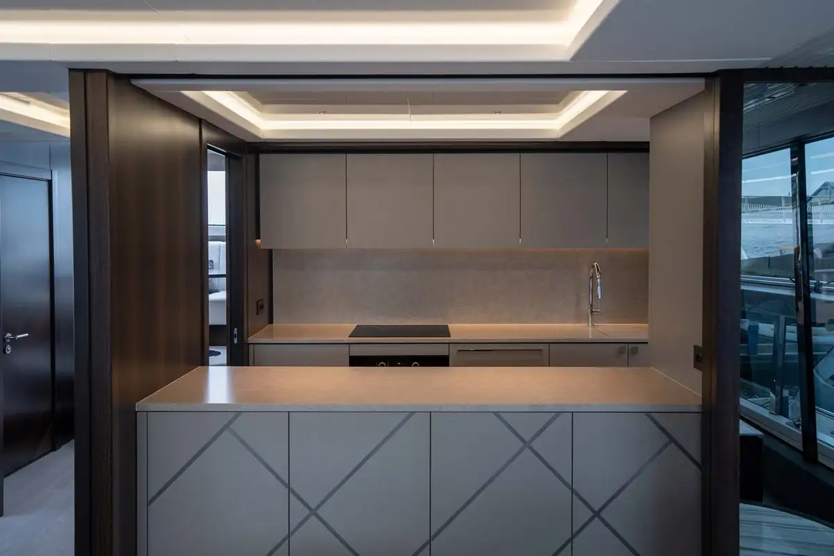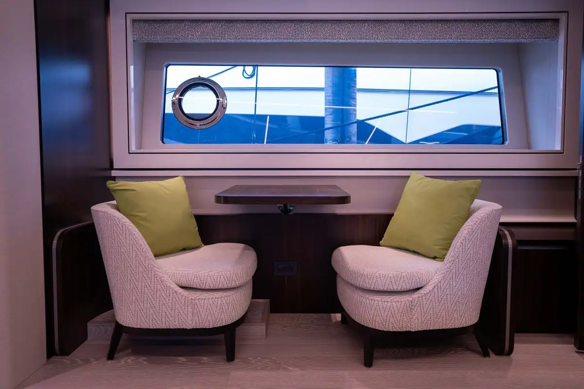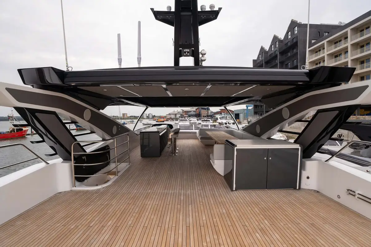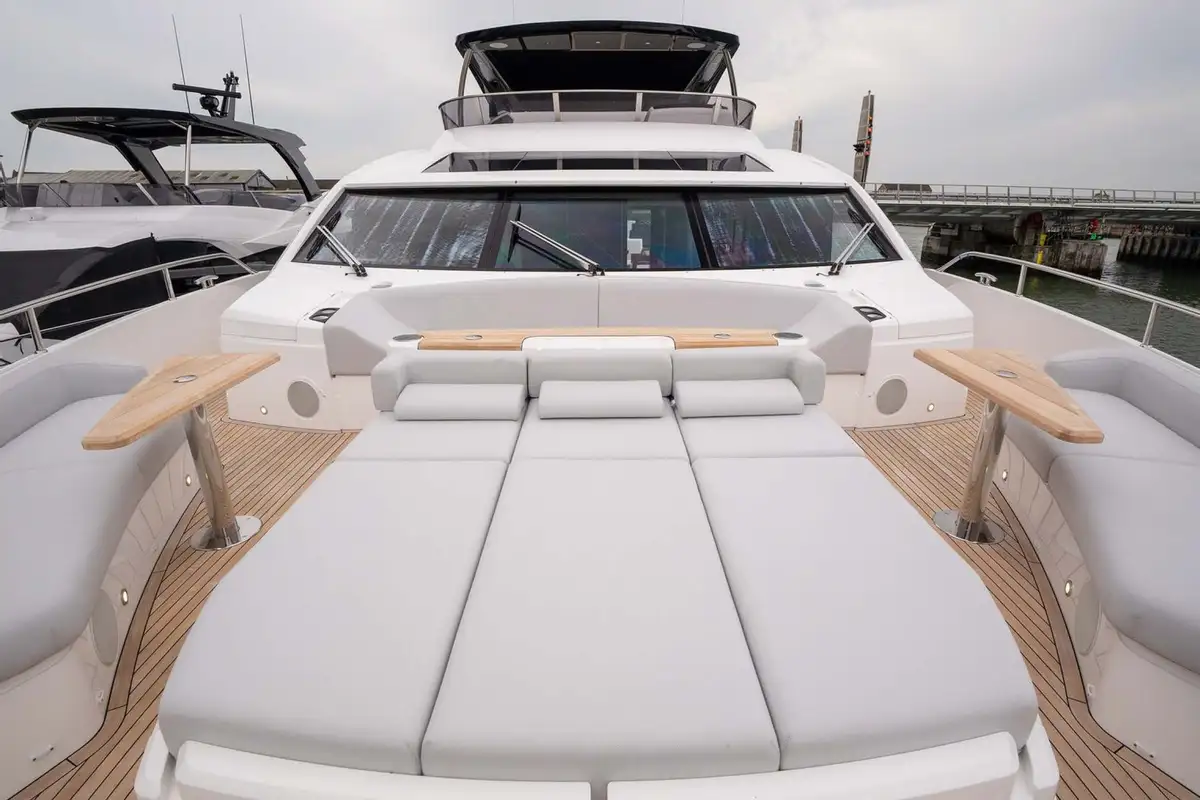 Exterior features include a spacious flybridge with a convertible hardtop, a shaded aft cockpit lounge on the main deck, and a Portuguese bridge on the forward coachroof with built-in seats and sun loungers. There’s a large, integrated stern platform with a hydraulically submersible section. This is designed to be used as a beach club terrace while she’s at anchor, and as a stowage place for a 4.6-metre (15ft) guest tender and a jet ski while she is under way. The two sunpads on her stern are hinged to allow them to form part of the upper-level aft cockpit or the sea-level beach club terrace, as desired.