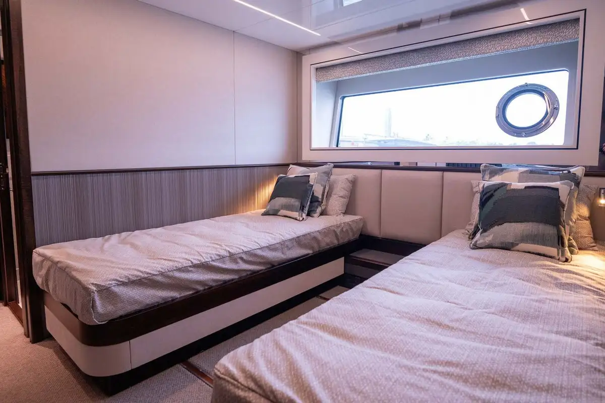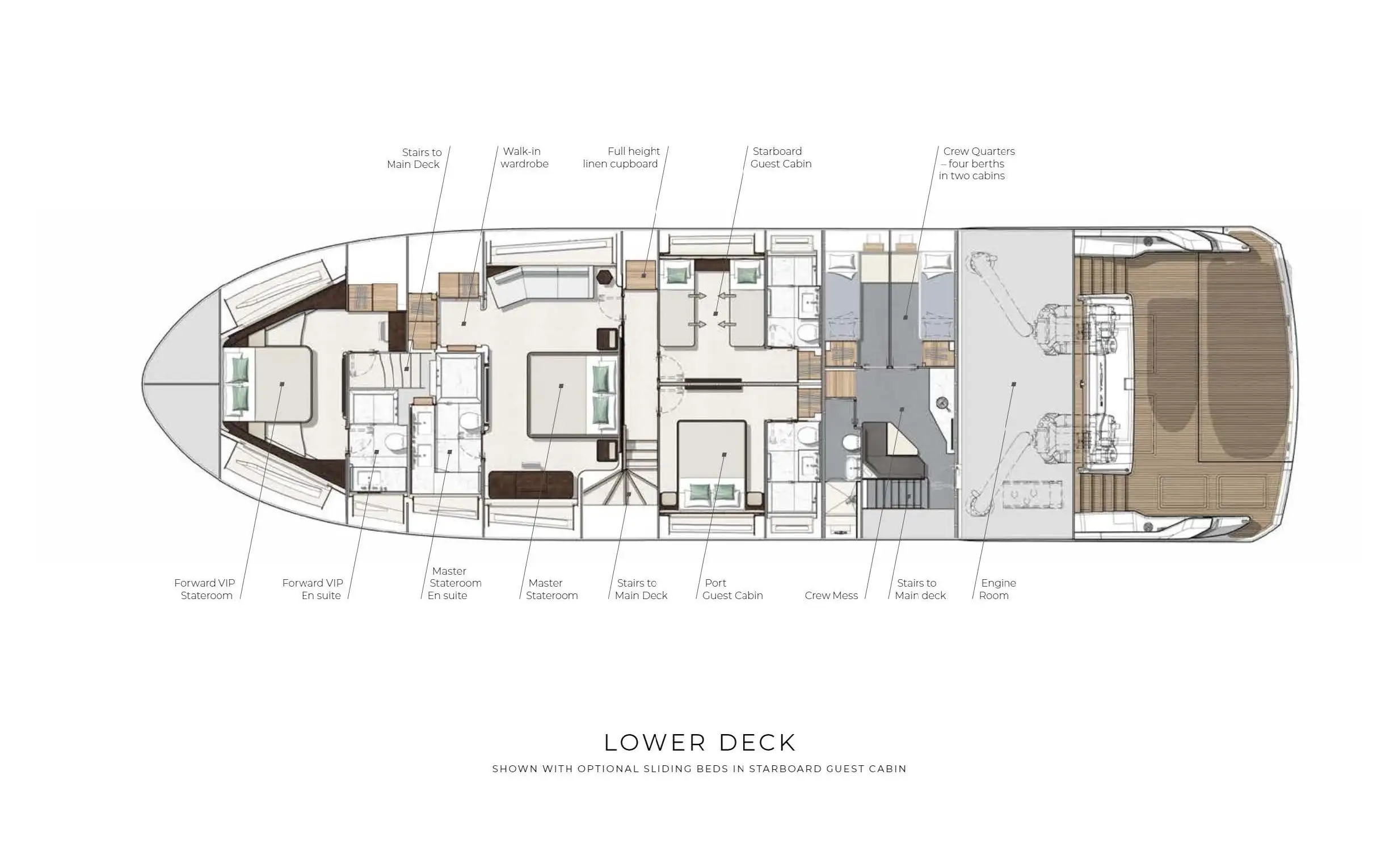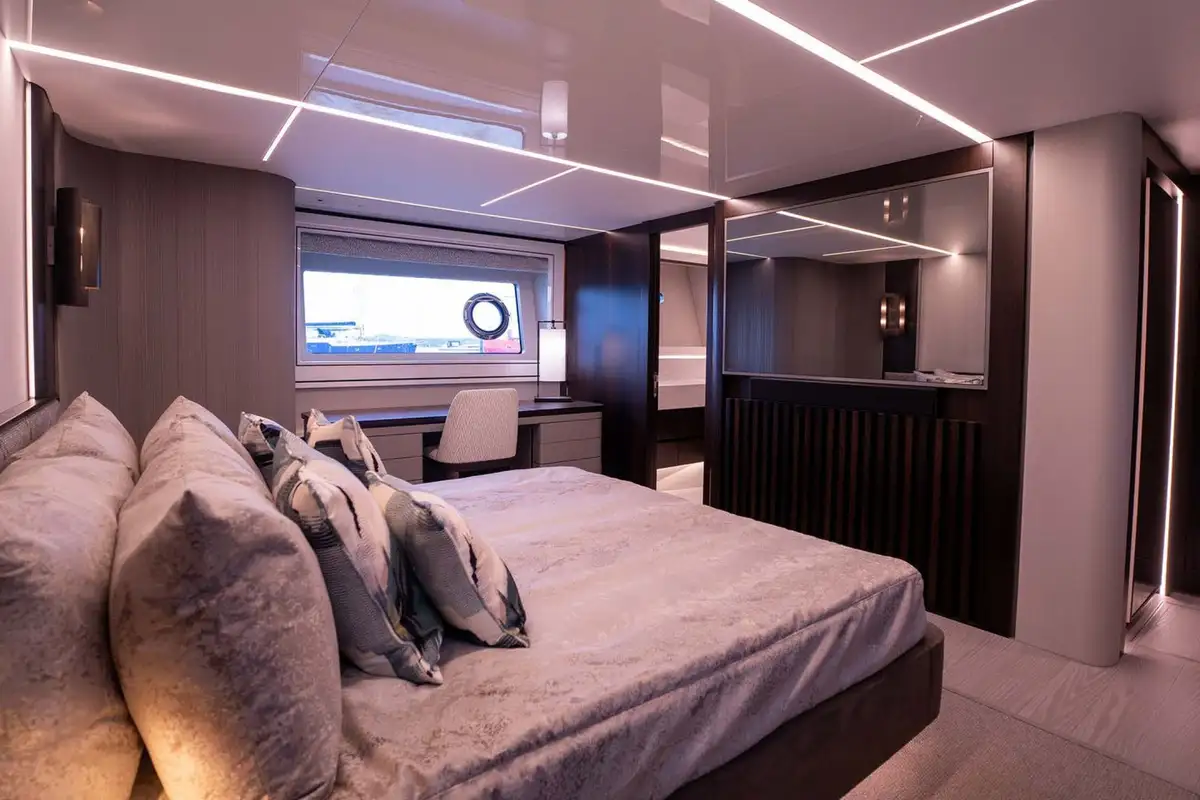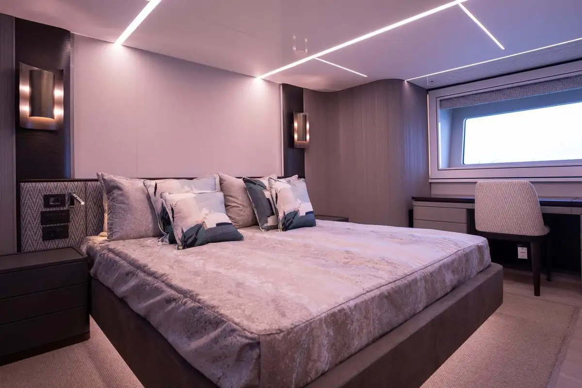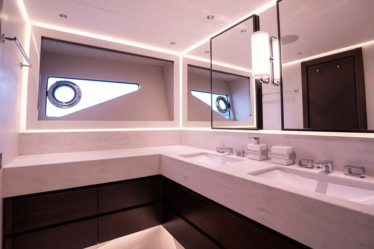 Guest cabins occupy most of the lower deck. The master suite is a full-beam cabin with a sofa and vanity/office desk, marble-clad en suite bathroom and walk-in closet. There’s a VIP cabin in the bow with its own access from the main deck, and two double or twin cabins amidships. The separate crew accommodation is in two double bunk rooms aft, providing a buffer zone between the engine room and guest cabins.