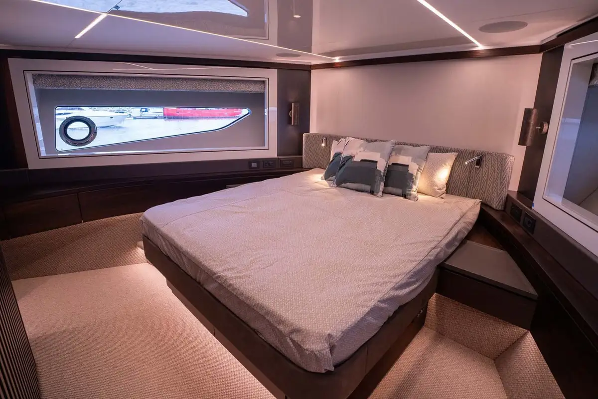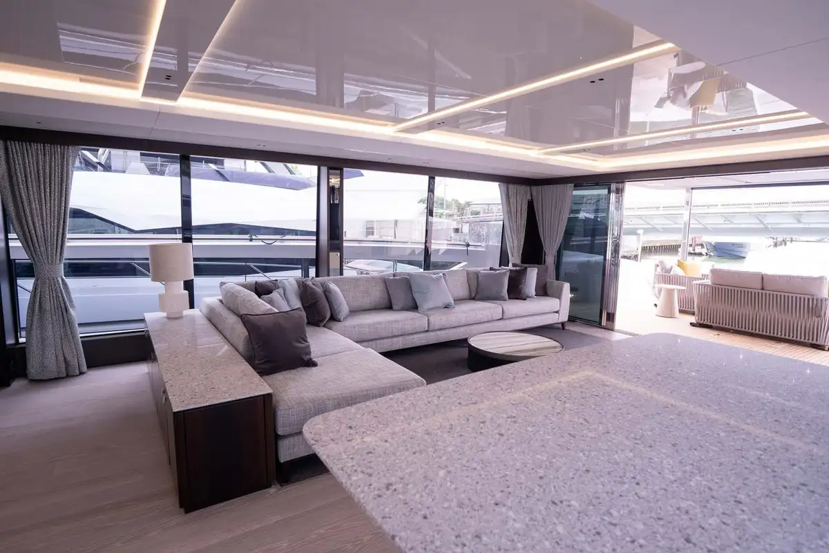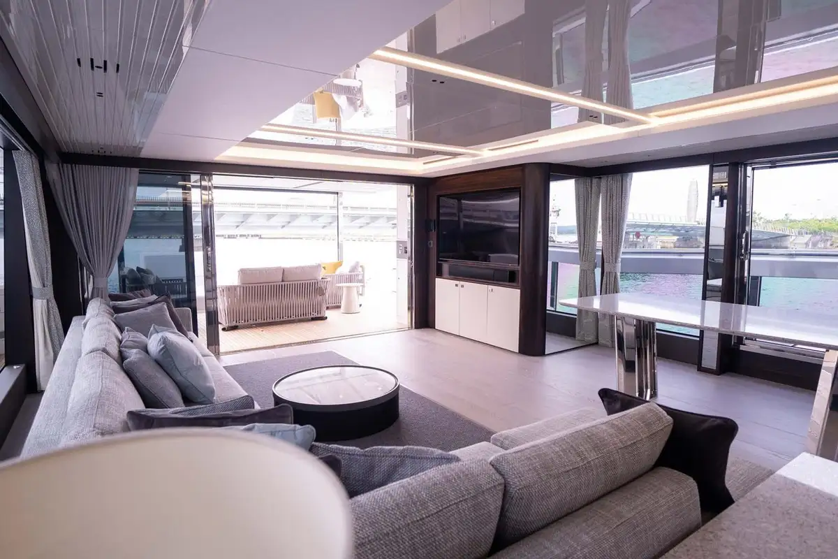 The main deck saloon is open plan with great swathes of floor-to-ceiling glass on both sides. There’s a lounge aft and a dining area forward with skylights above. The galley, forward of the saloon, can be open or closed. The main helm station is offset to make space for more guest seating alongside it.
