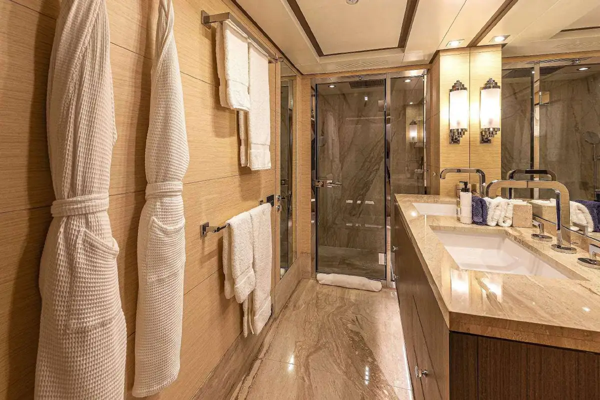 SUR LA MER has accommodation for 10 guests in five suites. The full-beam master suite is located on the main deck and boasts a separate office with a lounge area, walk-in wardrobe, and en suite bathroom with a statement bathtub. The master suite also enjoys direct access to a private terrace on the foredeck where there’s seating and a Jacuzzi. The four guest suites are positioned on the lower deck and comprise two large VIPs, one double and one twin, both with additional Pullman berths that are ideal for children, and all with en suite shower rooms.