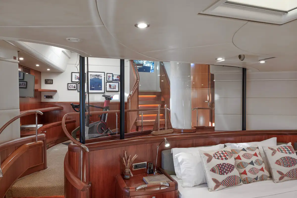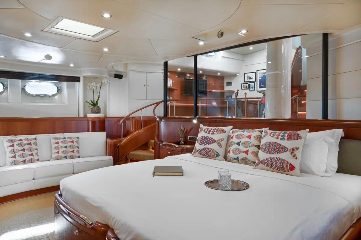 SURAMA’s relaxing, modern interior maximises natural light, with the deckhouse lounge’s wraparound windows and skylights allowing light to pour into the informal dining area. Steps lead down to the main saloon which has a large, semi-circular seating area and TV to port and an informal dining area to starboard.