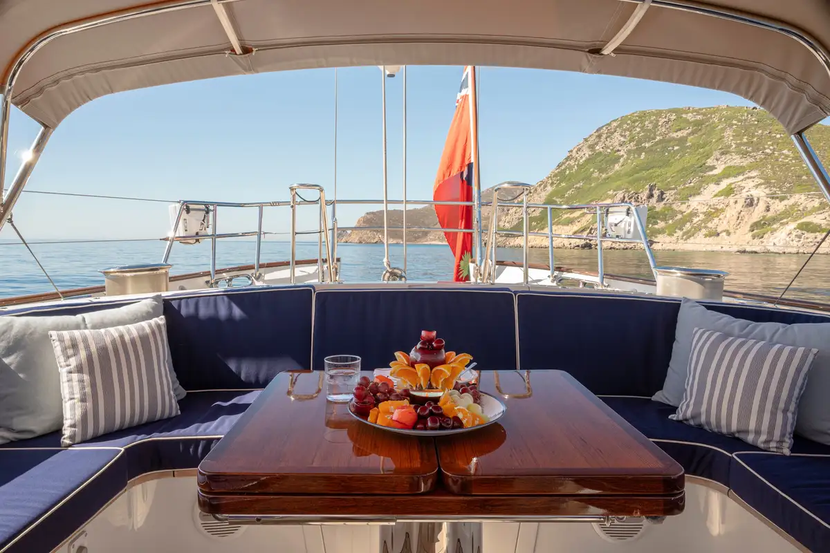 The aft cockpit is a versatile space that can be used for al fresco dining, or the table can be collapsed to form a sheltered sunpad platform. Further outdoor seating and dining options are provided between the dual helm stations and the flybridge, sheltered from the sun by a wide bimini. A central section of the aft deck folds down to create a swim platform for easy access to the water.