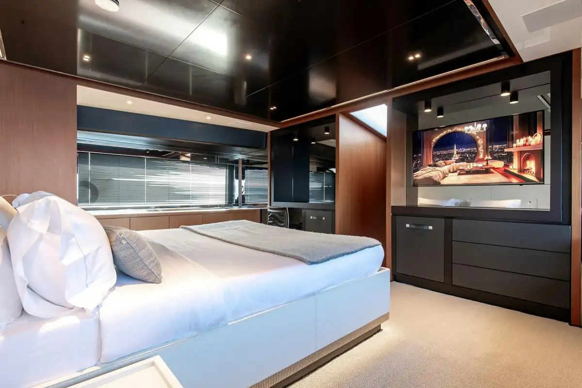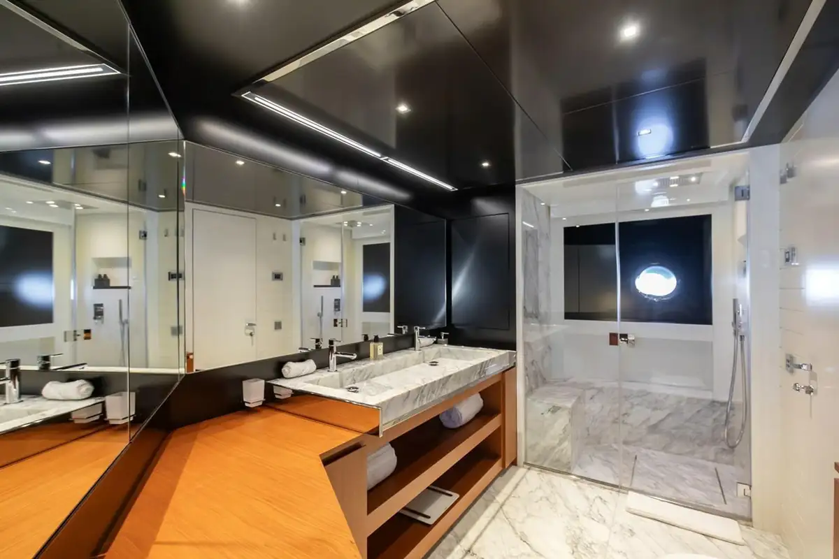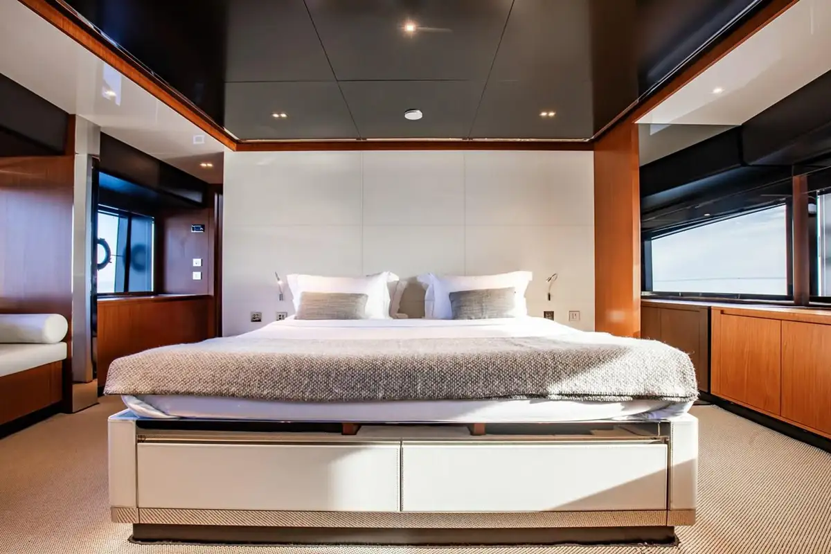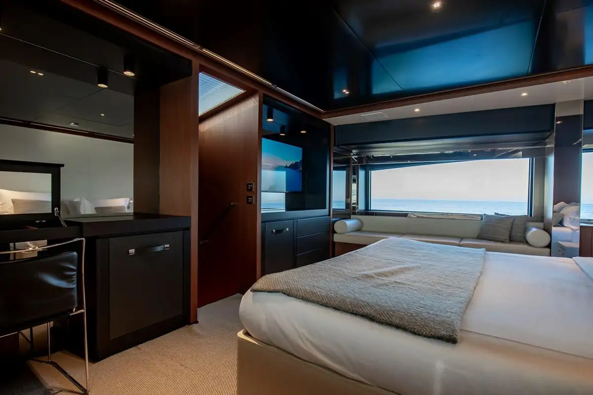 There’s accommodation onboard for eight guests in four ensuite cabins, comprising an owner’s suite on the main deck, a full-beam VIP, 2nd guest double and a twin cabin, all with large panels of glazing in the hull side. Two additional cabins accommodate four crew.
