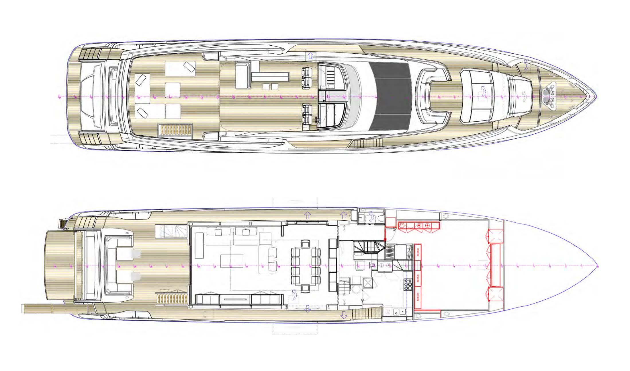 With 219GT of internal volume on the main and lower decks, she has been designed with two accommodation layout options offering either five or four double guest cabins. In both versions the owner’s cabin is of course a full-beam suite located forward on the main deck with an aft-facing bed on the centreline, spacious en suite heads with his & hers sinks, and access via a private passageway leading forward from the main communal areas on the port-hand side of the yacht.