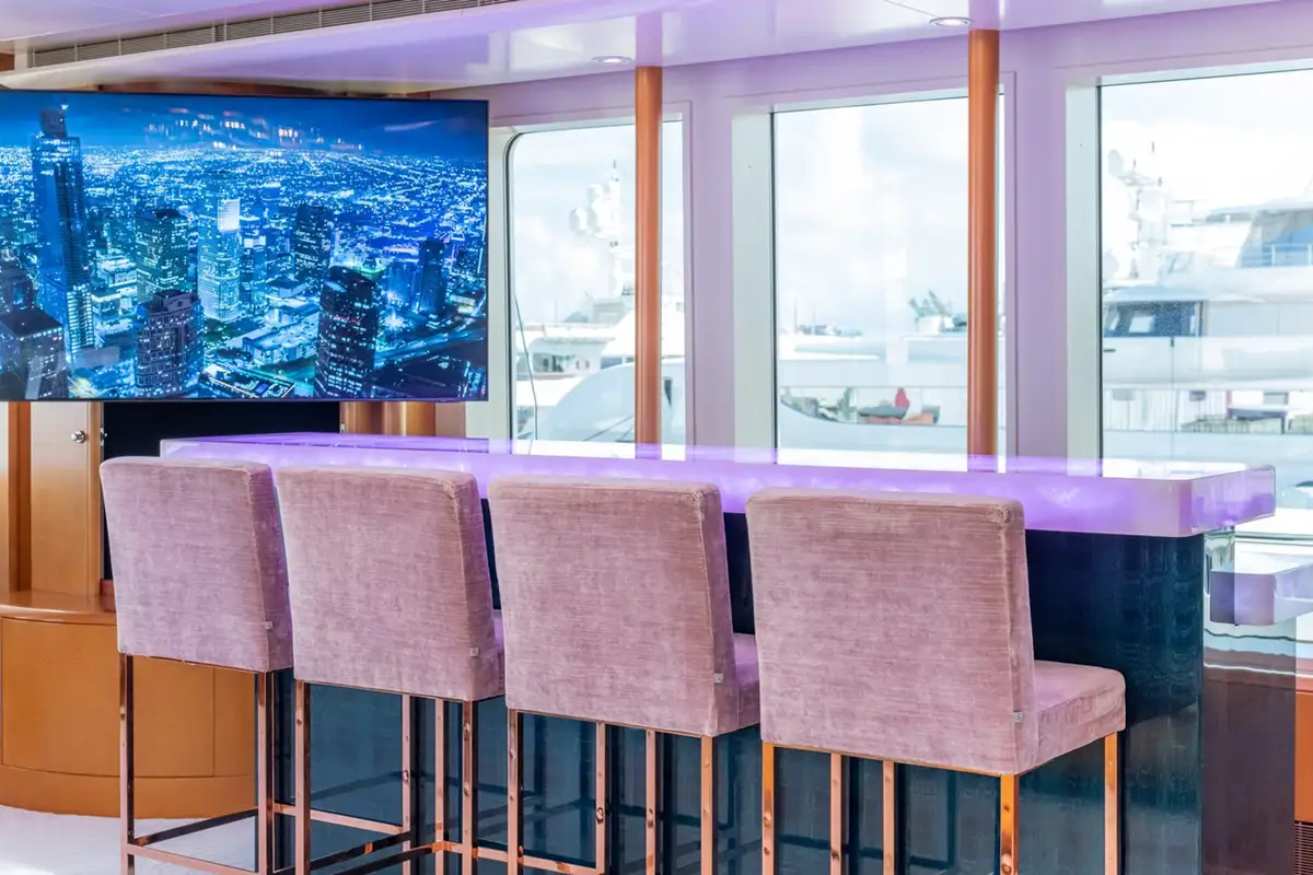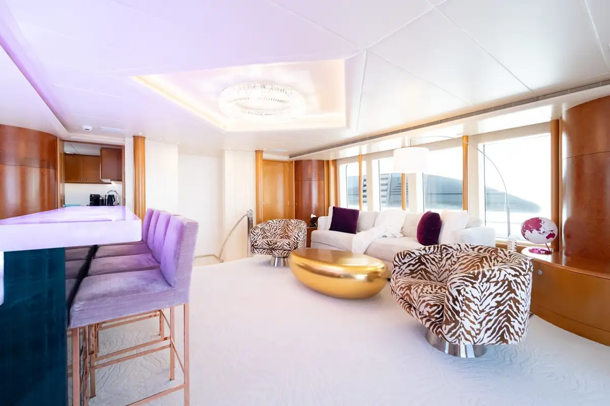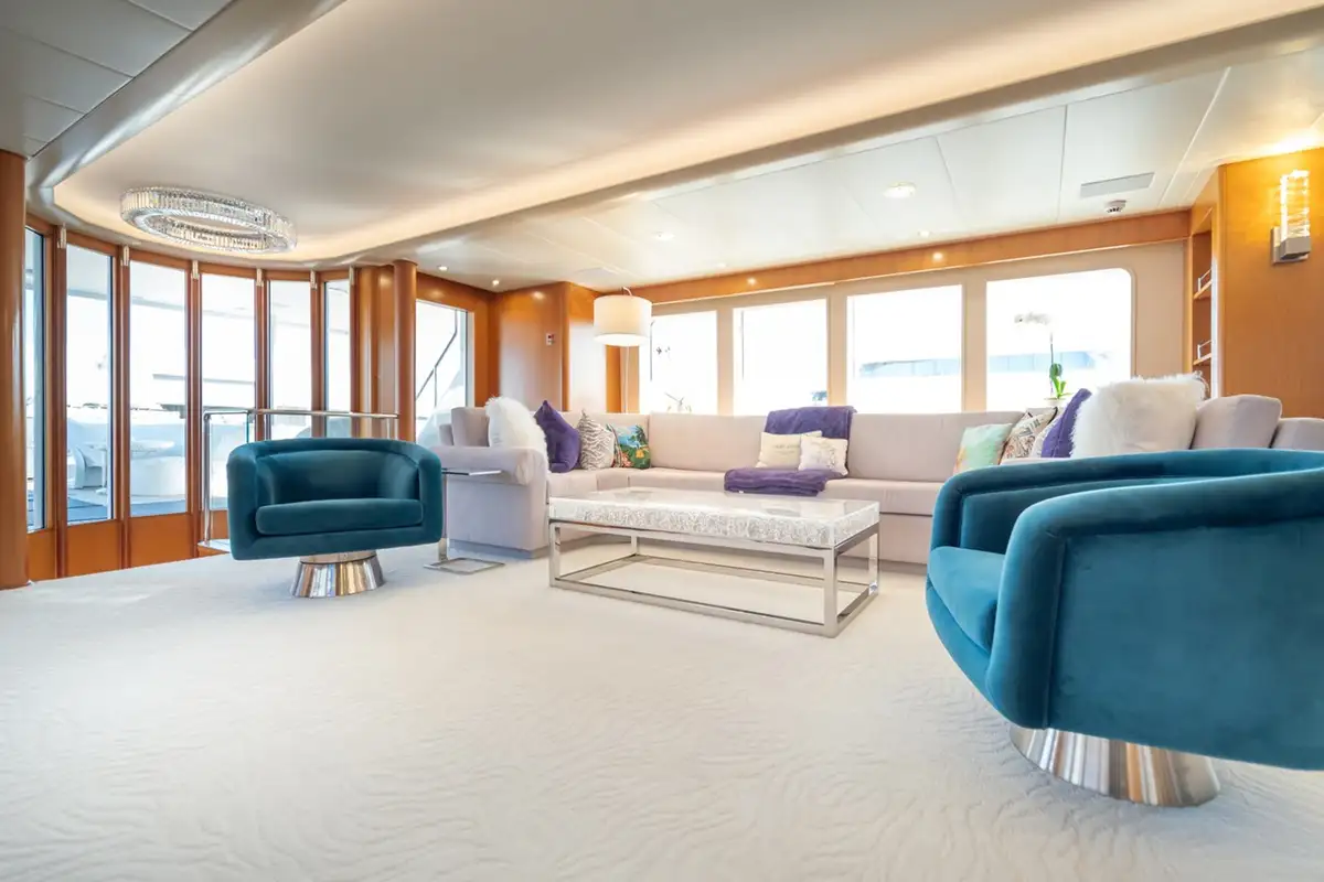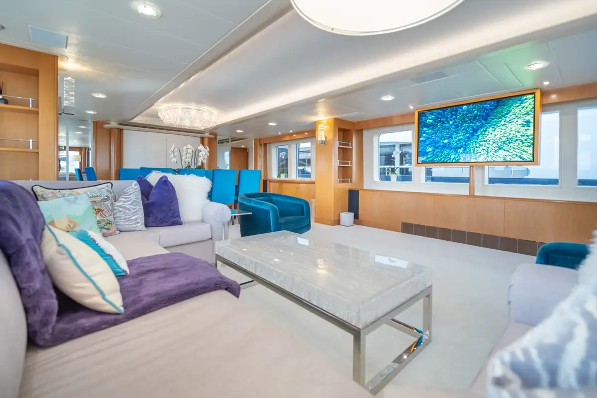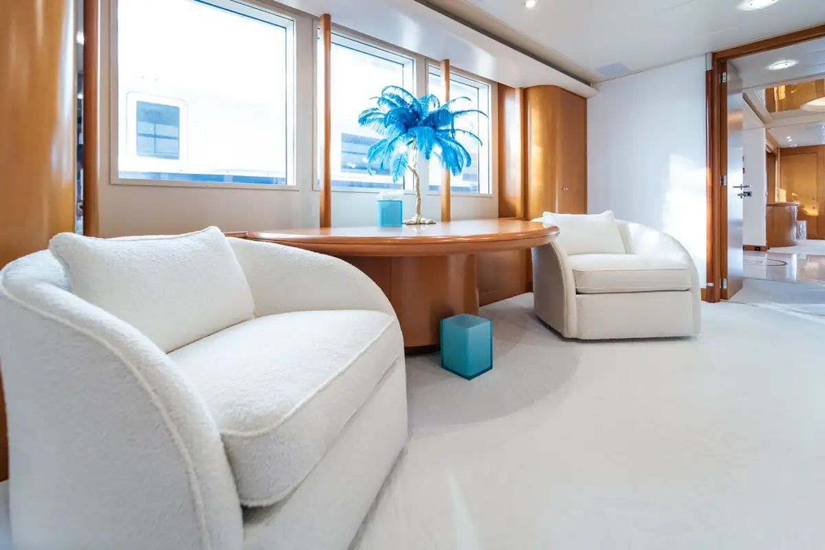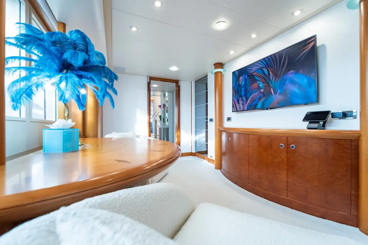 Upon entering the motor yacht TASIA’s main salon via automatic sliding doors from the aft deck, guests will be greeted by oversized windows to port and starboard that provide sweeping views of every cruising port. This full-beam, open salon features comfortable seating, encouraging socializing and relaxation. The elegantly casual Deco-Caribbean motif and contrasting madrona burl and anigre, wood joinerwork creates a convivial atmosphere. Forward is the adjoining dining salon where 12 guests are seated at an oval table for sumptuous meals by the yacht’s professional chef. The foyer located amidship provides access to the deck companionway, joins the main staircase to the skylounge and offers access to the galley and the master stateroom forward. The bridge deck is home to the wheelhouse and the skylounge, which is perfectly positioned for socializing and unwinding. It features a card table and long couches with plenty of seating options. The wide, oversized windows on this deck offer guests bird’s eye views throughout their time onboard. A large screen TV and updated electronics, including Kaleidescape system, provide guests with hours of entertainment.