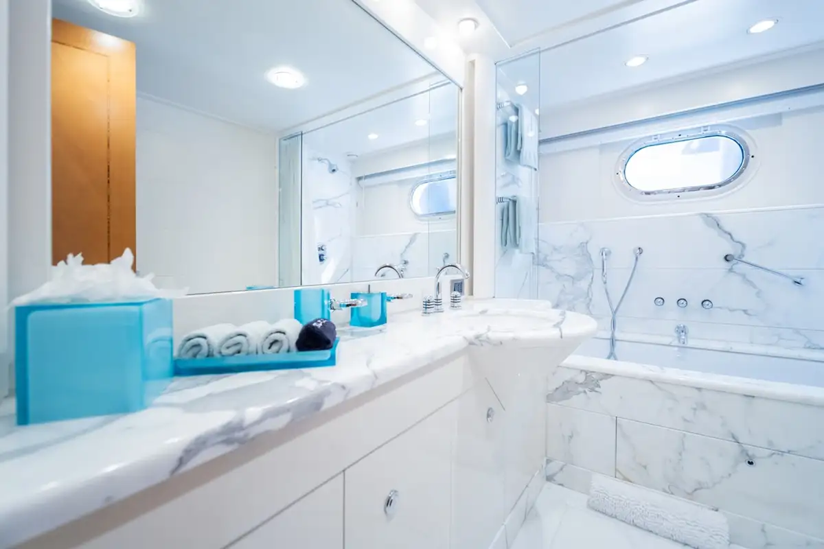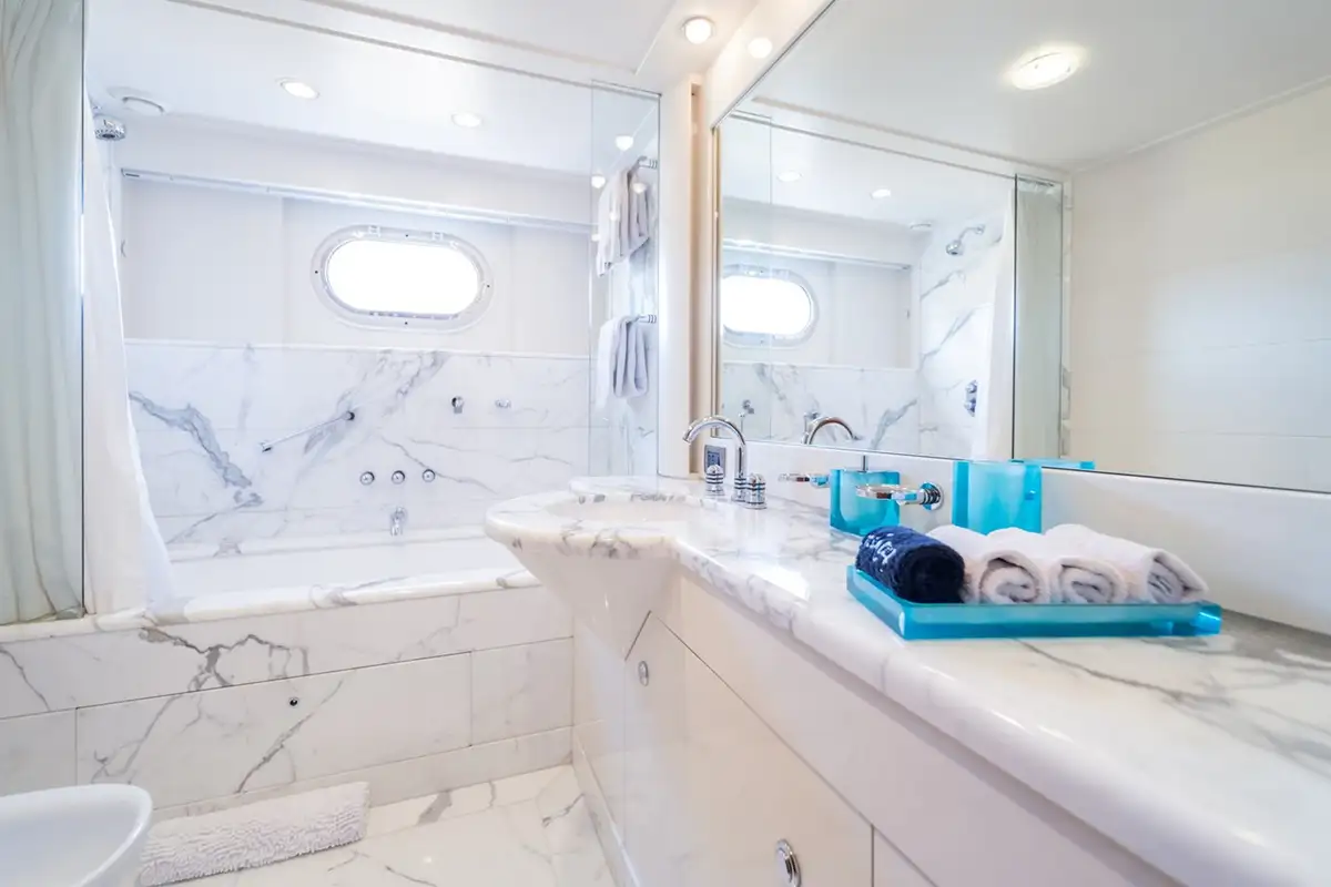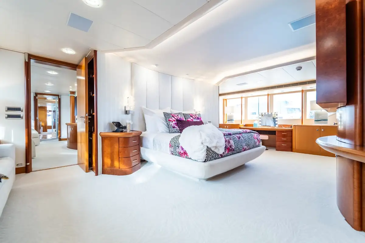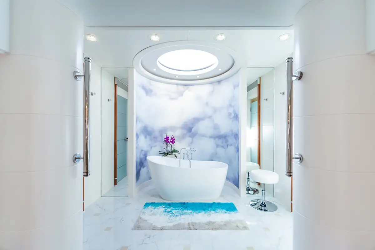 Located on the main deck of luxury yacht TASIA is the full-beam master stateroom where her new owners will enjoy restful nights at sea. It is outfitted with a king-size bed, a large closet, a desk, couch and chaise lounge as well as state-of-the-art entertainment systems and large windows. An en-suite bathroom has a large steam shower, stunning Jacuzzi tub with skylight and breathtaking mural. The yacht’s four additional staterooms are located below deck. These include two queens and two twins, each with a Pullman bunk – the yacht accommodates 12 guests in total. All staterooms have en-suite bathrooms and exceptional entertainment offerings. A professional crew of 10 will cater to every need of guests who cruise aboard TASIA.