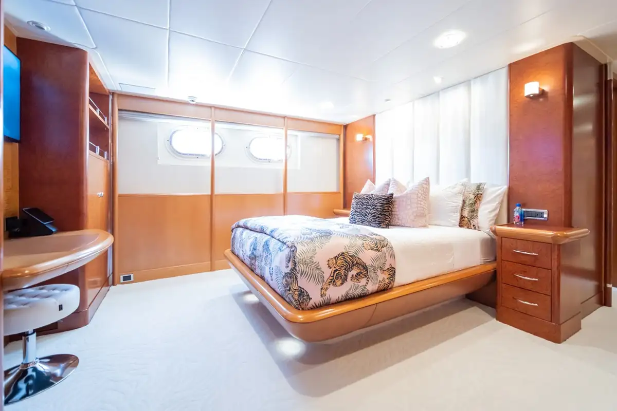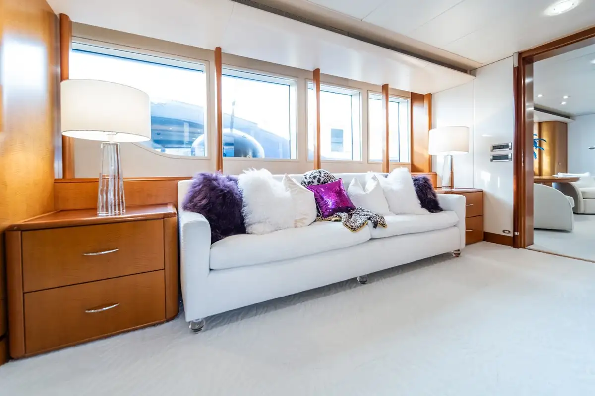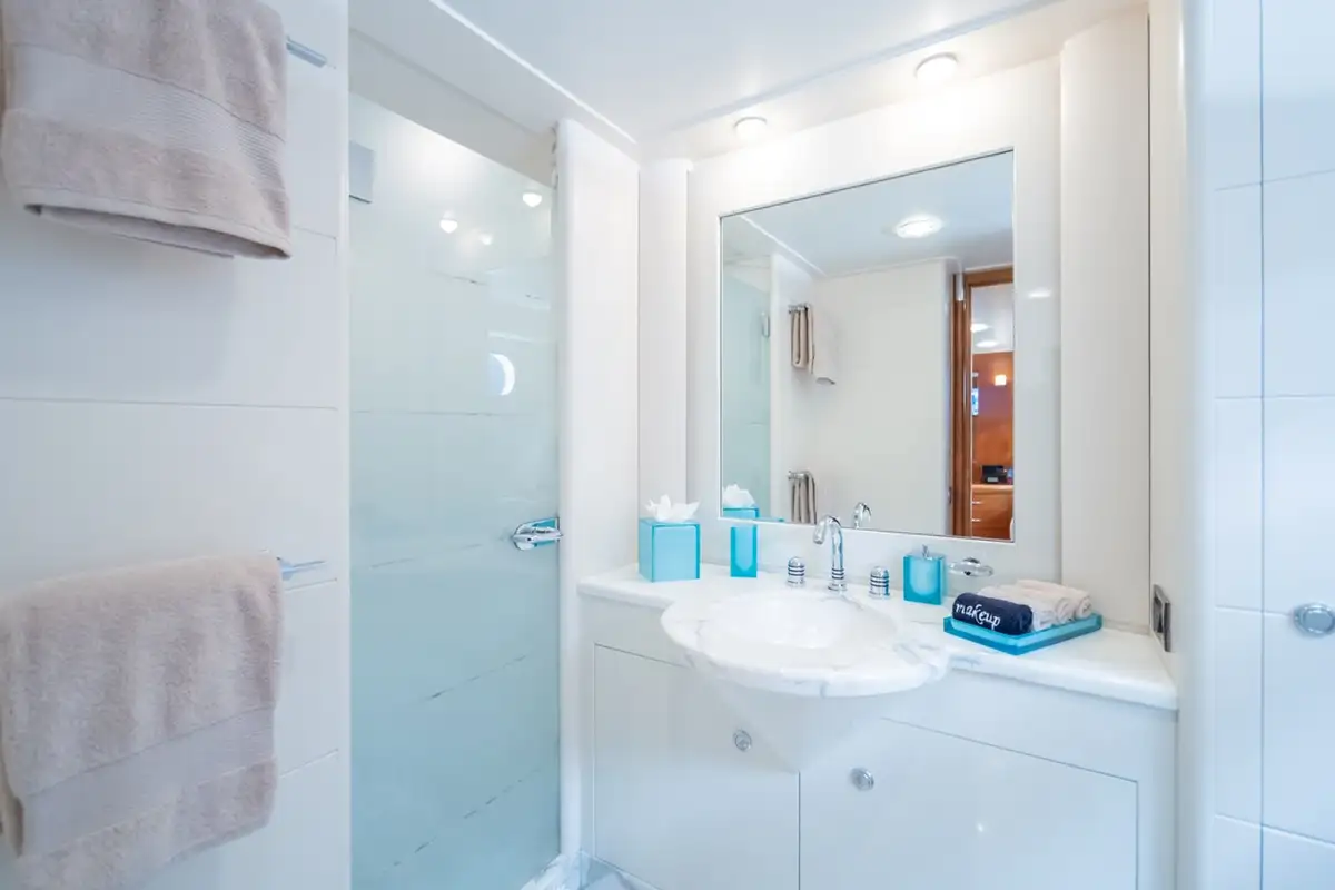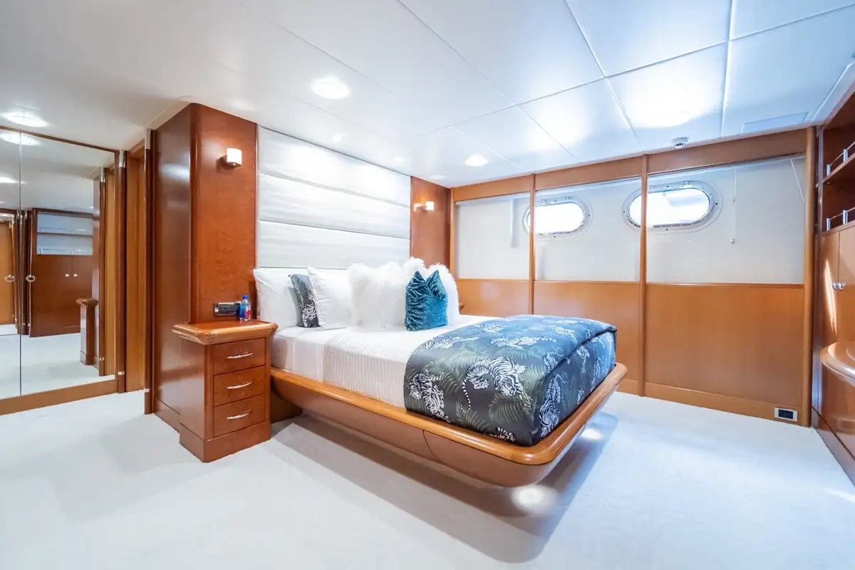 Located on the main deck of luxury yacht TASIA is the full-beam master stateroom where her new owners will enjoy restful nights at sea. It is outfitted with a king-size bed, a large closet, a desk, couch and chaise lounge as well as state-of-the-art entertainment systems and large windows. An en-suite bathroom has a large steam shower, stunning Jacuzzi tub with skylight and breathtaking mural. The yacht’s four additional staterooms are located below deck. These include two queens and two twins, each with a Pullman bunk – the yacht accommodates 12 guests in total. All staterooms have en-suite bathrooms and exceptional entertainment offerings. A professional crew of 10 will cater to every need of guests who cruise aboard TASIA.