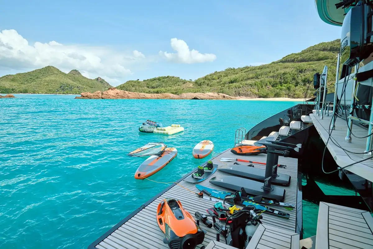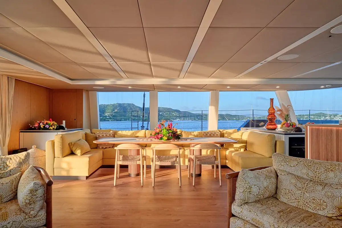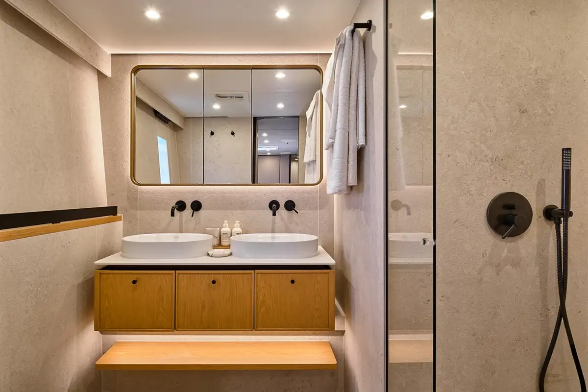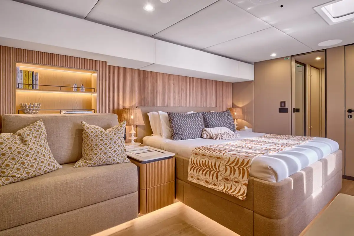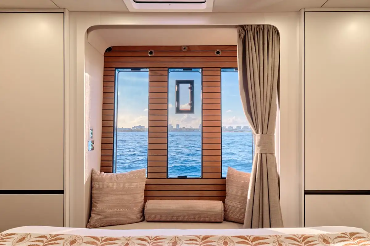 Up to 8 guests can be accommodated on board the superyacht. She’s expansive and elegant, with oversized lounging areas, a saloon dedicated entirely to guests, and four double cabins styled like boutique suites and the magnificent balcony hull door in the master cabin putting you just a few steps from bed to sea. She also has accommodation for 4 crew members.