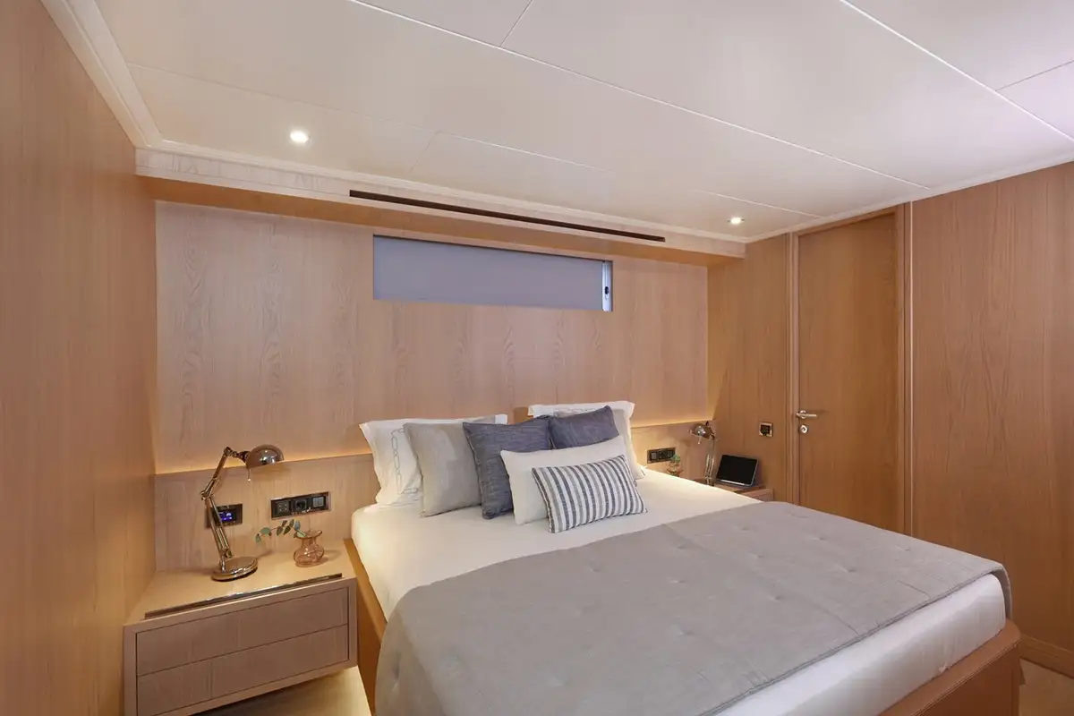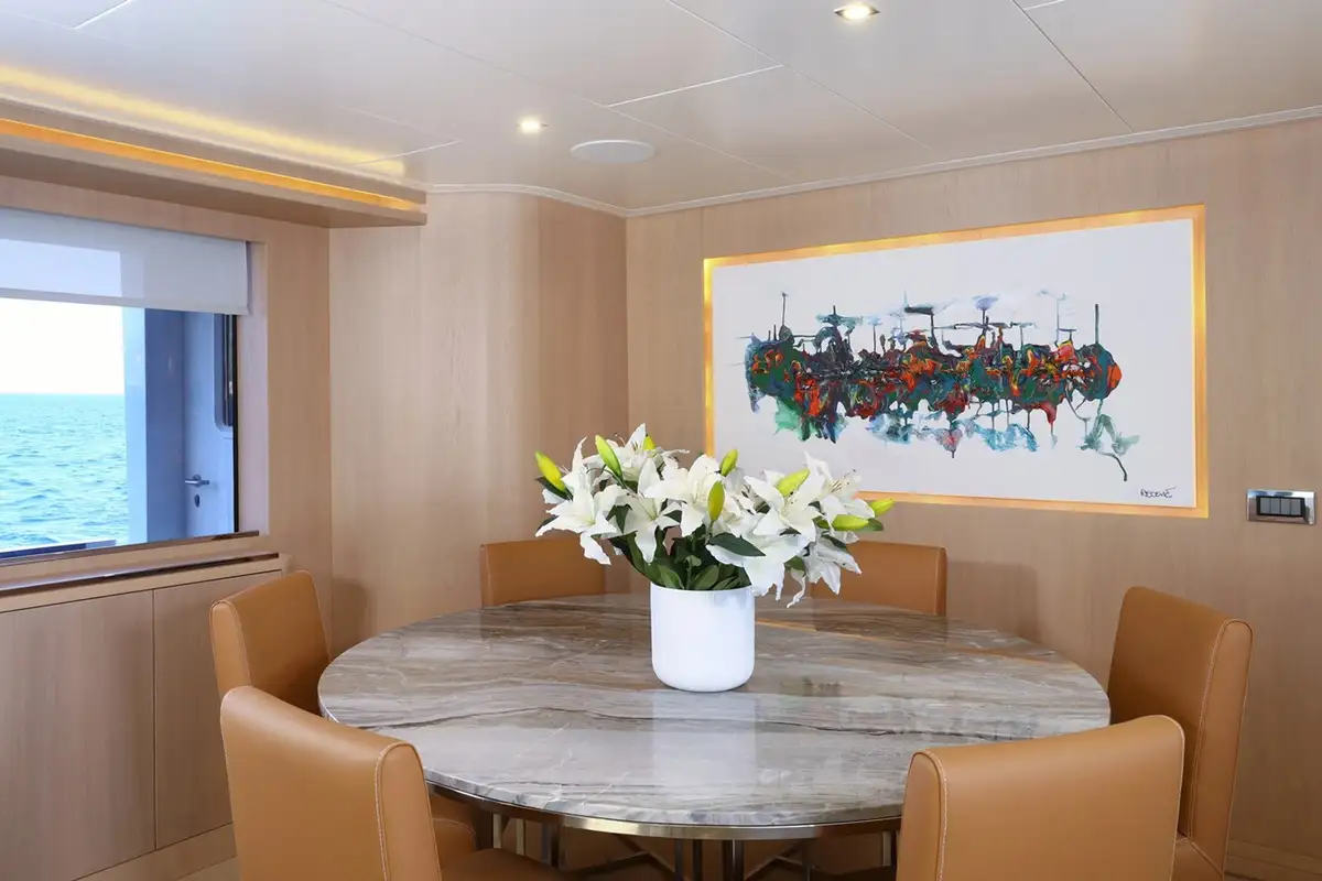 The main deck features elegant saloon and comfortable dining area for guests in warm colours. Outside areas are equally generous with multiple separate relaxing areas for guests to enjoy, including a sky lounge and a large swimming platform.