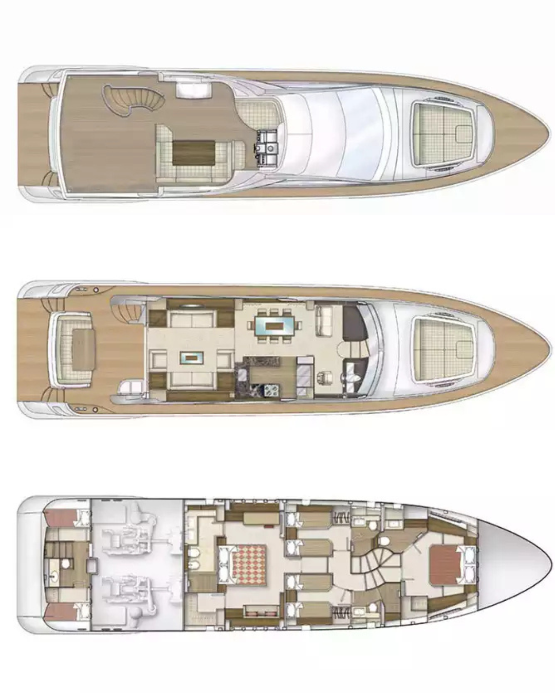 TRANQUILITY, a Azimut 78 built in 2011, seamlessly blends the spacious elegance of larger yachts with the agility and performance of a smaller boat. Its exceptional design offers a refined atmosphere throughout, featuring expansive living spaces. A groundbreaking layout when first launched, TRANQUILITY boasts a fully separated galley and crew quarters, ensuring enhanced privacy and ultimate comfort for guests.