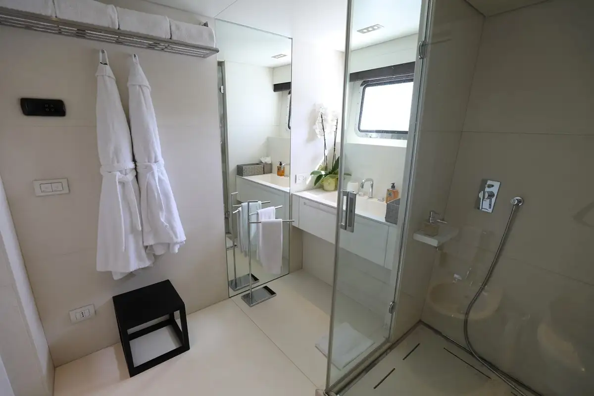 The owner’s suite includes a separate office and a very large en suite bathroom clad in black marble with twin sinks, a rain room shower and a free standing bathtub. The master cabin has a forward-facing bed, a lounge area and stunning panoramic views forward and on both sides through a grand sweep of picture windows.