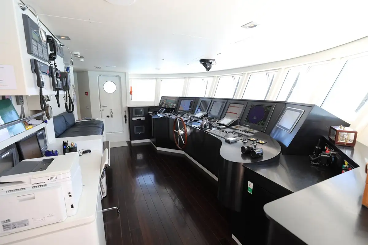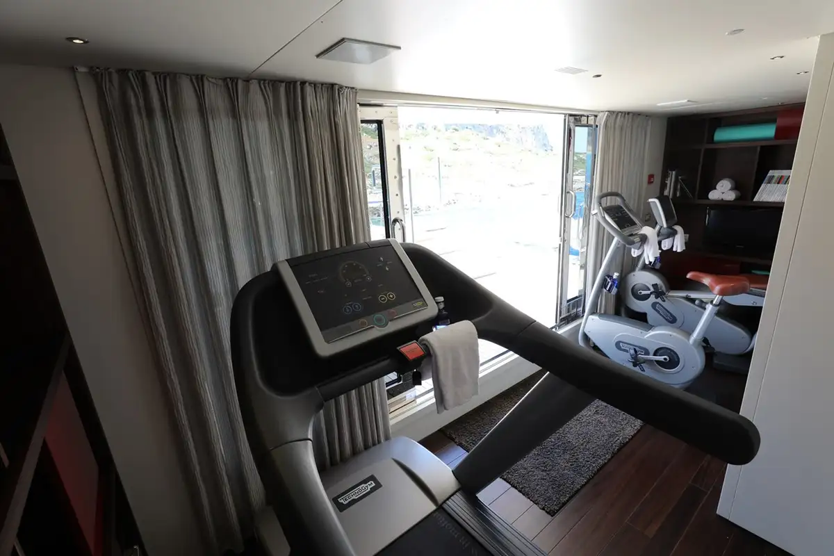 Up on the bridge deck there is a gym that opens out onto the sundeck and a captain’s cabin next to the wheelhouse. With all the guest cabins on the main deck, the entire lower deck is dedicated to crew accommodation and service areas.