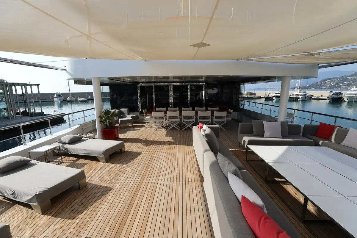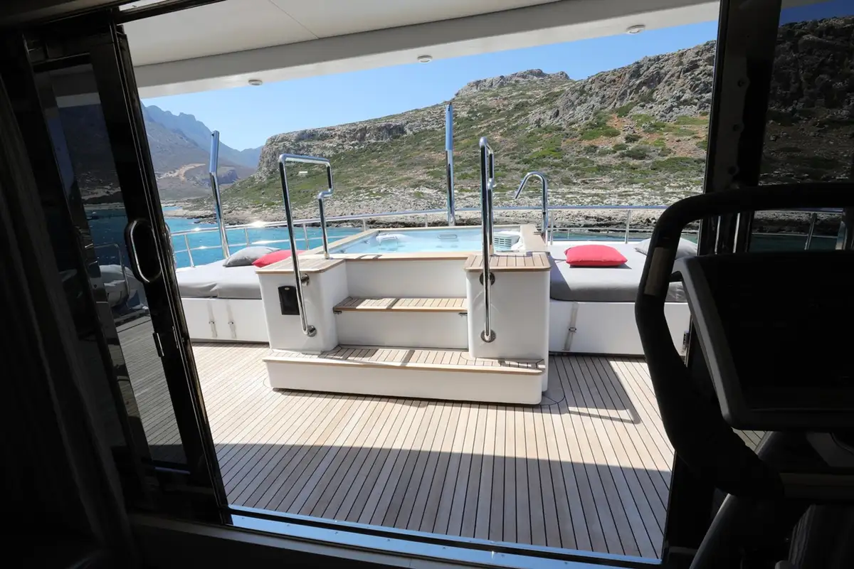 Her top deck is open and used primarily for stowage of small craft. The sundeck is on the bridge deck level, with wing stations and full walk-around decks connecting an open-air lounge in a Portuguese bridge on the forward coachroof and an aft-facing deck which has a square jacuzzi pool and two double sunbeds.