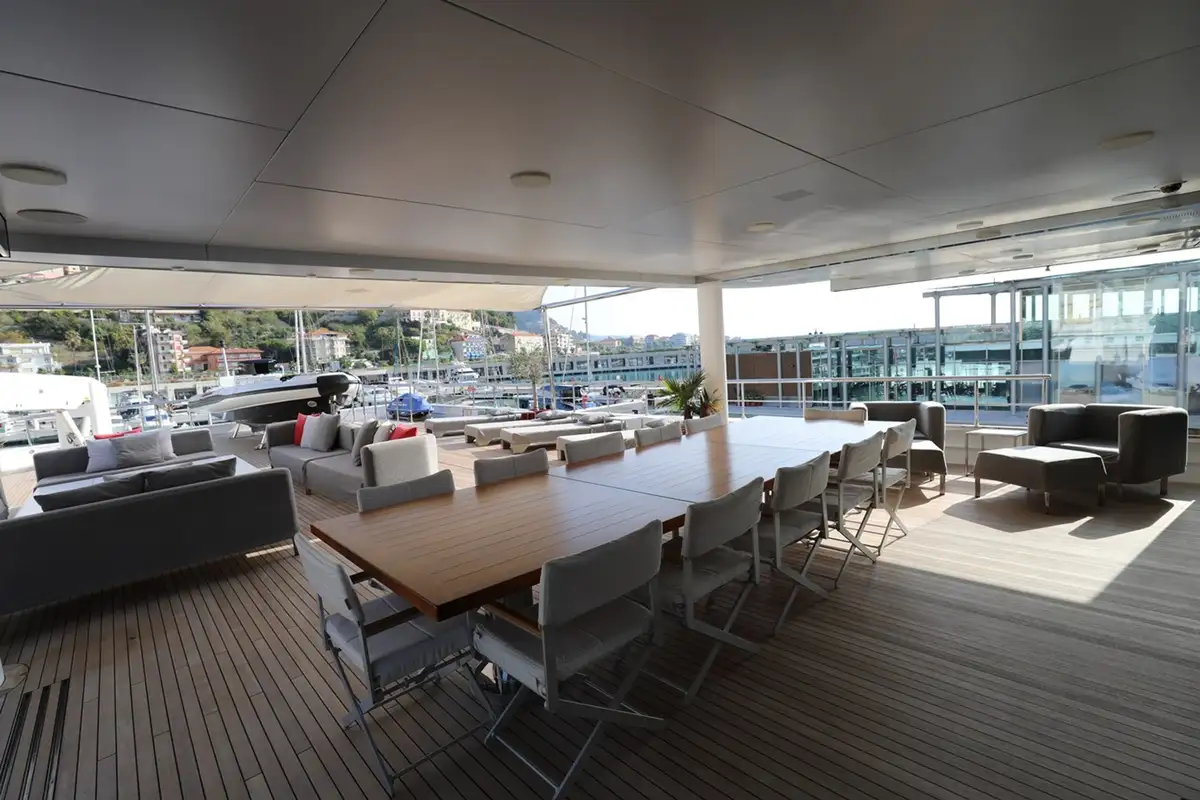The next level down is the owner’s deck, where a huge outside space faces aft with a 12-seat dining table and snug seating area in the shade of the sundeck overhang and a large, sociable lounge further aft with a steel-framed awning for shade. There is also a sunbathing zone with four sunbeds and a dedicated stowage space for the main guest tender astern. The main deck aft is an open space with a large daybed and more small craft stowage.