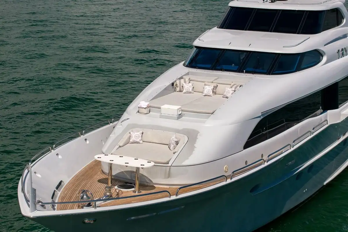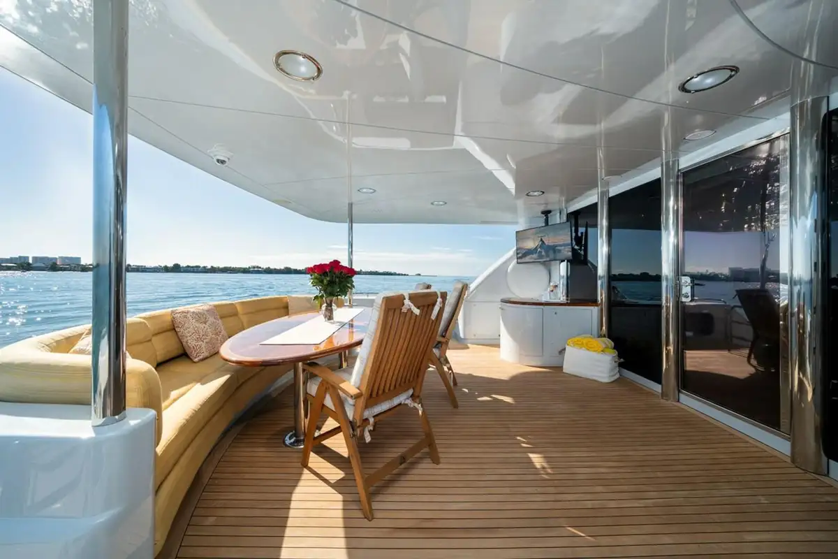 Her main deck aft features a high-gloss wood top table with an upholstered settee and teak chairs to accommodate ten guests. Her sun deck features a new (2022) jacuzzi, a BBQ, and teak chairs. For guests who enjoy sunbathing, her foredeck offers large sun pads with views overlooking the bow