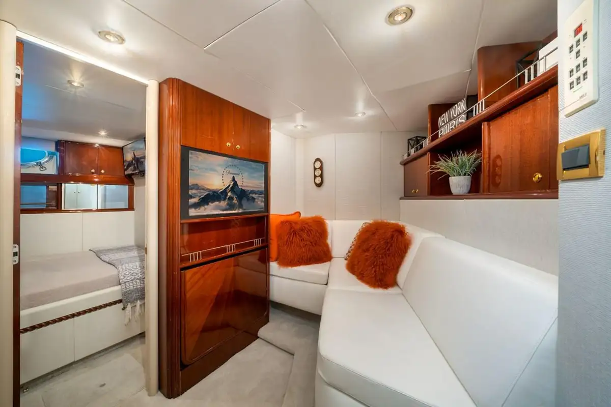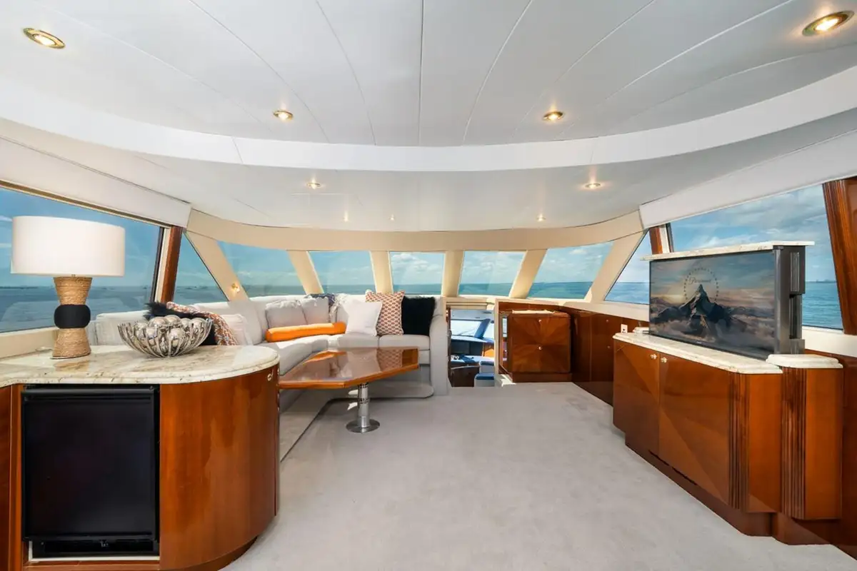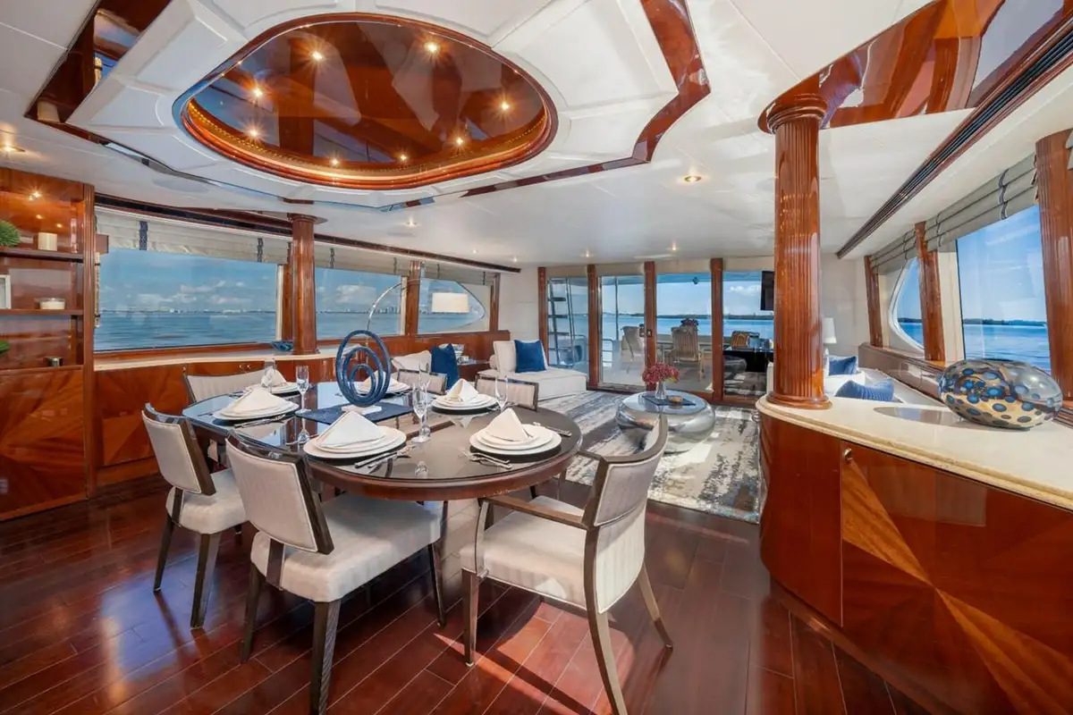 Her interior features a bright and spacious main salon lounge with a large sofa and lounge chairs. Forward of the main salon is the formal dining area with a circular table with seating for six guests. The galley is country-kitchen style with a cozy breakfast nook