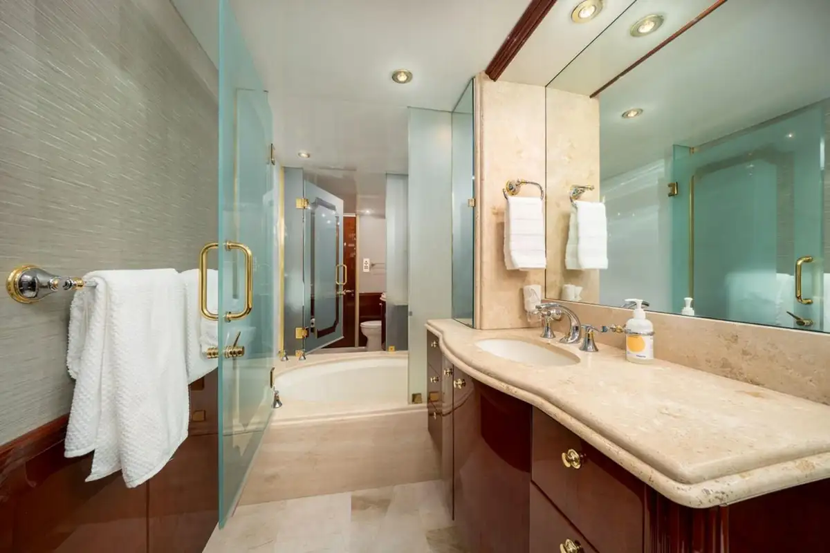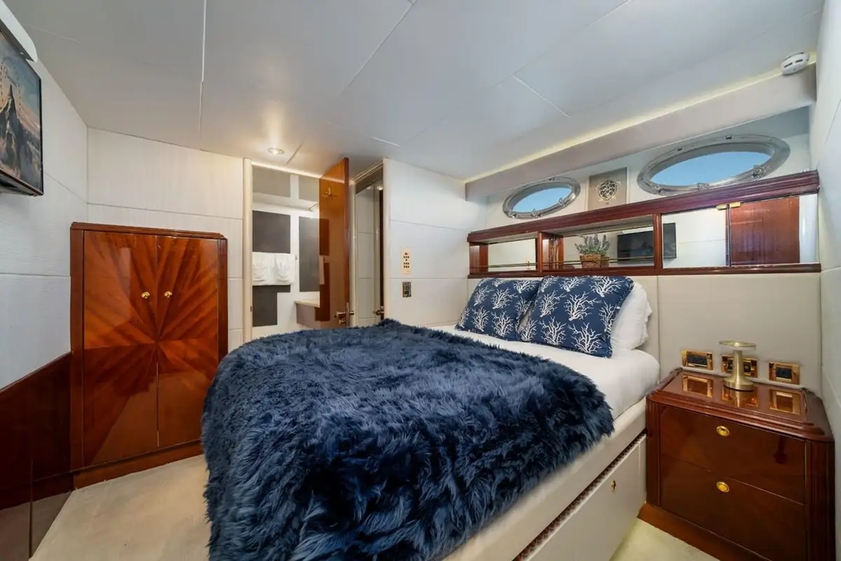 TRYST is configured to host eight guests in four cabins. Her master cabin features a king size berth, built-in vanity, two walk-in closets, a large reclining chair, and a his and her en suite bathroom with both a shower and a bathtub. Her guests will find comfort in her three double cabins including a VIP cabin. The separate crew quarters can accommodate four crewmembers