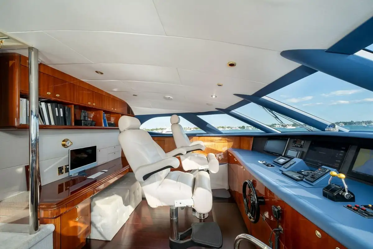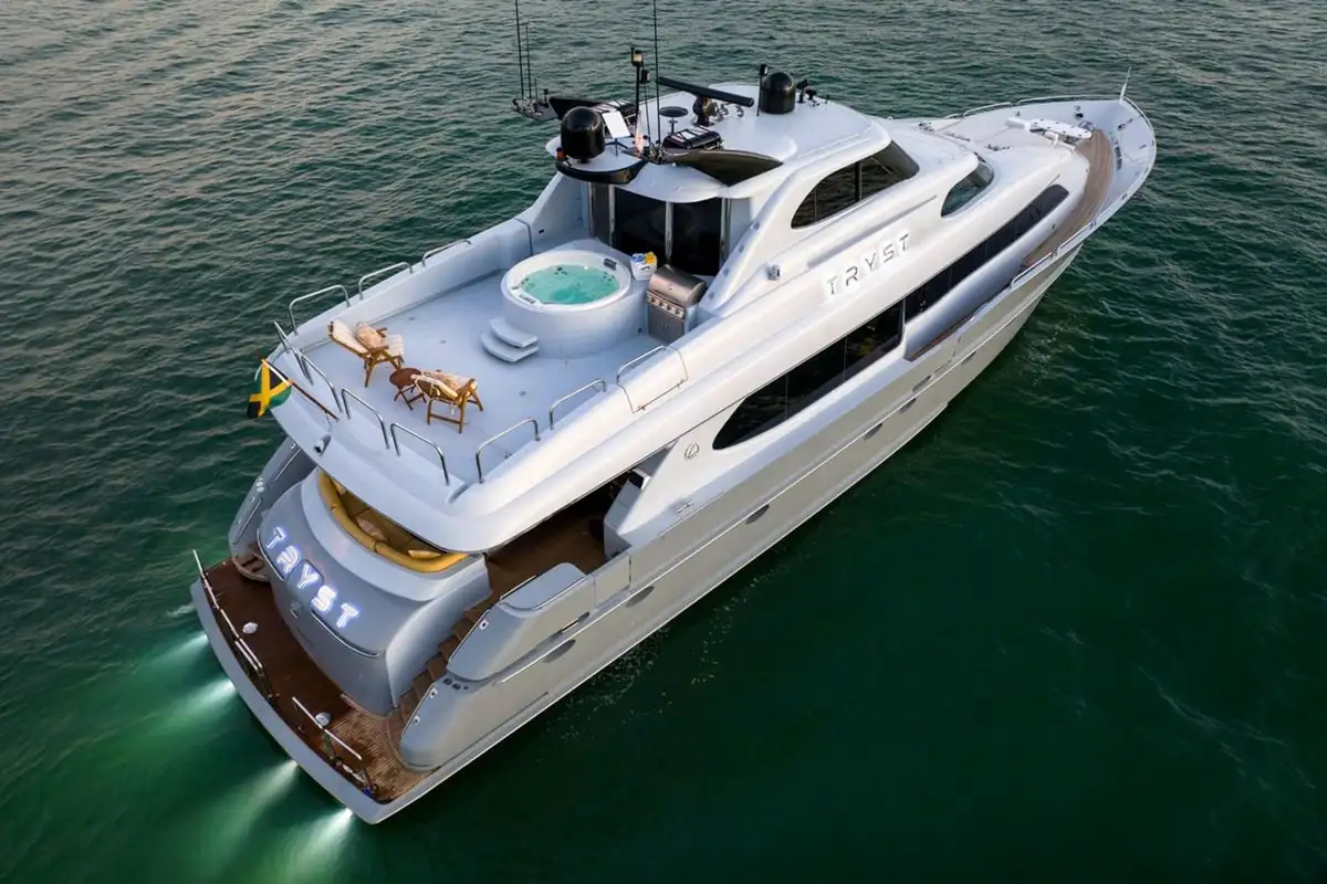 TRYST is a 29 meter (94ft) raised pilothouse motor yacht. She was built in fiberglass by Lazzara in 2002 with a major refit completed in 2022. Her refit consisted of new paint, updated modern galley with new appliances, and a jacuzzi added to the sun deck