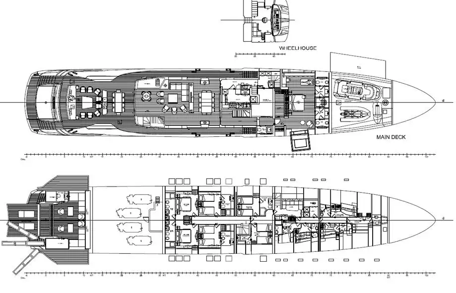 Her interior is configured to host 12 guests in six cabins. Her full beam master cabin is located on the main deck and features a starboard hydraulic balcony, lounge chairs, walk-in wardrobe, and a large en suite bathroom. Guests will find comfort in her two VIP cabins and two twin cabins, each with an en suite bathroom. There is one additional twin cabin for staff. The separate crew quarters can accommodate nine crewmembers