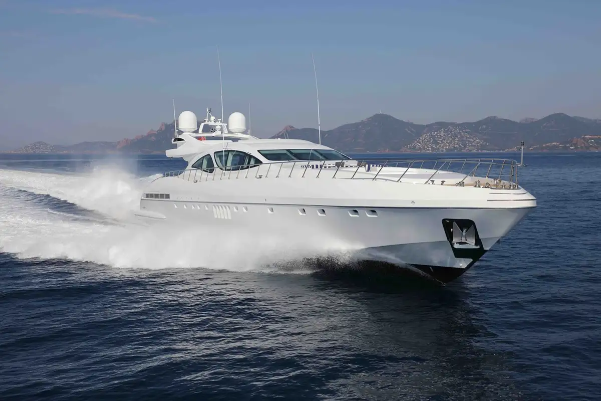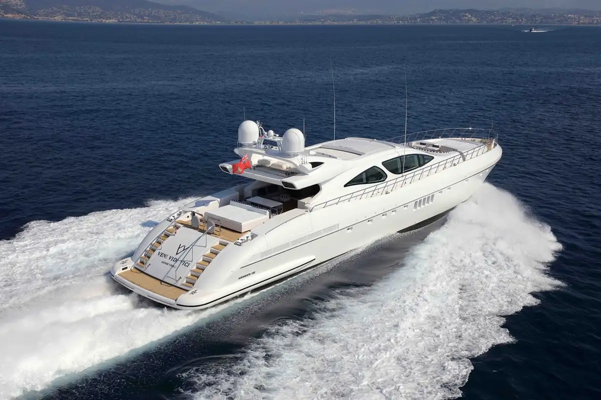 Delivered in 2006 and recently refitted, the 39.6m (130ft) VENI VIDI VICI is arguably one of the finest planing yacht models on the market. Built and designed in house by Overmarine in collaboration with Stefano Righini as one of their Mangusta 130 models, her sleek and sporty lines are complemented by an updated ‘beach house’ interior design by Maxine Tissenbaum. A fast performance yacht, she comfortably island hops at 28 knots and reaches an impressive speed of 32 knots powered by twin 3,700 MTU diesel engines.