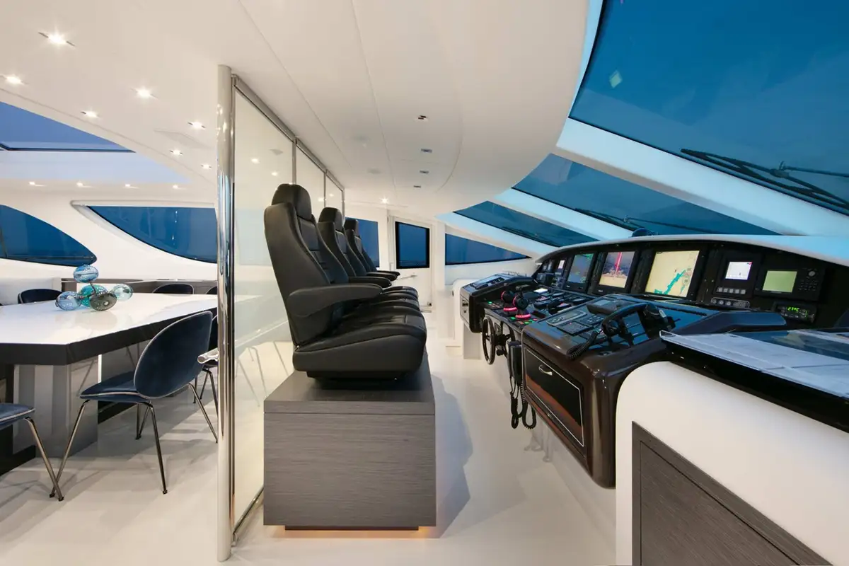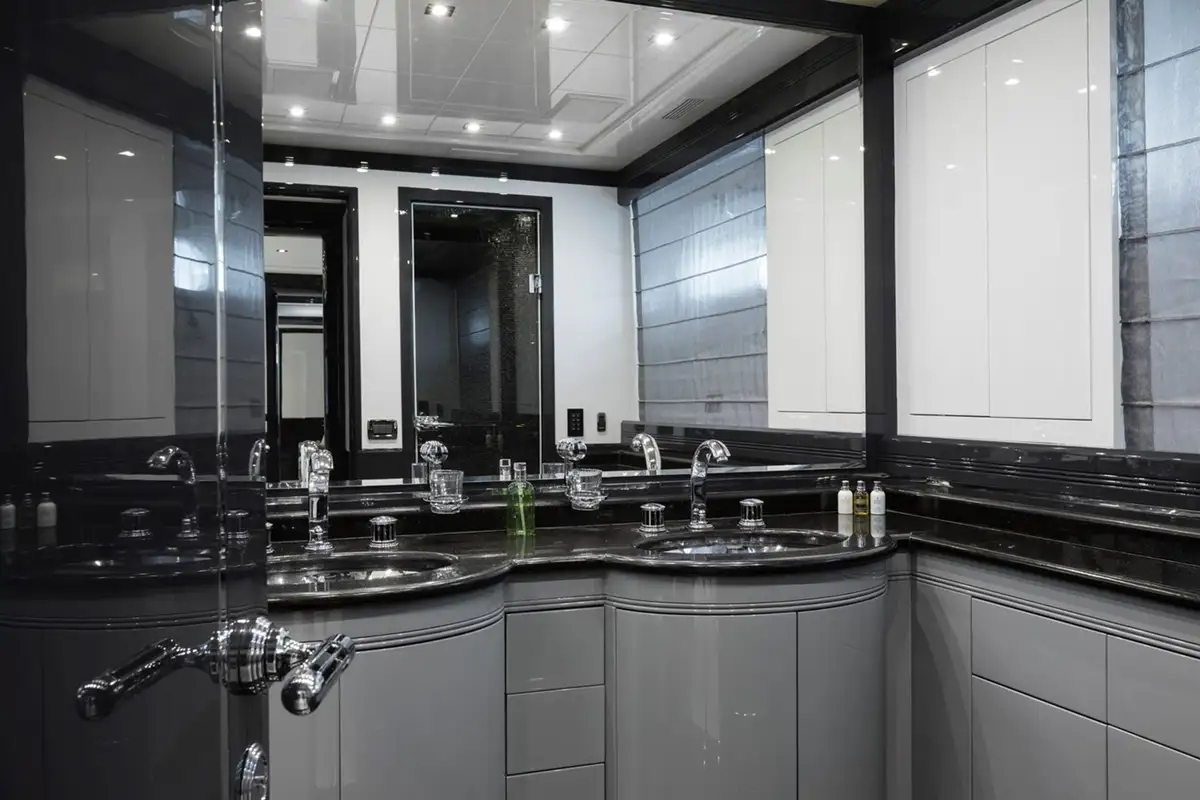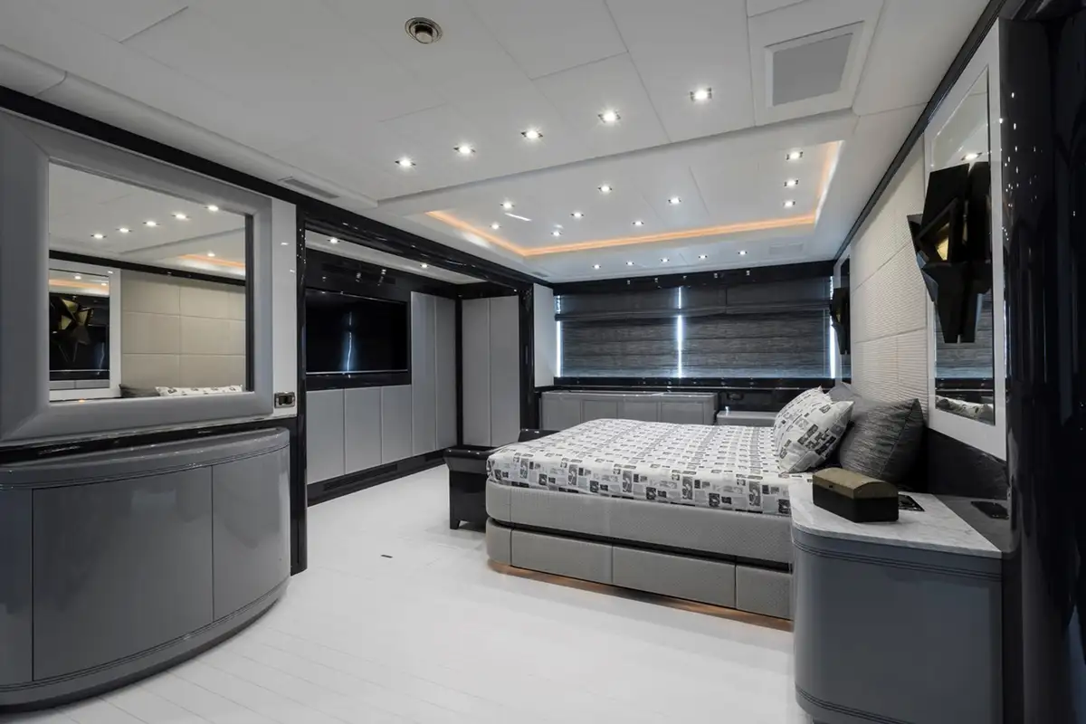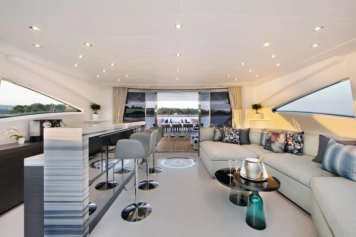 On deck there are plenty of spaces for sunbathing, entertaining and relaxing. The foredeck has large sunpads and a sunken dining area with fixed seating, allowing for absolute privacy while in port. The main deck aft has more sunning areas and a table for al fresco dining. Stairs lead down either side of the main deck to the expanded swim platform below, allowing guests to access the yacht’s water toys with ease.