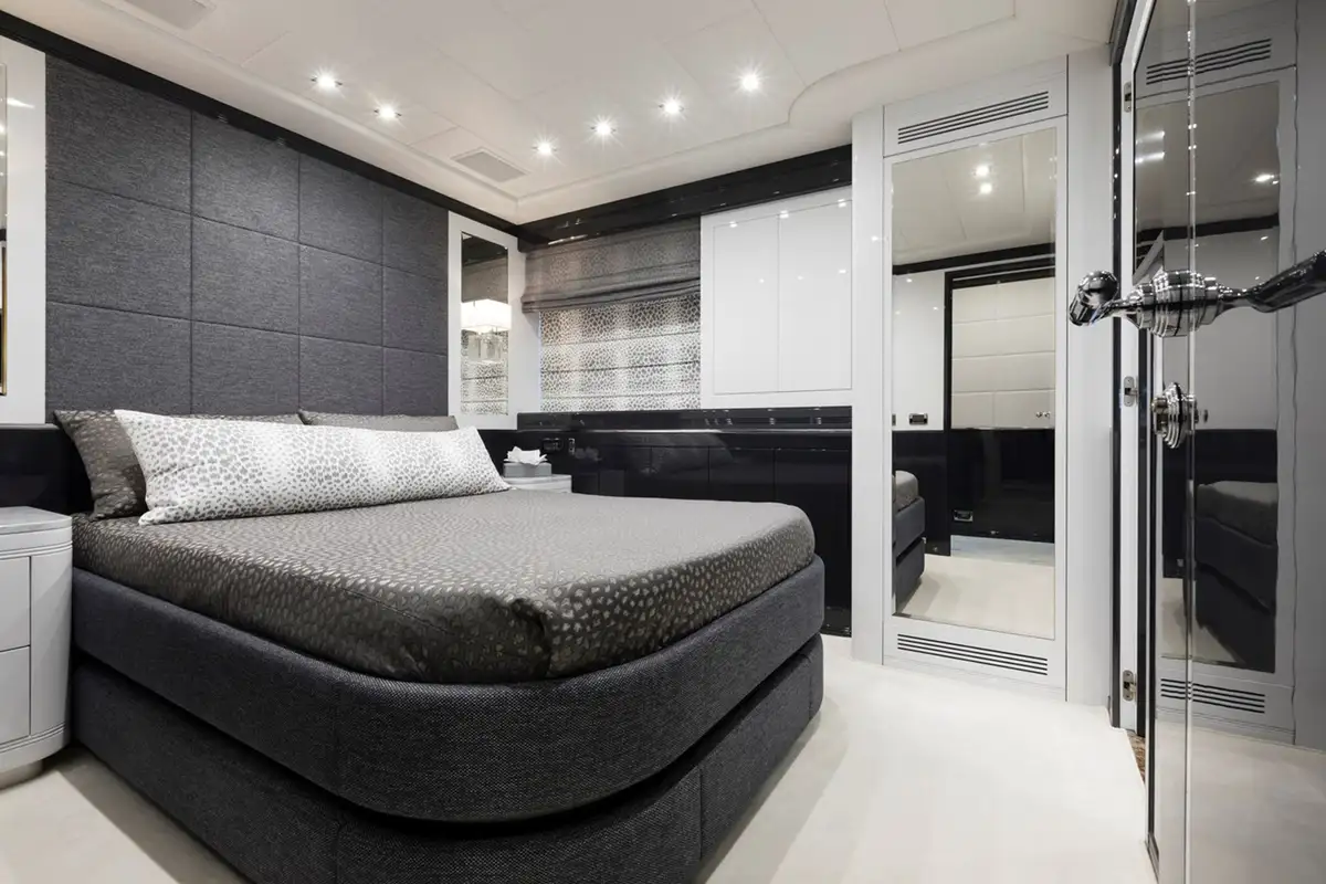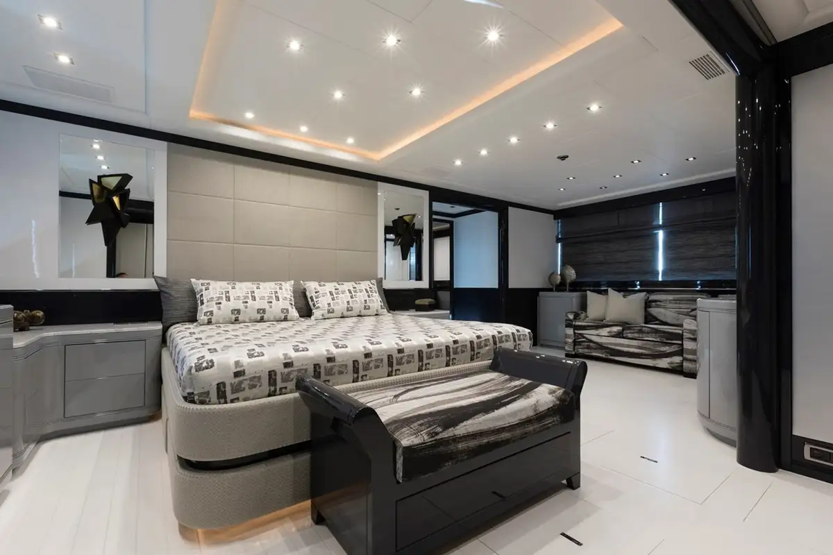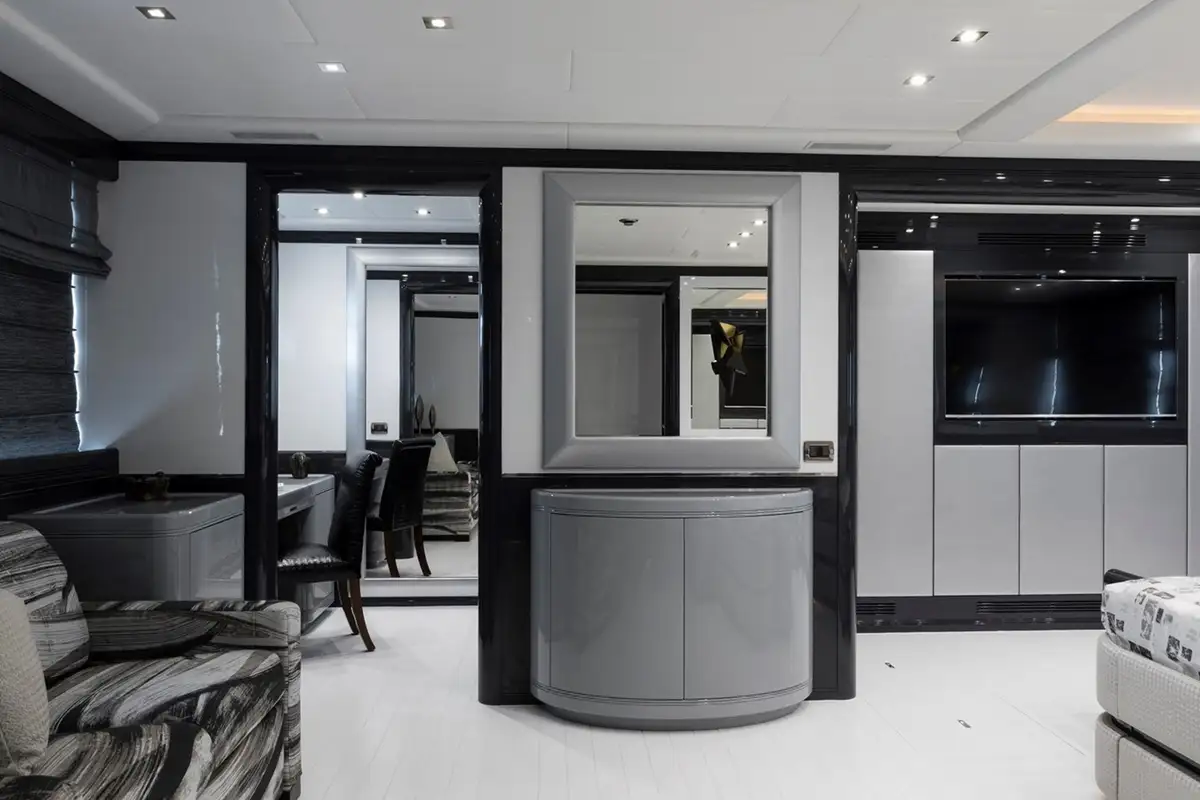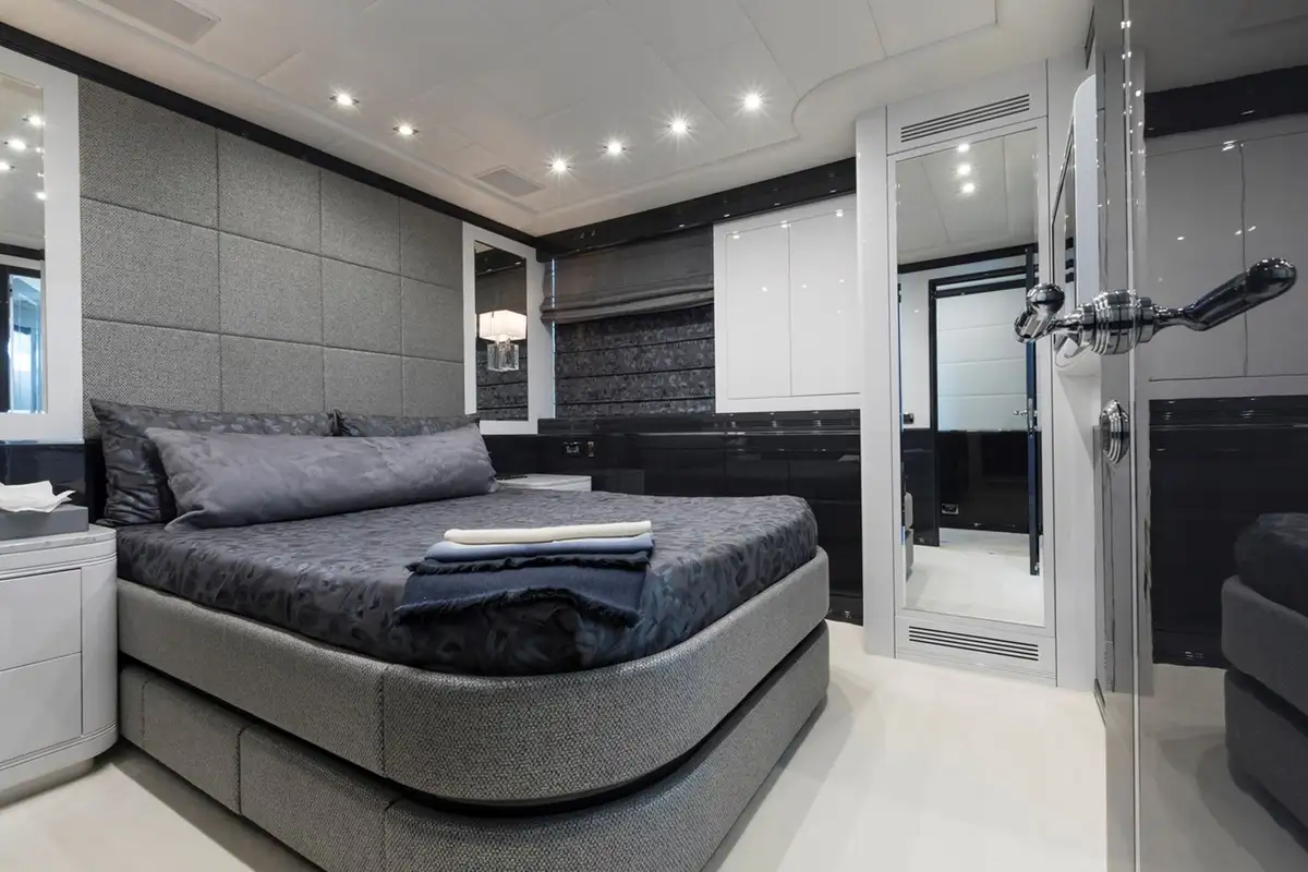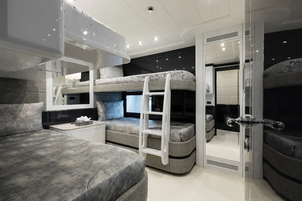 On deck there are plenty of spaces for sunbathing, entertaining and relaxing. The foredeck has large sunpads and a sunken dining area with fixed seating, allowing for absolute privacy while in port. The main deck aft has more sunning areas and a table for al fresco dining. Stairs lead down either side of the main deck to the expanded swim platform below, allowing guests to access the yacht’s water toys with ease.