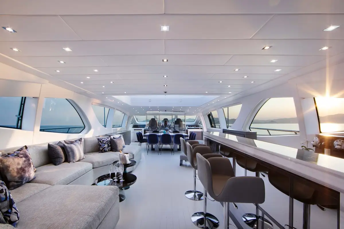 Following an extensive refit in 2019, VENI VIDI VICI now has an immaculate interior with new flooring and furniture. Decorated throughout in a light colour palette with hues of blues and complementary coloured soft furnishings, the style is both chic and contemporary. Key features include a large retractable roof that allows light to flood the spacious, open plan main saloon lounge area and bar. Located forward of the saloon is an elegant dining area, separated from the bridge by glass panelling allowing for an unspoiled view directly through the entire deck. Accommodation for up to 12 guests includes a full beam owner's suite midship, three double cabins and a twin cabin with bunk bed and additional pullman berth. Additionally, there are three cabins for up to six crew.