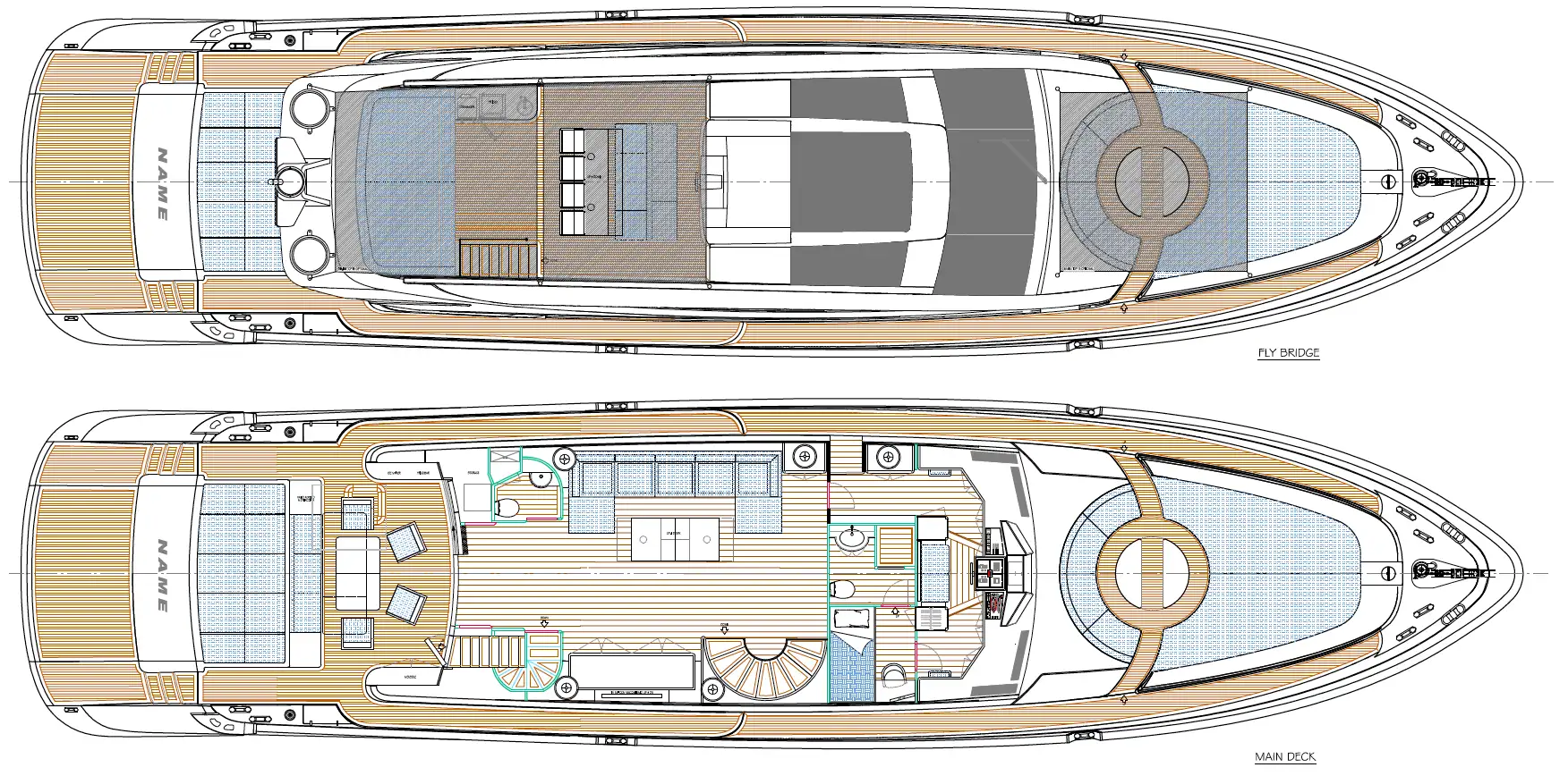 The spacious main deck lounge features a large sofa with a light-shade fabric and an internal dining table. The flexible flybridge has an outdoor table and a large sunbathing area, with a Bimini hardtop provided throughout the flybridge so that guests can relax and enjoy the shade or the sun. On the main deck aft, there is a dining and seating area with a folding television, a barbecue, a fridge and a large sunbathing area. On the foredeck, there is a large sunbathing area with a wide round sofa that can comfortably seat up to 14 people.