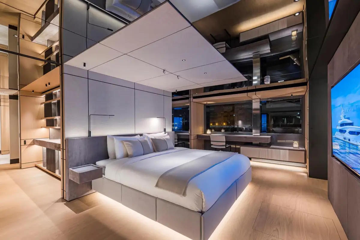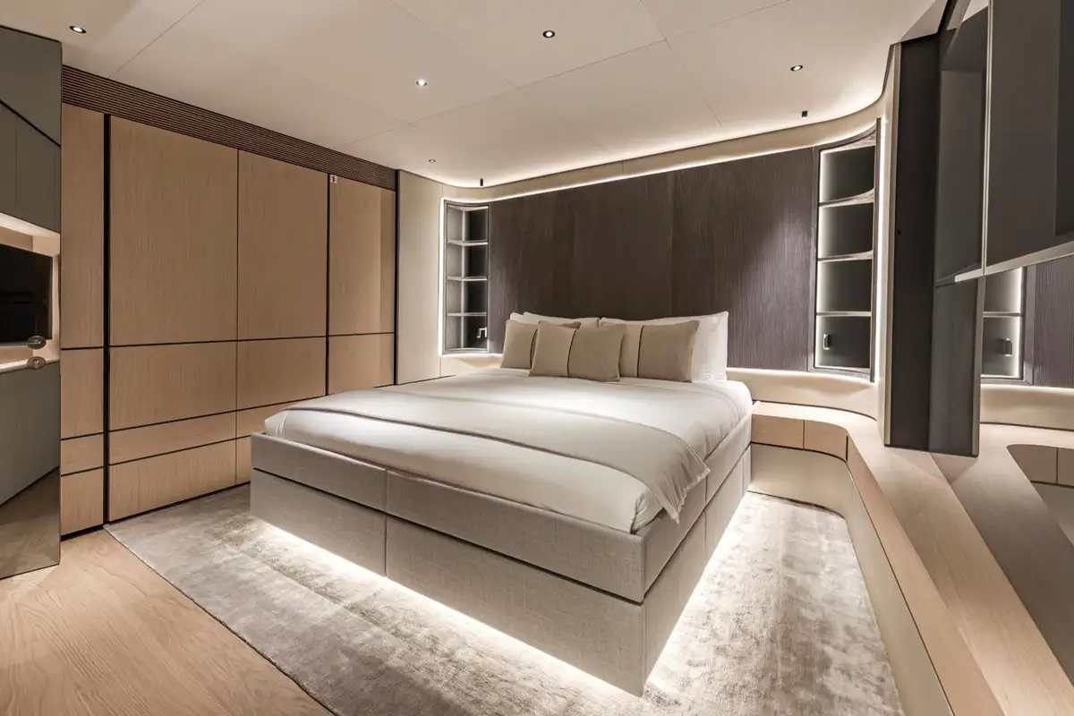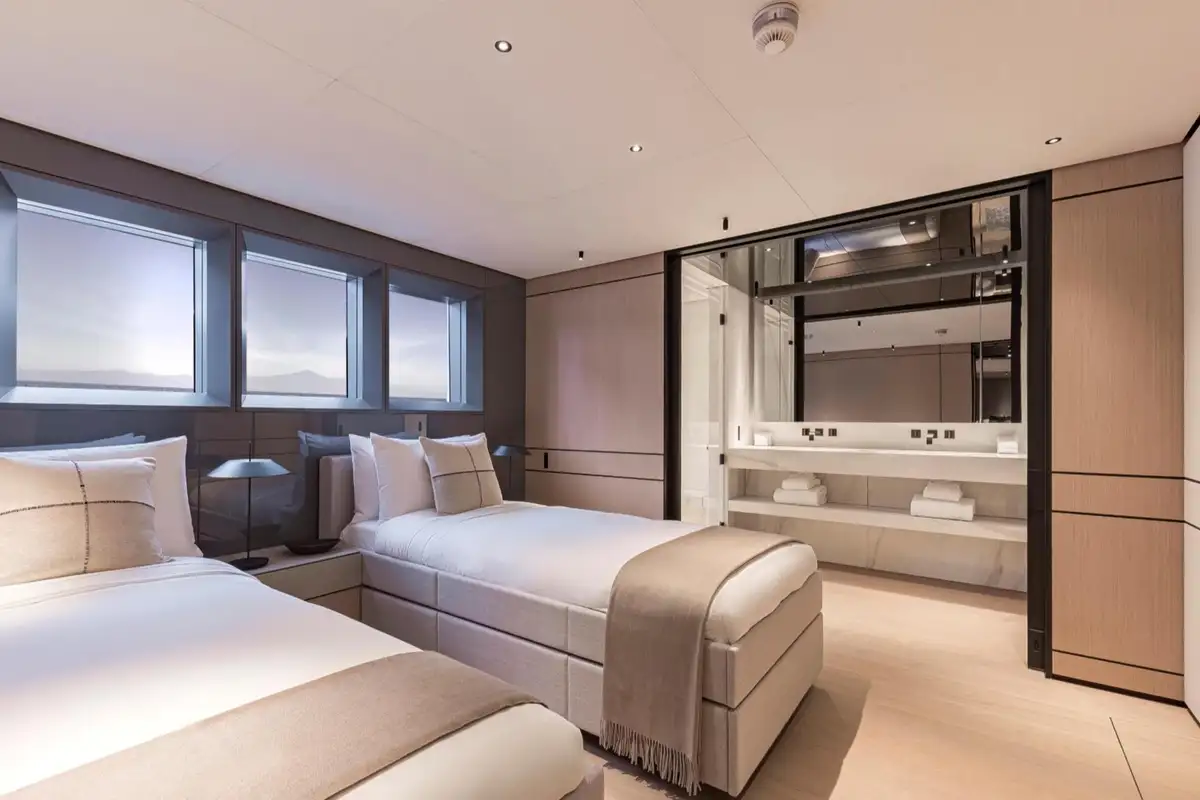 The full-beam master cabin gives a similar impression of ample open space. Up front of the main deck, with a king-size bed facing forward and huge plate glass windows, it’s a room with a splendid view. There’s a study desk and sofa, an anteroom with capacious wardrobes and a white marble en suite bathroom with a rain room shower. The other guest cabins include two VIP doubles and adaptable twin-bed cabins that convert into queen size doubles.