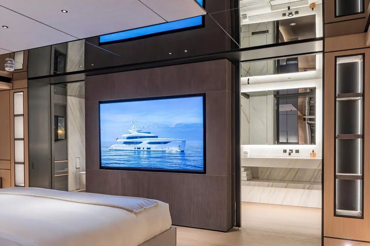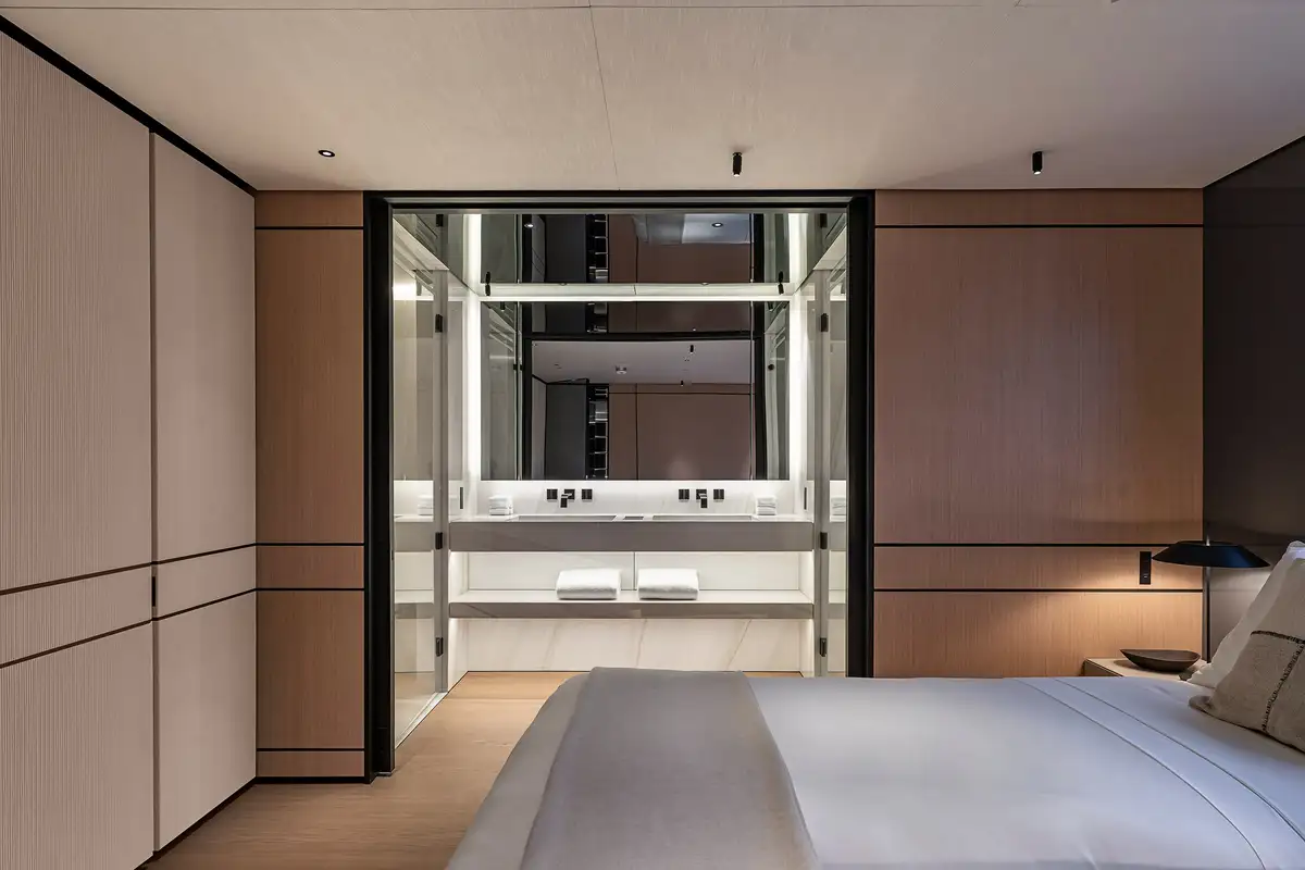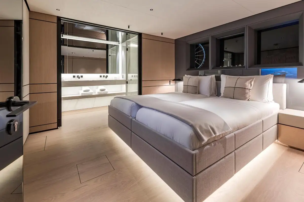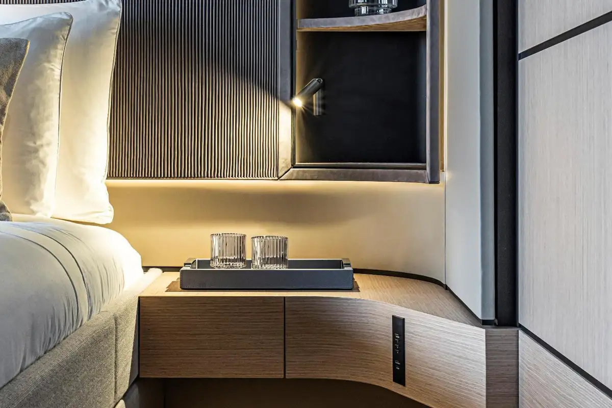 The full-beam master cabin gives a similar impression of ample open space. Up front of the main deck, with a king-size bed facing forward and huge plate glass windows, it’s a room with a splendid view. There’s a study desk and sofa, an anteroom with capacious wardrobes and a white marble en suite bathroom with a rain room shower. The other guest cabins include two VIP doubles and adaptable twin-bed cabins that convert into queen size doubles.