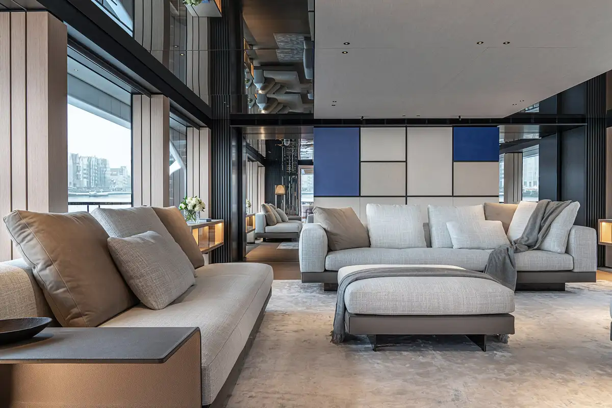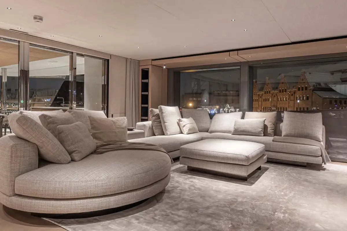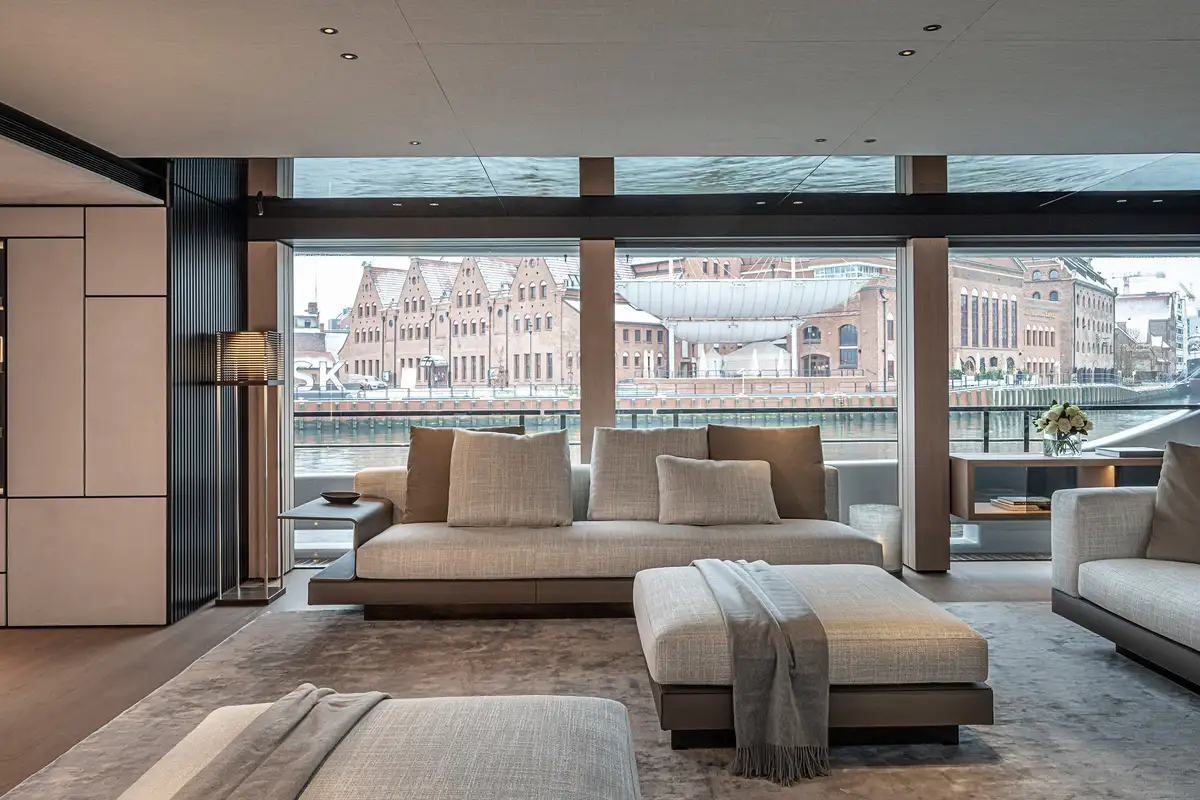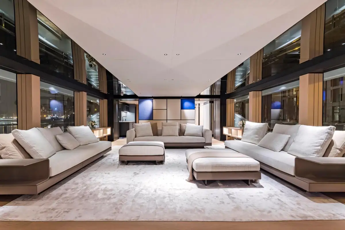 Step inside and that first impression is confirmed, thanks to M2 Atelier’s modern Italian design. The main deck lounge has the vibe of an exclusive urban loft – a large, inviting open space where the furniture seems to float above the floor, with floor-to-ceiling glass on three sides.