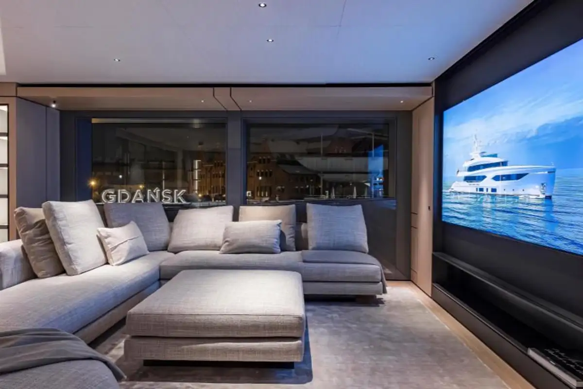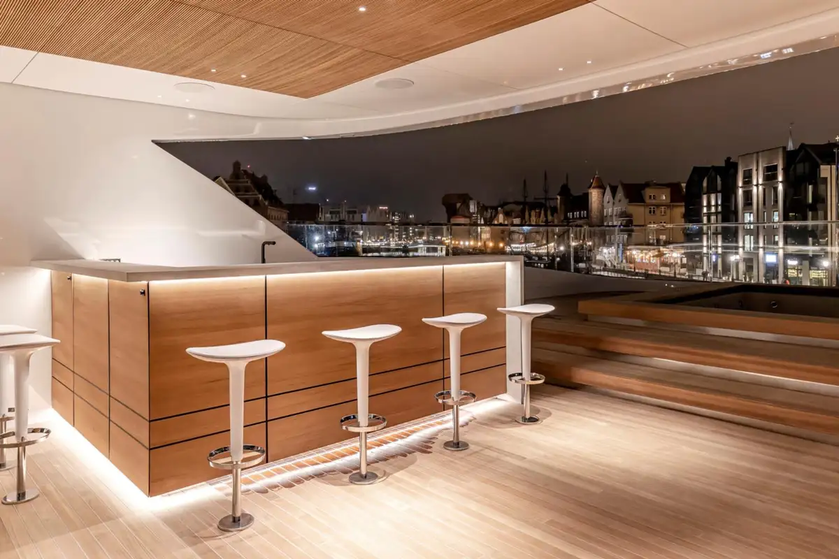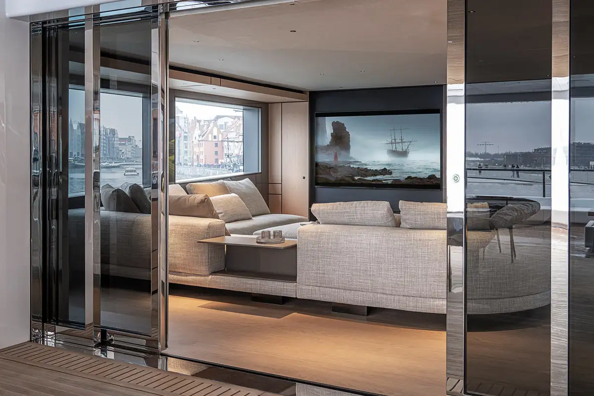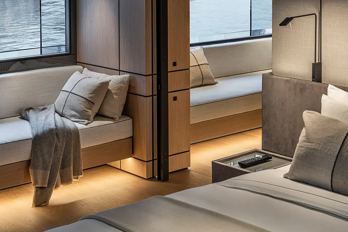 Step inside and that first impression is confirmed, thanks to M2 Atelier’s modern Italian design. The main deck lounge has the vibe of an exclusive urban loft – a large, inviting open space where the furniture seems to float above the floor, with floor-to-ceiling glass on three sides.