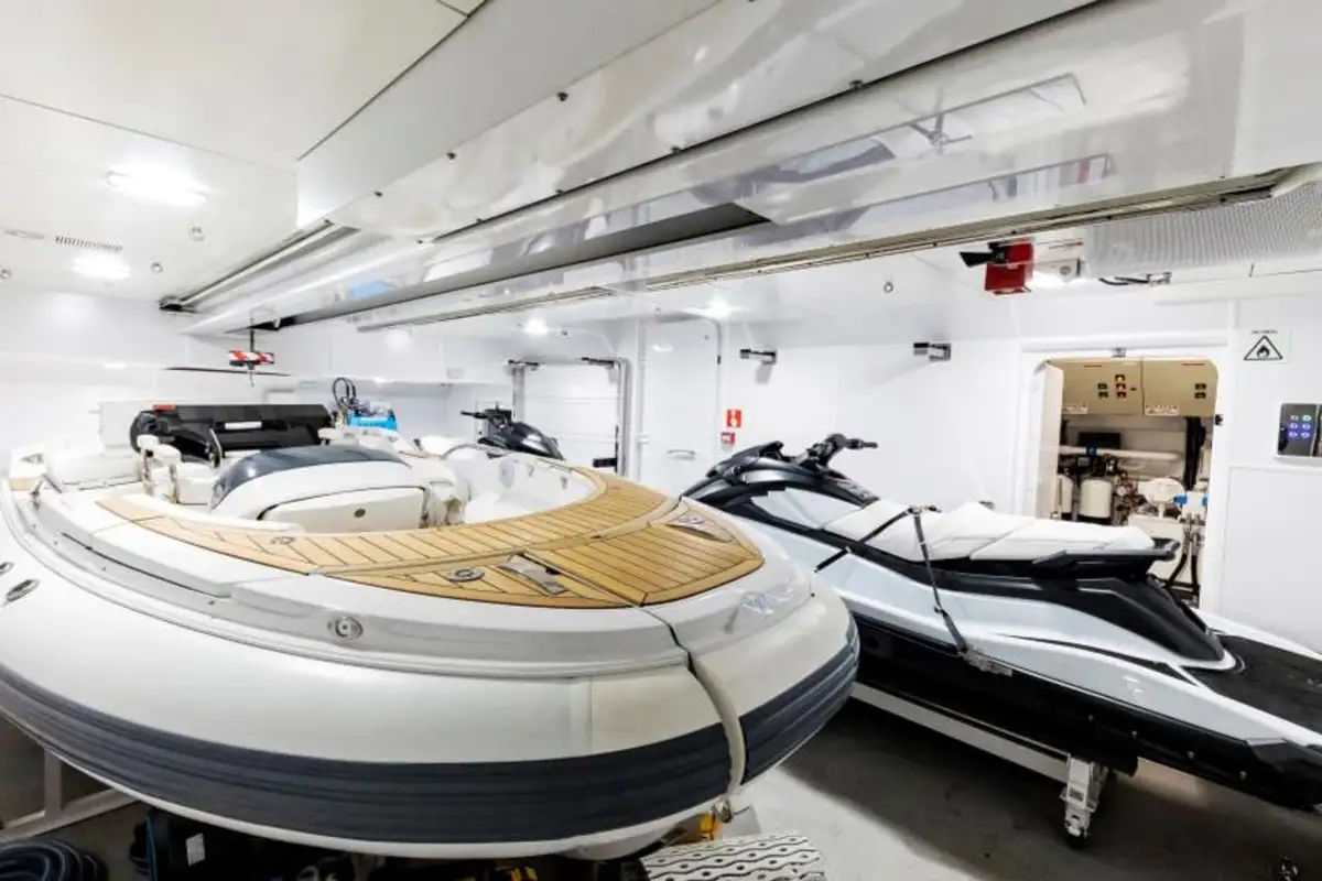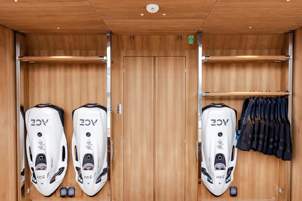 Watersports enthusiasts are very well catered for on board, and she’s an approved RYA training centre so you and your guests are in good hands, with ample opportunities to learn a wide range of new waterborne pursuits or improve your existing skills. There’s a 10-metre (34ft) chase tender for ultra-fast transfers to and from the shore, ideal for visiting beaches and small harbour towns. She carries a jet tender and a wide range of toys including SeaBobs, Jetsurf and E-foil boards, kitesurfing kit, wakeboards and waterskis, paddleboards and a sea pool for safe bathing.