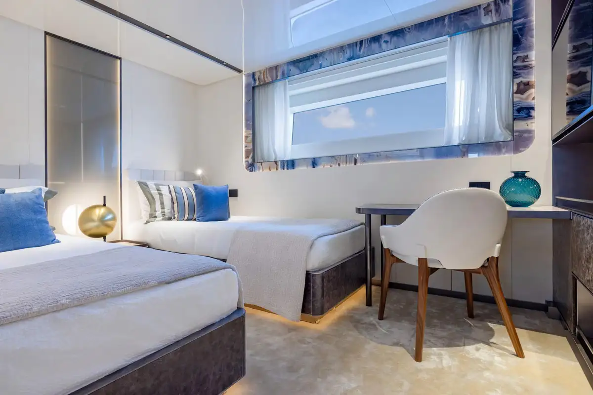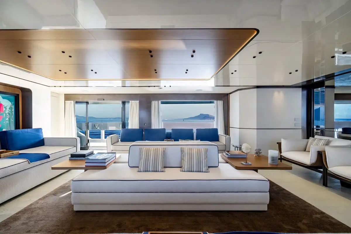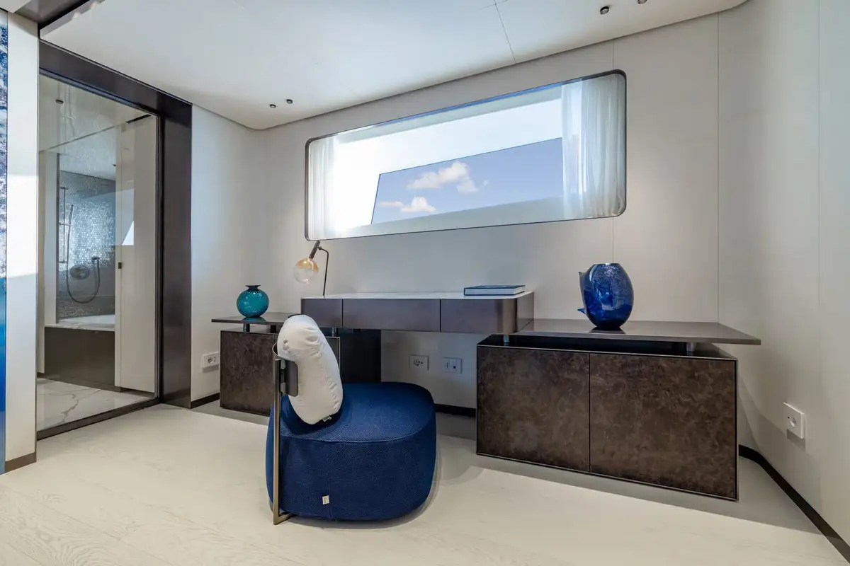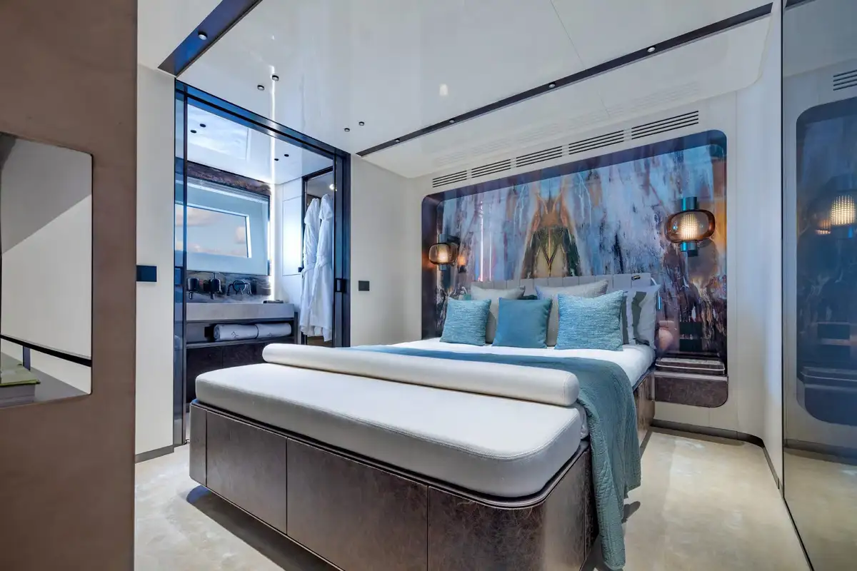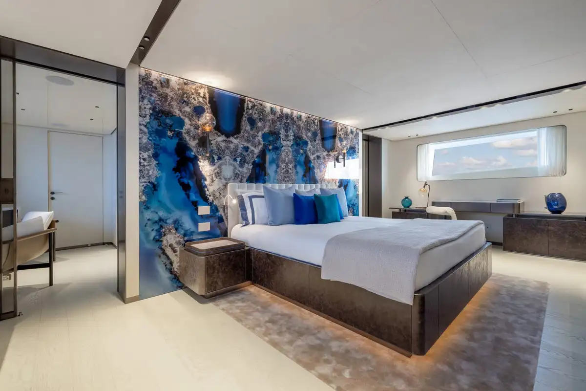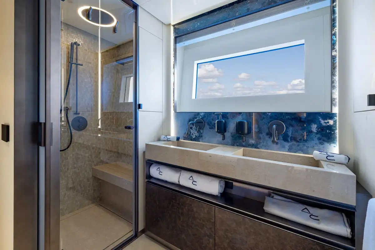 On board, ACQUA CHIARA welcomes up to 10 guests in five luxurious cabins, including a full-beam master suite on the main deck and four generous guest suites below, each dressed in rich fabrics and boasting bespoke décor. Her experienced crew of nine ensure discreet and attentive service, anticipating every request.