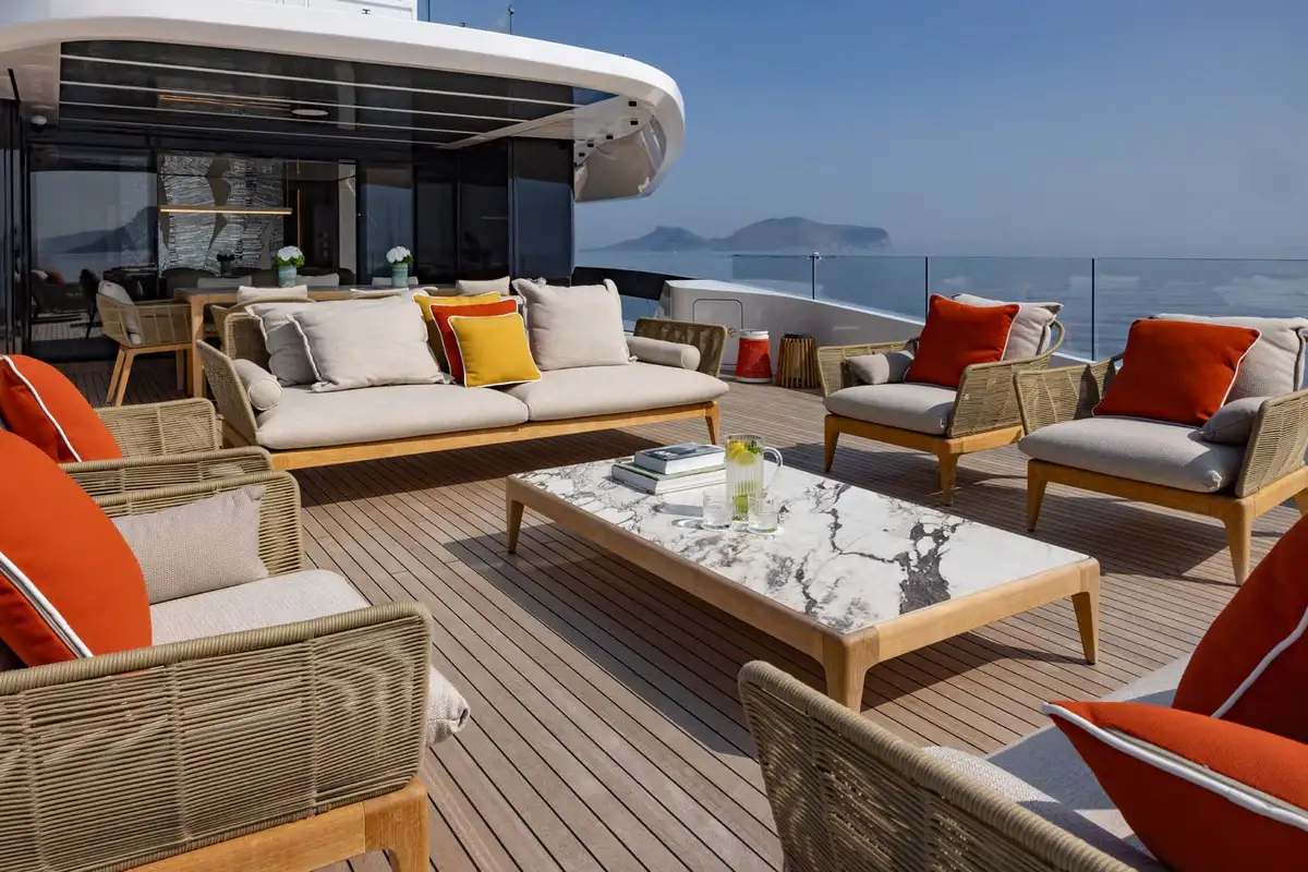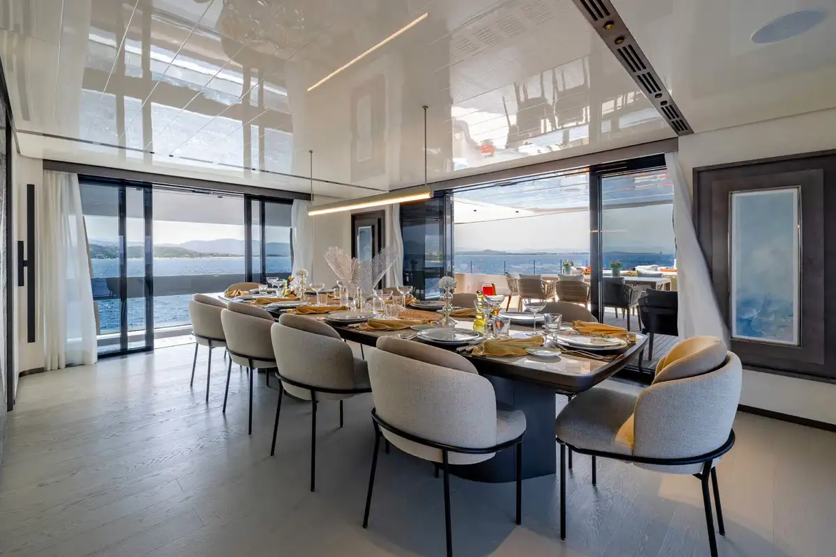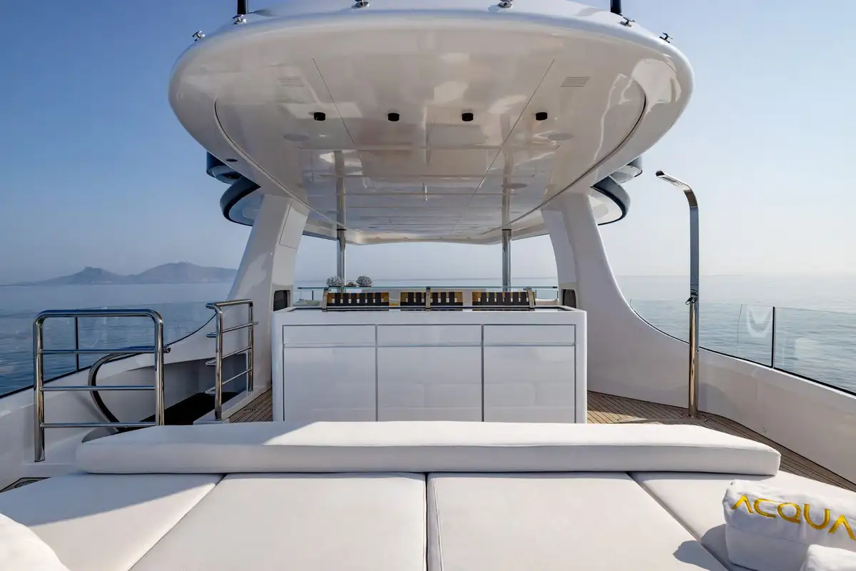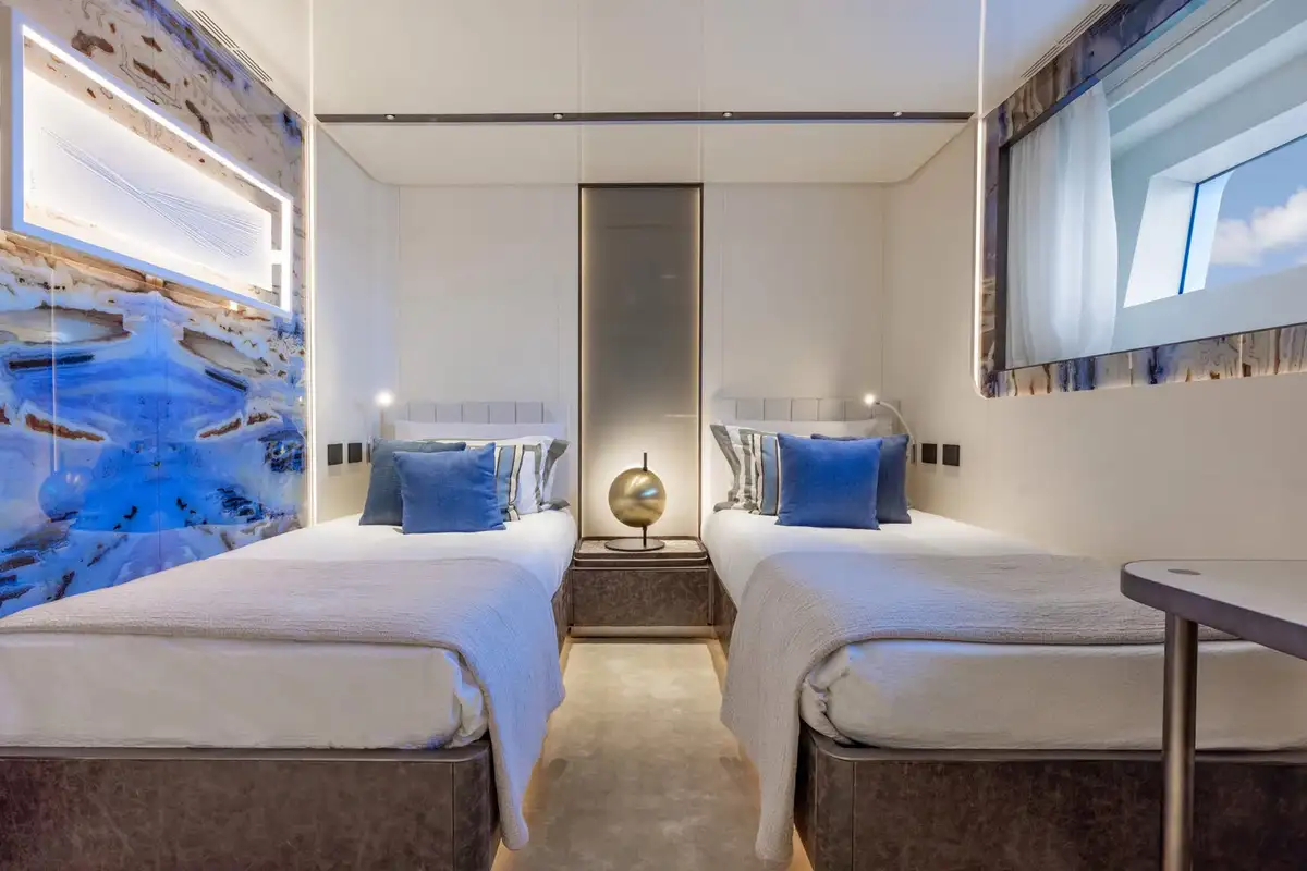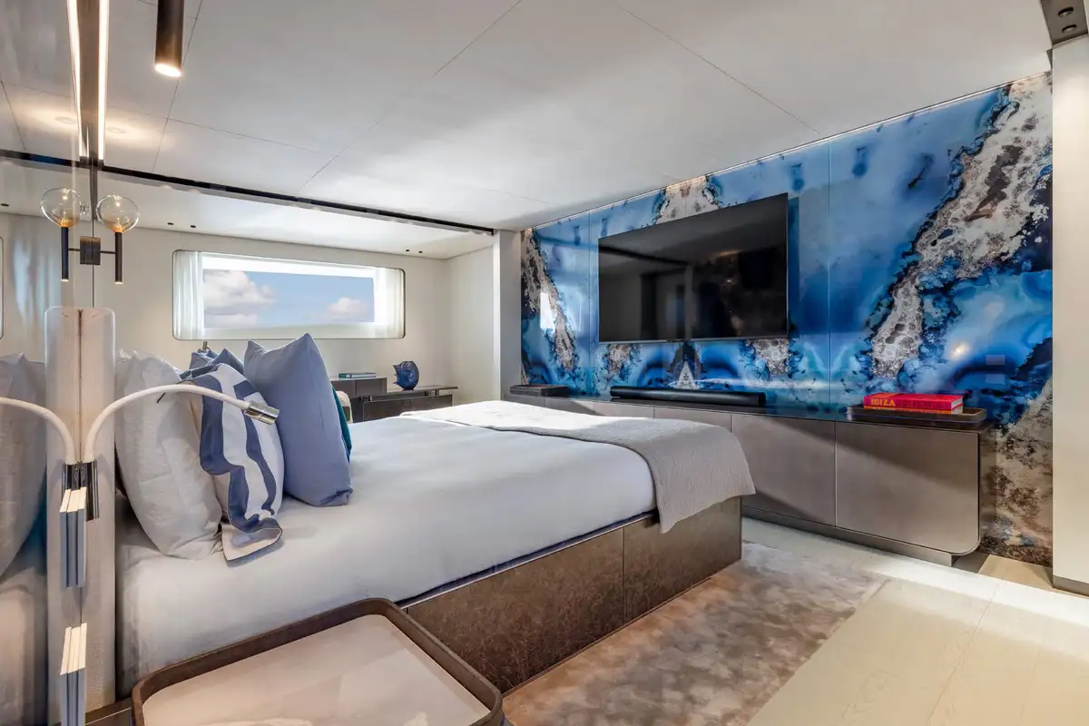 On board, ACQUA CHIARA welcomes up to 10 guests in five luxurious cabins, including a full-beam master suite on the main deck and four generous guest suites below, each dressed in rich fabrics and boasting bespoke décor. Her experienced crew of nine ensure discreet and attentive service, anticipating every request.