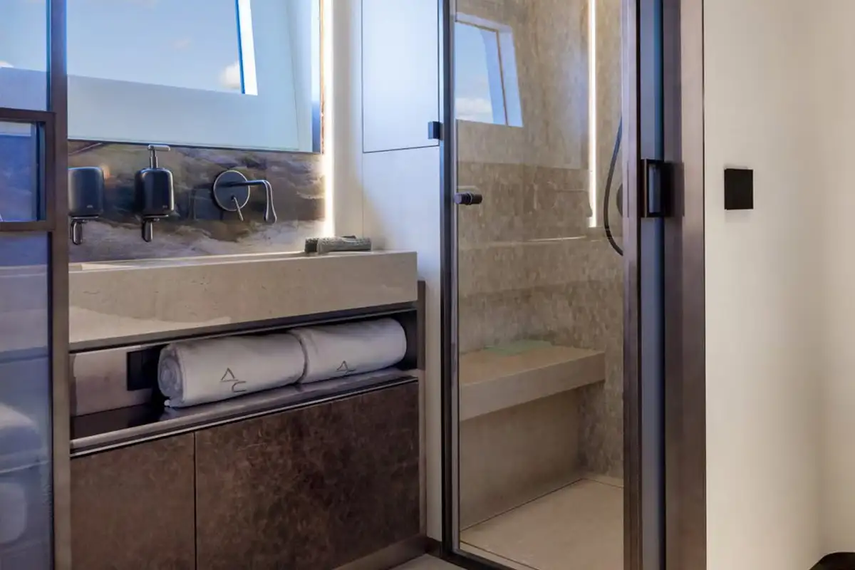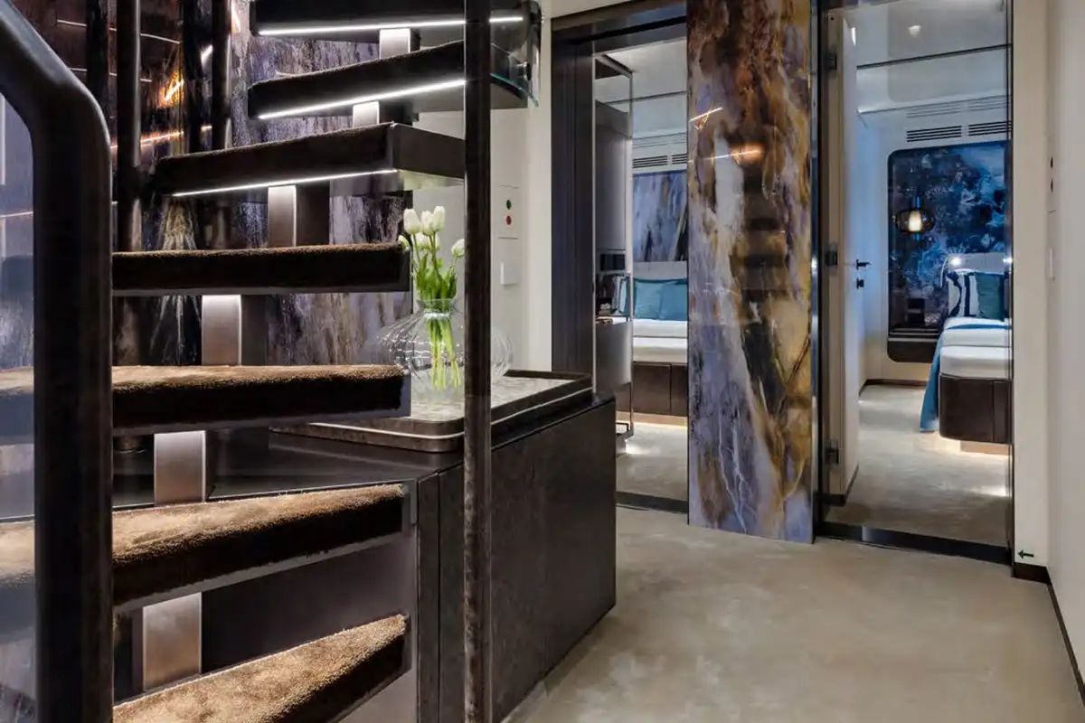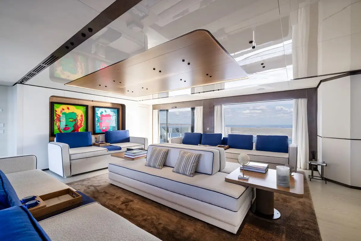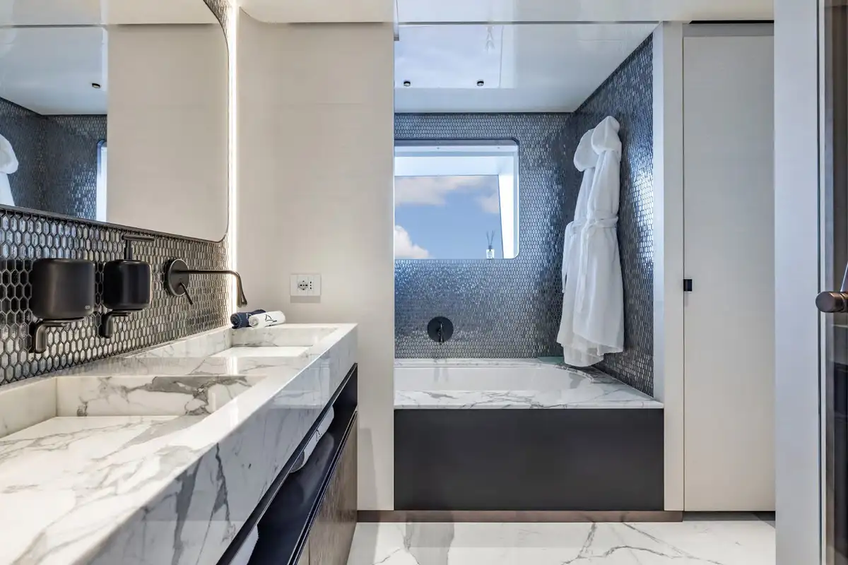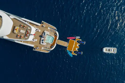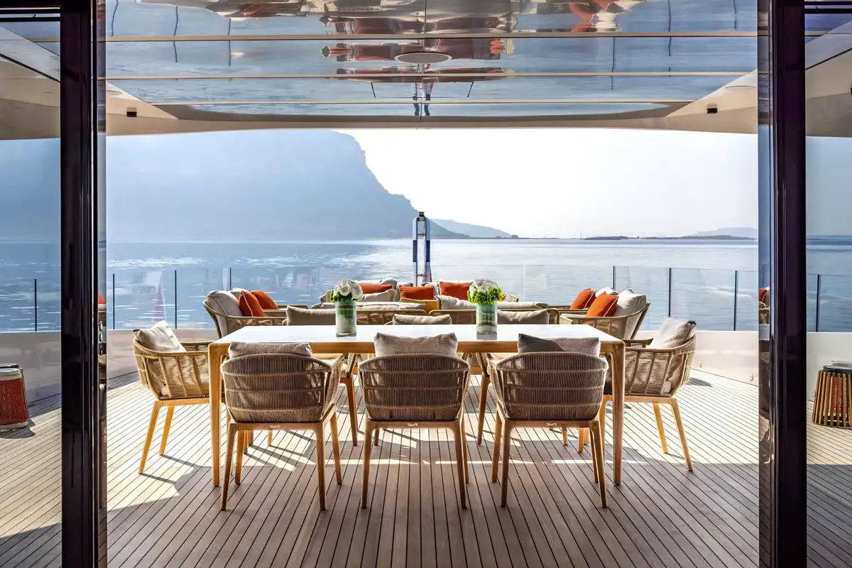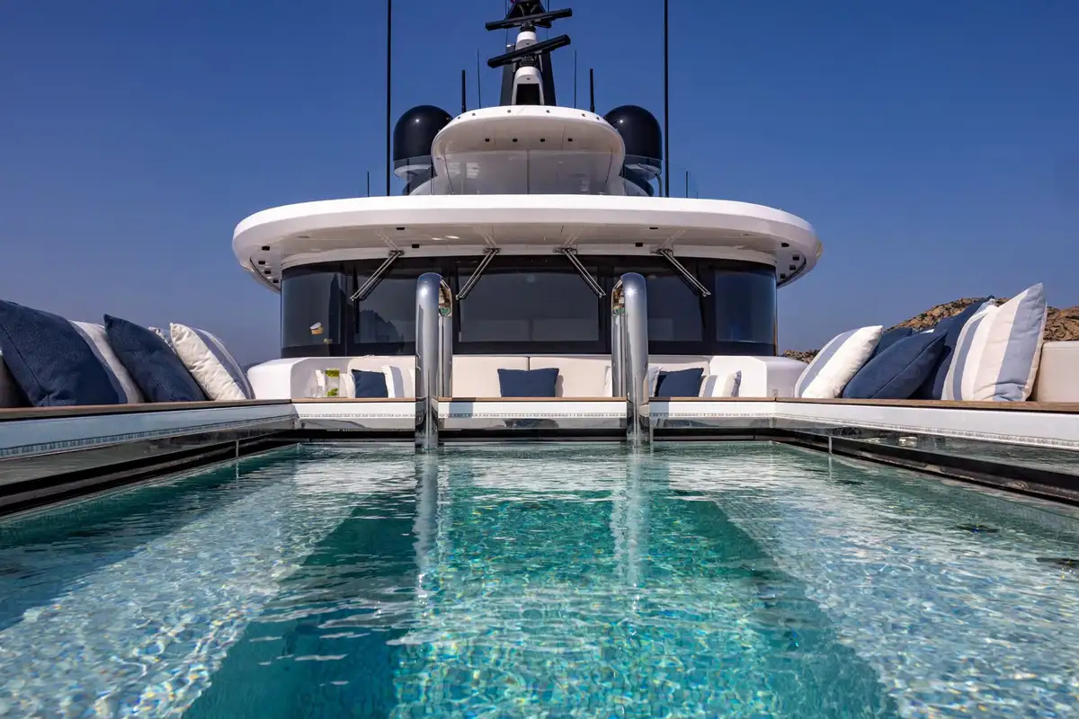 On board, ACQUA CHIARA welcomes up to 10 guests in five luxurious cabins, including a full-beam master suite on the main deck and four generous guest suites below, each dressed in rich fabrics and boasting bespoke décor. Her experienced crew of nine ensure discreet and attentive service, anticipating every request.