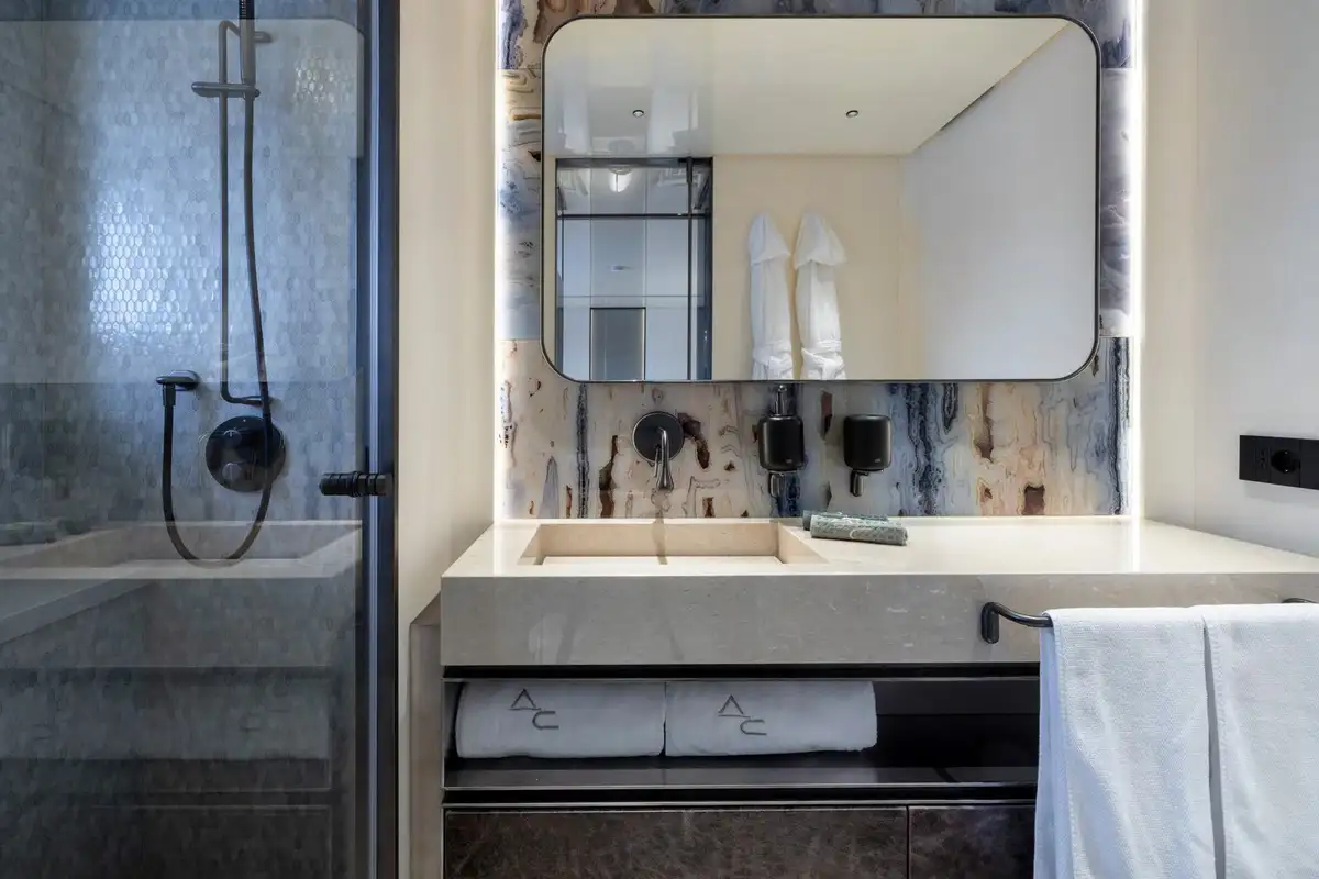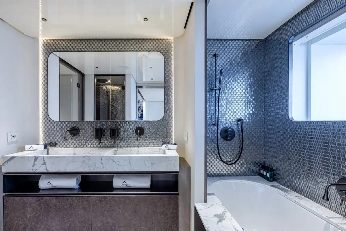 With award-winning design from Hot Lab, ACQUA CHIARA boasts sleek lines and panoramic glazing, with an effortless flow between indoor and outdoor spaces. The use of contrasting leather, white and dark marble, glass, and mosaic throughout creates a modern yet urban aesthetic.