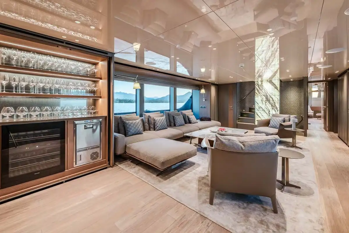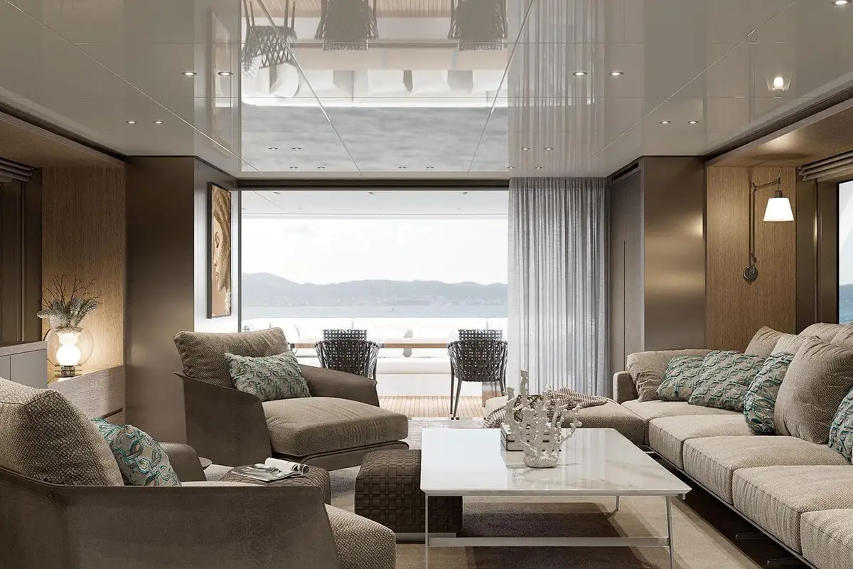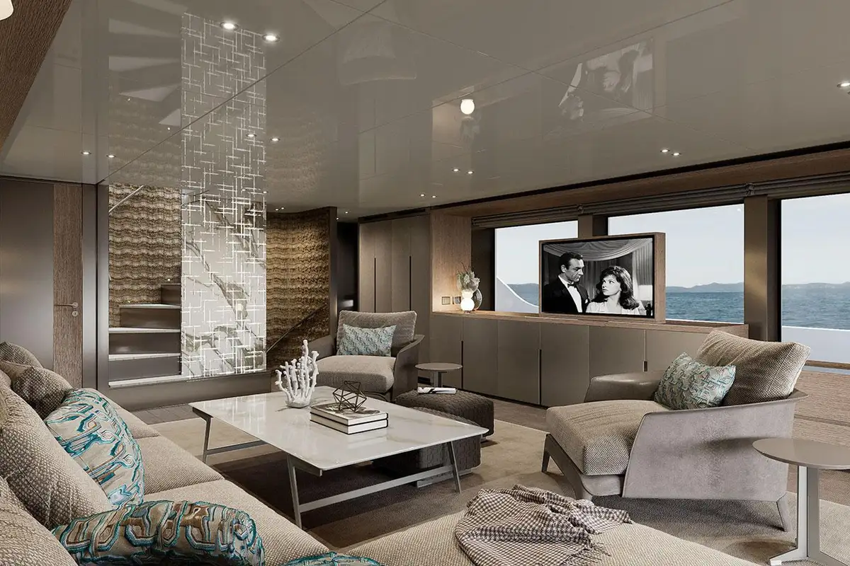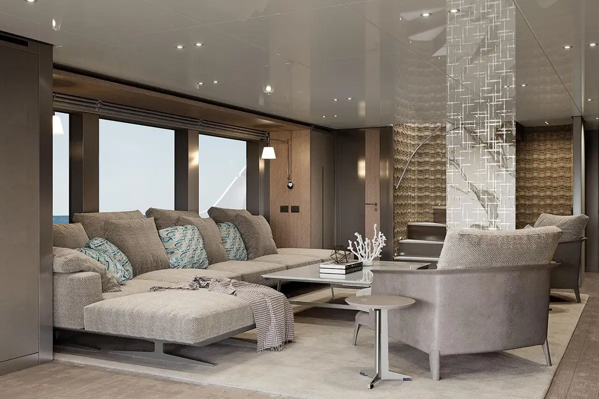 Her exterior styling is clean and modern but subtly informed by the classic lines and elegant silhouettes of 1930s ocean liners. The primary outside spaces are an open foredeck lounge, a snug and sociable main deck aft cockpit with ample elbow room and comfortable seating around a large table, and a spacious upper aft deck which seamlessly integrates with the sky lounge to create an expansive inside-outside living space when the full-beam glass doors between these two areas are swung open wide. There’s also a broad stern platform for boarding, bathing and watersports, with access via two flights of steps to ensure an easy flow to and from the main deck aft cockpit.