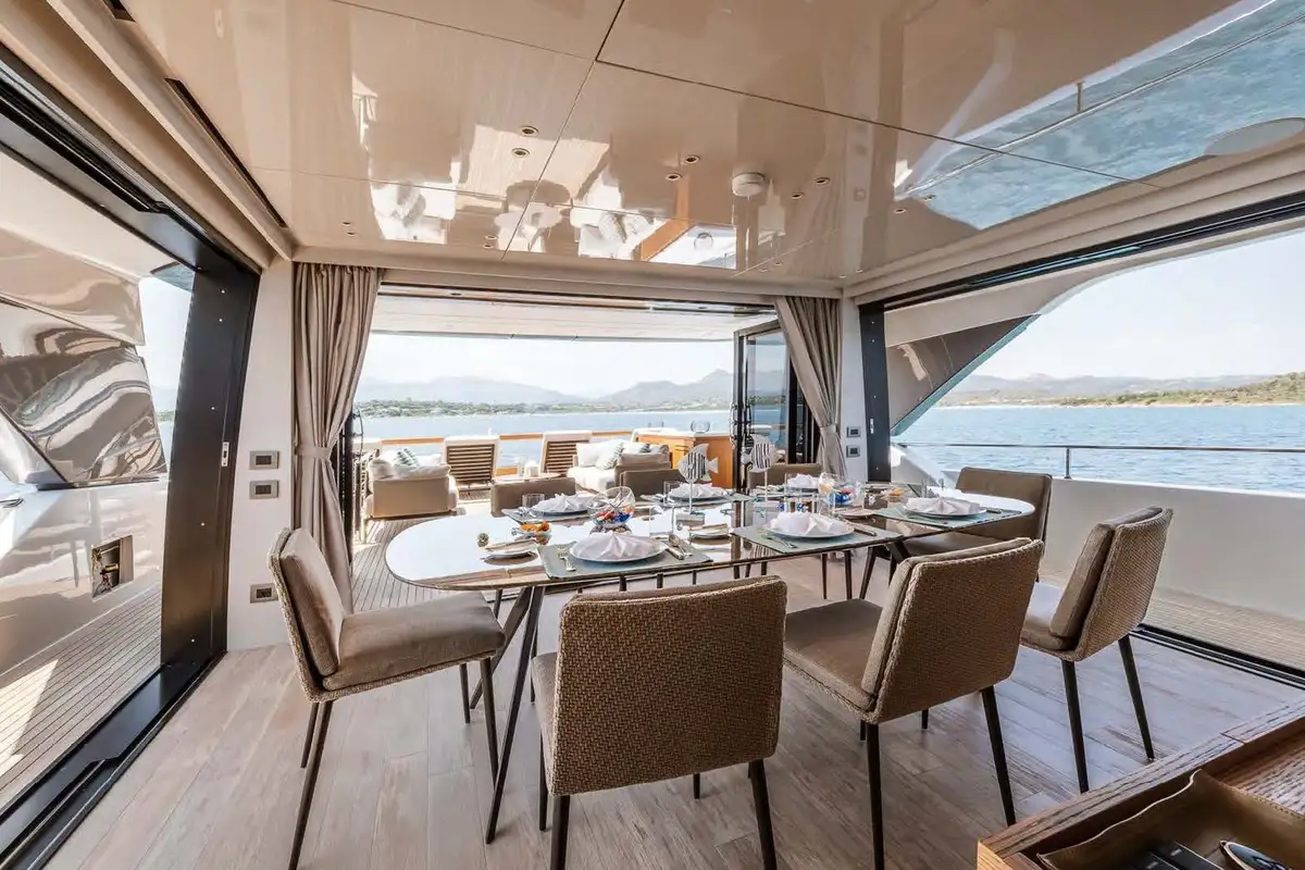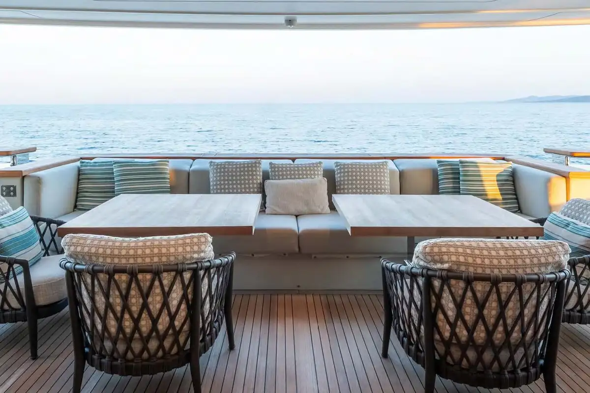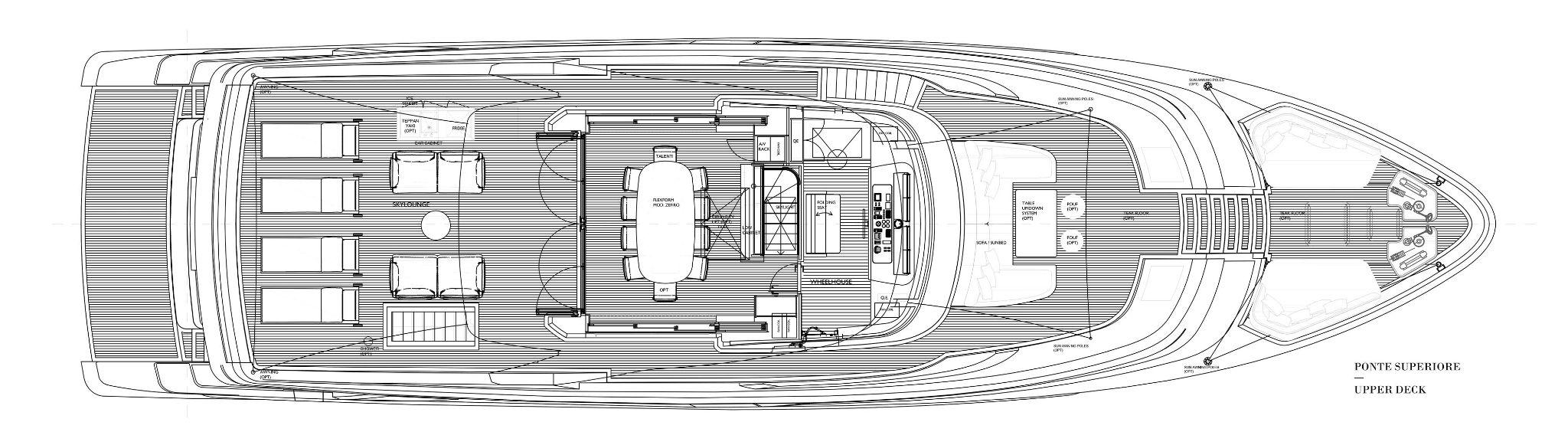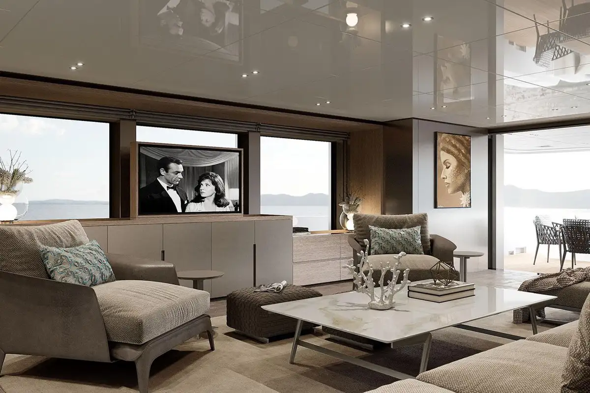 Her exterior styling is clean and modern but subtly informed by the classic lines and elegant silhouettes of 1930s ocean liners. The primary outside spaces are an open foredeck lounge, a snug and sociable main deck aft cockpit with ample elbow room and comfortable seating around a large table, and a spacious upper aft deck which seamlessly integrates with the sky lounge to create an expansive inside-outside living space when the full-beam glass doors between these two areas are swung open wide. There’s also a broad stern platform for boarding, bathing and watersports, with access via two flights of steps to ensure an easy flow to and from the main deck aft cockpit.